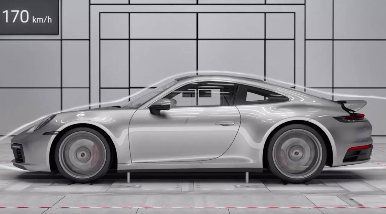 อากาศพลศาสตร์เป็นแนวทางที่ Porsche ให้ความสำคัญตลอดระยะเวลา 60 ปีของโมเดล 911 ในรถรุ่นใหม่รหัส 992 ตัวเลขค่าสัมประสิทธิ์แรงเสียดทานอากาศลดลงเหลือ 0.29 (cd 0.29) Adaptive Aerodynamics ประกอบไปด้วยสองส่วนหลักๆ คือบานพับที่ติดตั้งภายในช่องลมใต้กันชนหน้าทั้งด้านซ้ายและขวา ทำงานในลักษณะเดียวกันกับชัตเตอร์ของกล้องบันทึกภาพ ทำหน้าที่ปิด-เปิดช่องลมที่ส่งอากาศไประบายความร้อนให้กับหม้อน้ำและชุดคอยล์ร้อนของระบบปรับอากาศ นอกจากเปิดรับกระแสอากาศแล้วยังสามารถปิดเพิ่มลดแรงต้านของอากาศรวมไปถึงการสร้างแรงกดที่เพลาหน้า ส่วนที่สองเป็นวิงหลังใช้พื้นที่เท่ากับความกว้างของบั้นท้าย ออกแบบให้พับเก็บอย่างเรียบเนียนเป็นชิ้นเดียวกับส่วนท้ายของ 911/992 Carrera 4S โดยจะยกตัวขึ้นเมื่อรถเคลื่อนที่ด้วยความเร็วและองศาที่มีค่าแตกต่างกันและทำงานสัมพันธ์กับชัตเตอร์บริเวณกันชนหน้า