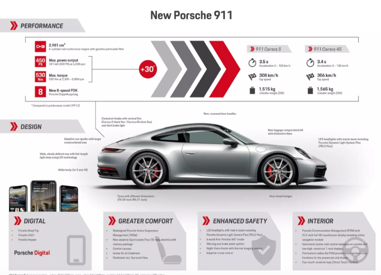 สปอร์ตหน้ากบระดับตำนานเจเนอเรชันที่ 8 รหัสตัวถัง 992 ท้าทายทุกข้อจำกัดของประสิทธิภาพในการยึดเกาะกับถนนด้วยระบบขับเคลื่อน 4 ล้อ 4WD ขุมพลังเครื่องยนต์สูบนอนแบบ 6 กระบอกสูบ เทอร์โบคู่ของ Porsche 911/992 มีกำลัง 450 แรงม้า (+30 แรงม้า) ที่ 6,000 รอบต่อนาที แรงบิดสูงสุด 530 นิวตันเมตร หรือ 53 กิโลกรัม/เมตร ที่ 2,300-5,000 รอบต่อนาที ระบบส่งกำลังใช้เกียร์ใหม่ PDK 8 สปีดออกแบบอัตราทดใหม่ให้เข้ากับคาแรกเตอร์ของเครื่องยนต์ โดยปรับจูนอัตราทดเกียร์ 8 ให้ช่วยลดรอบเครื่องยนต์เพื่อประหยัดเชื้อเพลิง ตัวเลขสมรรถนะ เร่งจาก 0-100 กิโลเมตรต่อชั่วโมงใน 3.8 วินาที 0-200 กิโลเมตรต่อชั่วโมงใน 12.4 วินาที เมื่อติด ตั้งชุดแต่ง Sport Chrono Package อัตราเร่งจาก 0-100 กิโลเมตรต่อชั่วโมงจะลดลงเหลือ 3.4 วินาที โดยมีความเร็วสูงสุด 306 กิโลเมตรต่อชั่วโมง ค่าการปล่อย Co2 205 กรัมต่อระยะทาง 1 กิโลเมตร