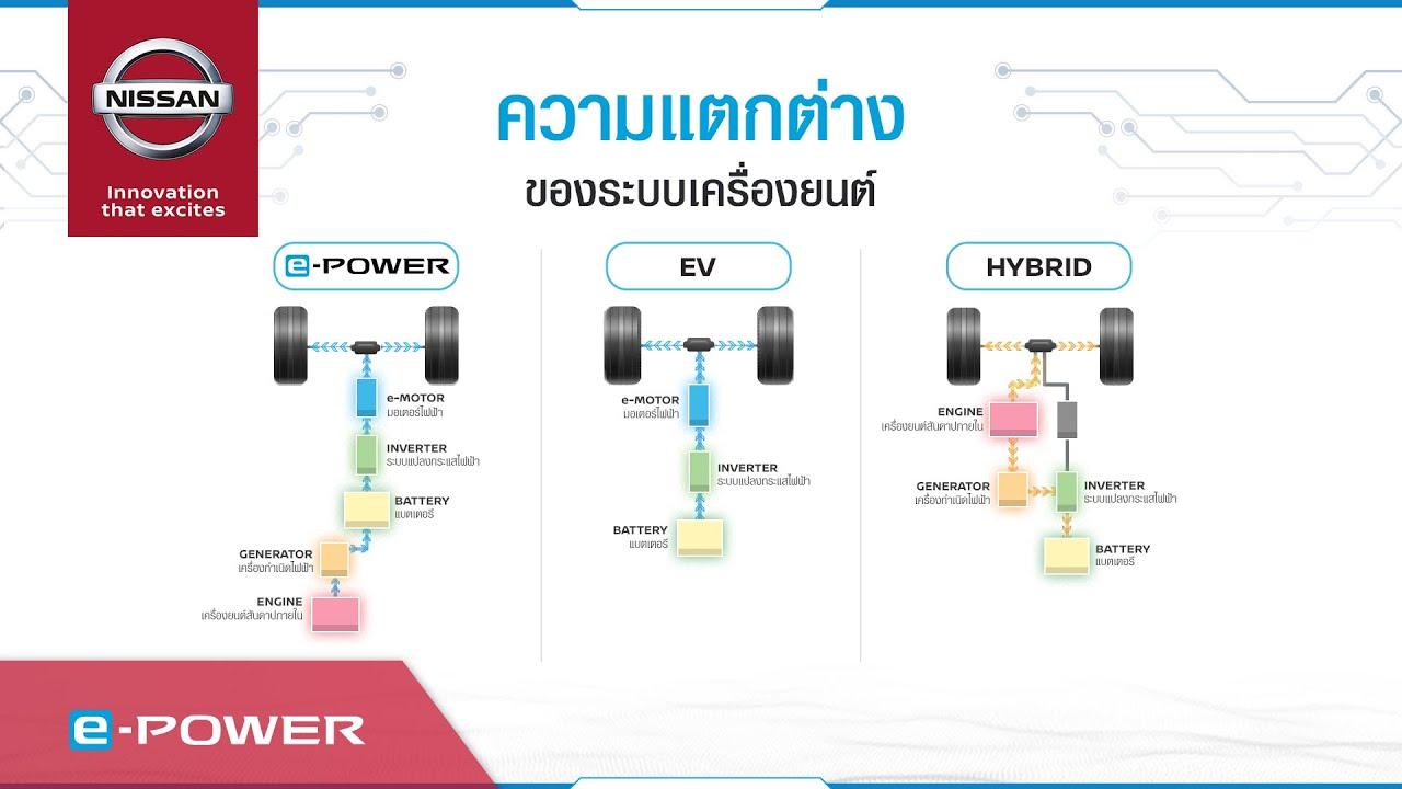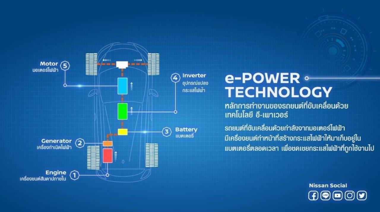 เทคโนโลยีที่ถือเป็นเอกสิทธิของ Nissan เปิดตัวในปี พ.ศ. 2560 มีความแตกต่างจากระบบขับเคลื่อนที่ใช้ไฟฟ้า 100% เครื่องยนต์ e-Power มีส่วนประกอบสองส่วนคือ มอเตอร์ไฟฟ้า และเครื่องยนต์สันดาปภายในขนาดเล็ก ซึ่งเครื่องยนต์สันดาปภายในจะช่วยผลิตกระแสไฟฟ้า ให้กับมอเตอร์ไฟฟ้าเมื่อต้องการใช้พลังงาน โดยระบบขับเคลื่อนแบบนี้ไม่ต้องใช้การประจุไฟฟ้าจากสถานีชาร์จภายนอก หรือพูดให้เข้าใจง่ายๆ ก็คือมันเป็นรถไฟฟ้าที่ไม่ต้องเสียบปลั๊กชาร์จไฟเข้าแบตฯ เนื่องจากมีเครื่องยนต์เอาไว้ปั่นไฟ