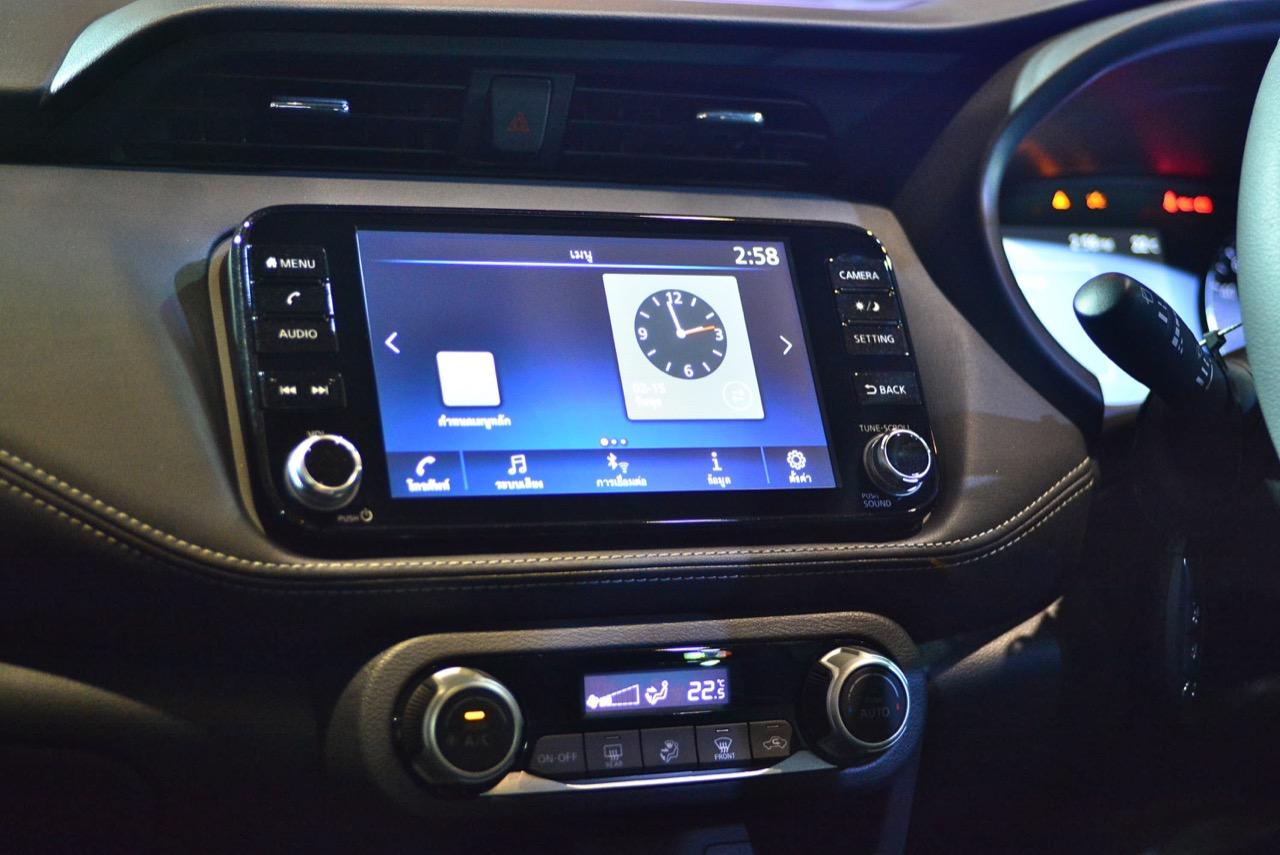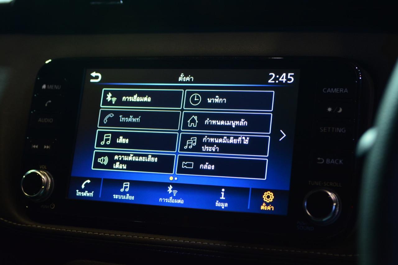 ก้านวงติดตั้งสวิตช์ควบคุมระบบเครื่องเสียง และระบบโทรศัพท์ กับสวิตช์ควบคุมหน้าจอมาตรวัดแสดงผลข้อมูลการขับขี่แบบ TFT เป็นมาตรวัดแบบเรืองแสง Fine Vision Meter แบบ Digital ผ่านจอ TFT ขนาด 7 นิ้ว ส่วนจอมอนิเตอร์กลางขนาด 8 นิ้ว รองรับระบบข้อมูลและความบันเทิง Nissan Connect หน้าจอสั่งงานด้วยระบบสัมผัส พร้อมช่องเชื่อมต่อ Bluetooth®, USB และ AUX IN สำหรับอุปกรณ์ต่อพ่วง ระบบเชื่อมต่อโทรศัพท์สมาร์ทโฟน Apple CarPlay® (สำหรับระบบปฏิบัติการ iOS) ระบบเชื่อมต่อโทรศัพท์ไร้สายแบบ Bluetooth เรียกว่าให้มาครบเลยทีเดียว