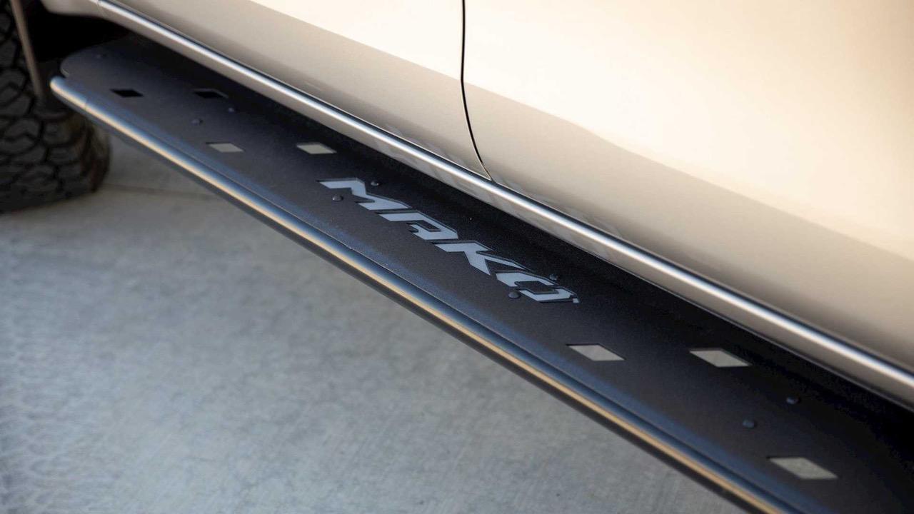 Hilux Mako มาพร้อมกันชนหน้าแบบพิเศษที่มีหูลากโลหะสีแดง กับไฟตัดหมอก LED, แผ่นโลหะกันกระแทกใต้แท่นเครื่องประทับตรา Toyota พลาสติกบังโคลนสีดำที่ดุดัน, บันไดข้างตรา Mako, บันไดกันชนหลังพร้อมที่เหยียบสำหรับงานหนัก, ประตูท้ายแบบปิดนุ่มนวลด้วยบานพับชนิดพิเศษ และสติกเกอร์ Mako ที่กระบะท้าย ในขณะที่หูลาก และจุดต่อการพ่วงลากเรือหรือรถบ้านเป็นอุปกรณ์เสริม