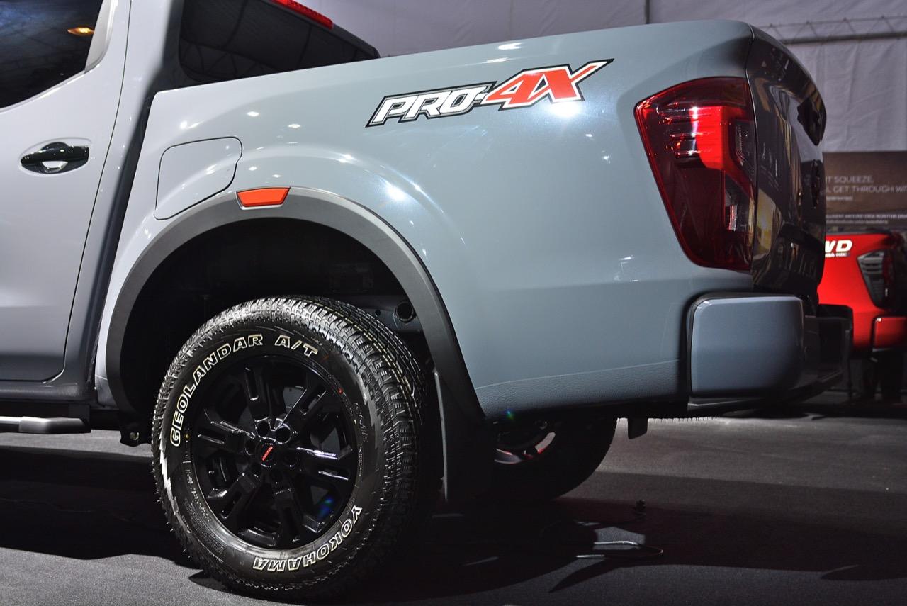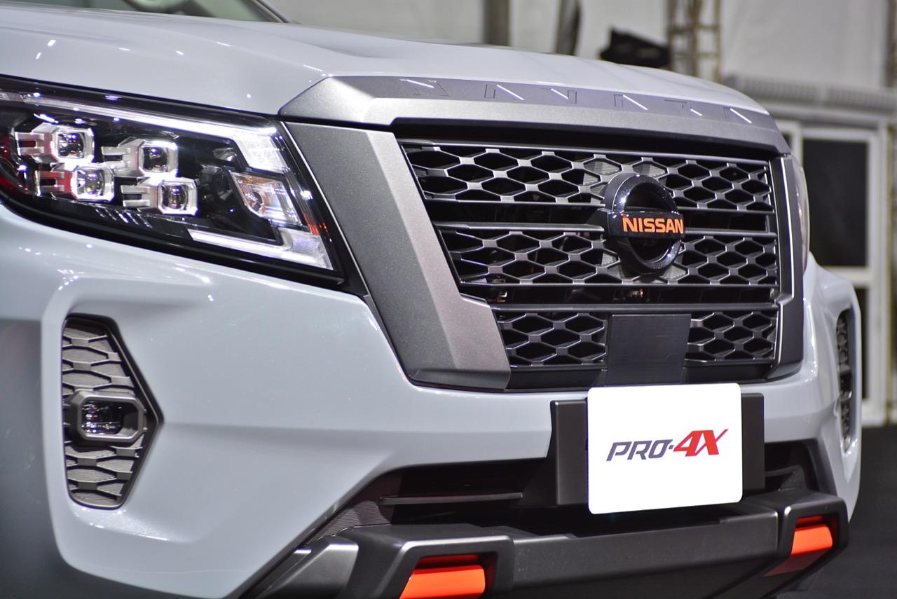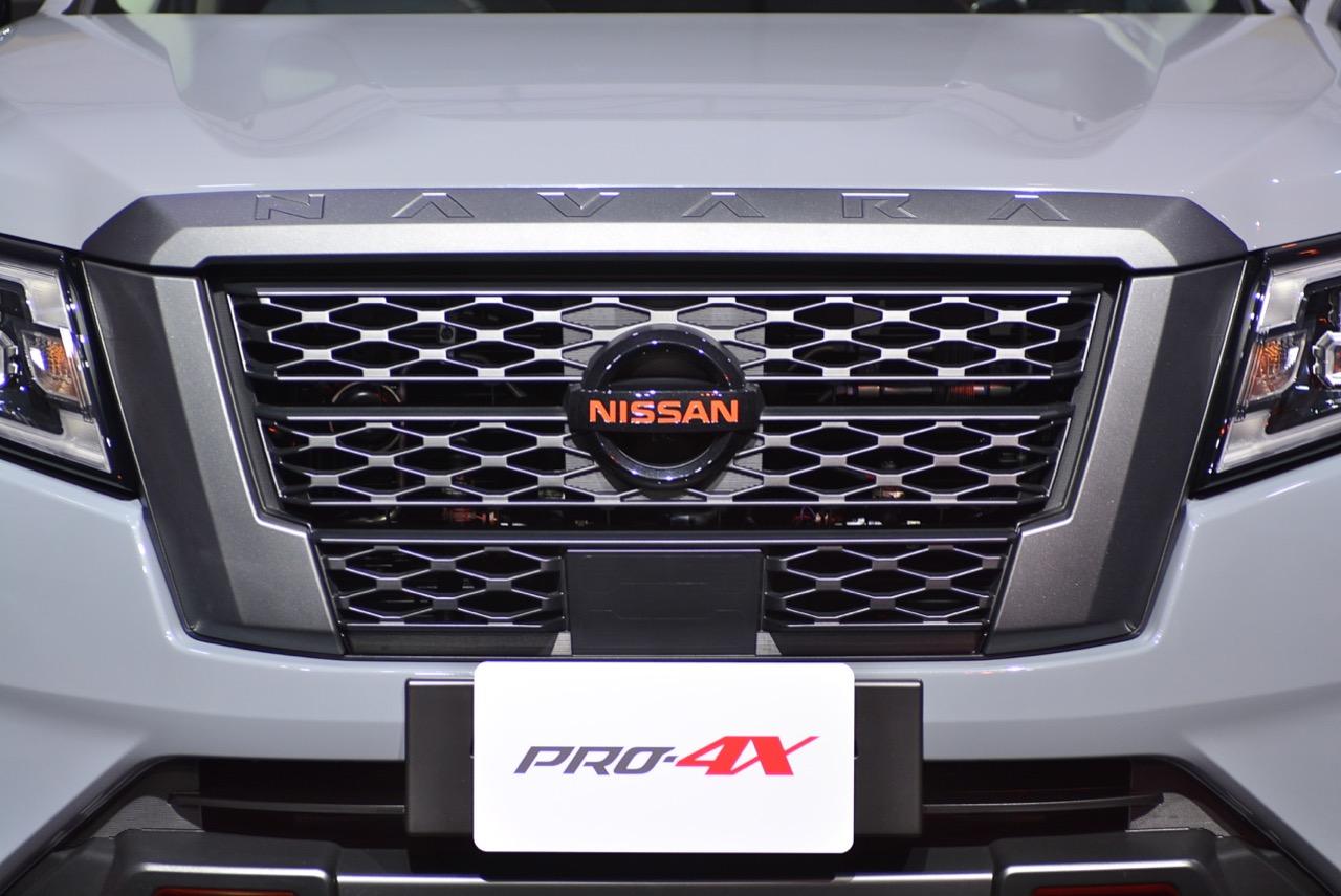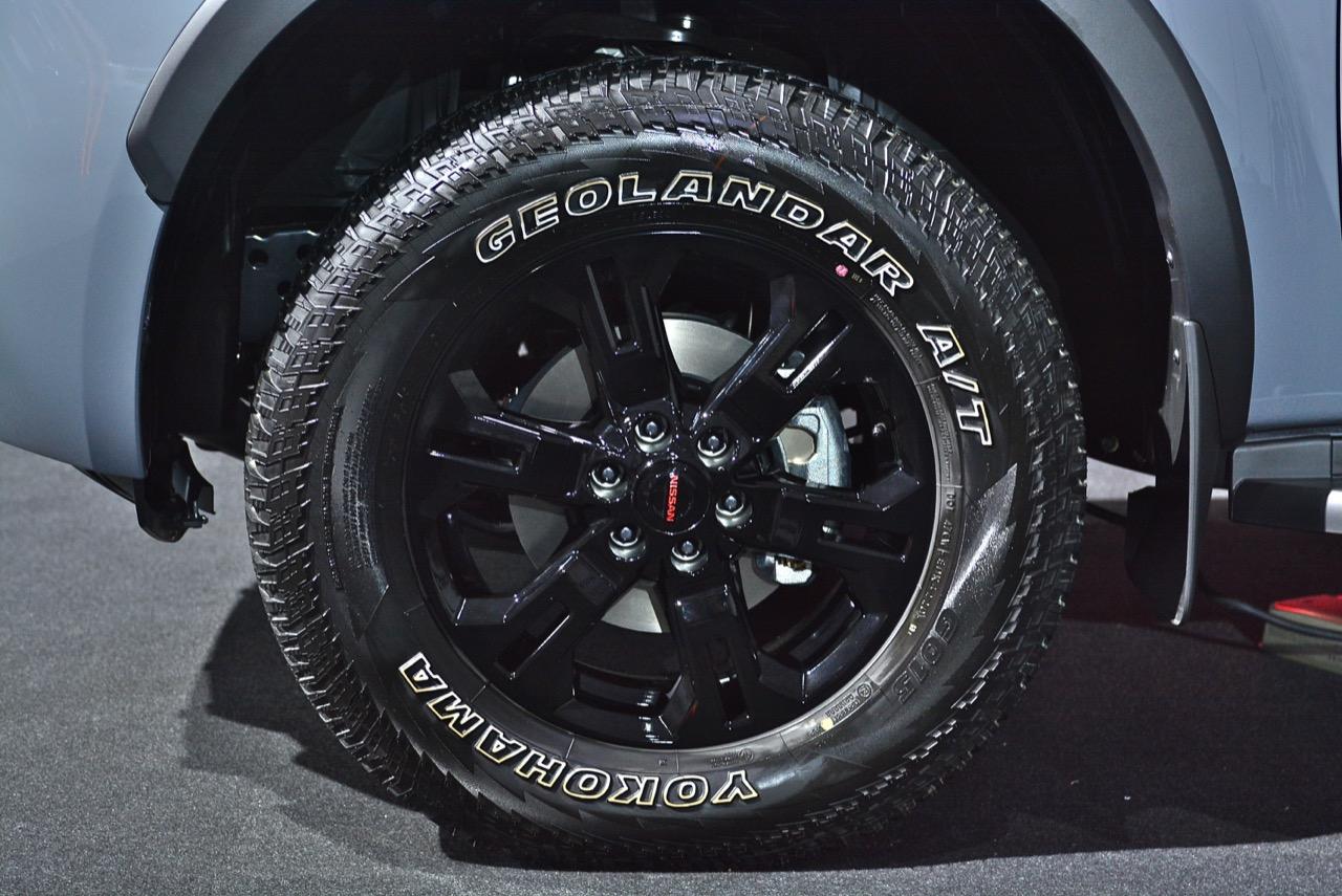 งานดีไซน์ใบหน้าใหม่ของ Navara รุ่นปรับโฉม Pro4X ออกแบบกระจังหน้าใหม่ Interlock กระจังพลาสติกสีเงิน ช่องรับอากาศแบบตาข่ายที่มีลวดลายซับซ้อนสวยงาม ไฟหน้าใหม่คล้ายไฟของรถกระบะ Titan ที่ขายในอเมริกา ระบบไฟหน้าแบบ QUAD - LED คุณภาพสูง 4 ดวง พร้อมไฟหรี่กลางวัน Daytime Running Light ไฟท้ายแบบ LED แบบเส้นเดียว ซุ้มล้อใหม่ขยายขนาดให้กว้างขึ้น สอดรับกับ ล้ออัลลอย ขอบ 17 นิ้ว ลาย 6 ก้านอย่างบึก สี gun metallic ยาง Yokohama Geolandar A/T 255/65R17 110H