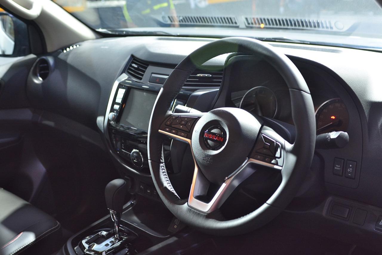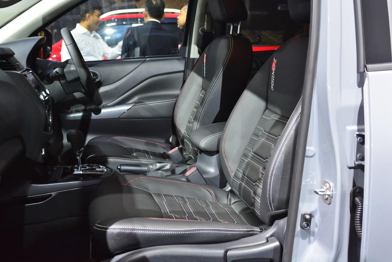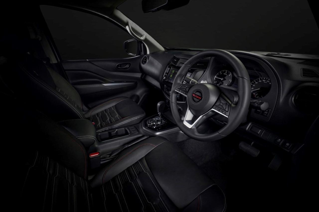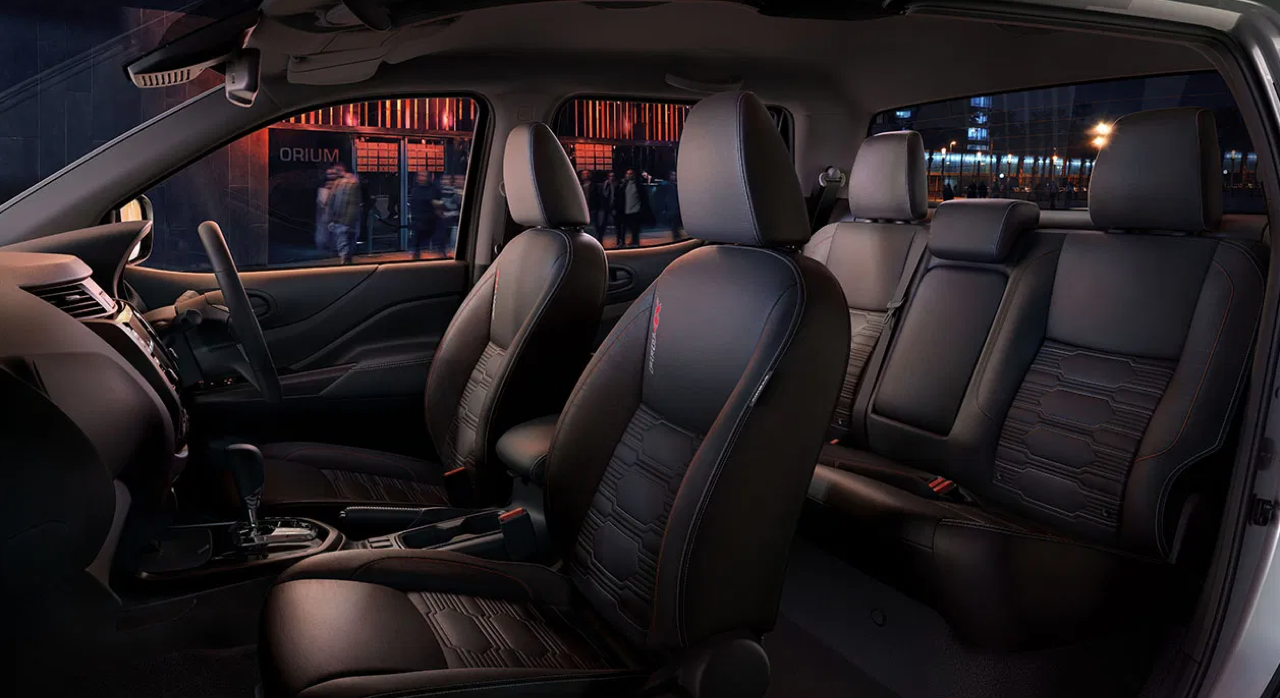 ห้องโดยสารของ Navara ใหม่ ใช้กระจกแบบ Noise-reducing acoustic glass ลดเสียงรบกวนที่เข้ามาในห้องโดยสาร และกระจกตอนหลังกรองแสงสีชา ตกแต่งภายในด้วยหนังแท้รอบห้องโดยสารโทนสีดำ เบาะนั่งคู่หน้าแบบ Zero Gravity ปรับไฟฟ้า 8 ทิศทาง พร้อมดันหลังปรับไฟฟ้า ในตำแหน่งผู้ขับขี่ เบาะที่นั่งด้านหลัง เพิ่มความสบายด้วยดีไซน์ใหม่นุ่มสบาย (Comfort rear seating cushions) มีที่พักแขนและที่วางแก้วน้ำ 2 ตำแหน่ง พอร์ต USB Type C บริเวณคอนโซลกลาง