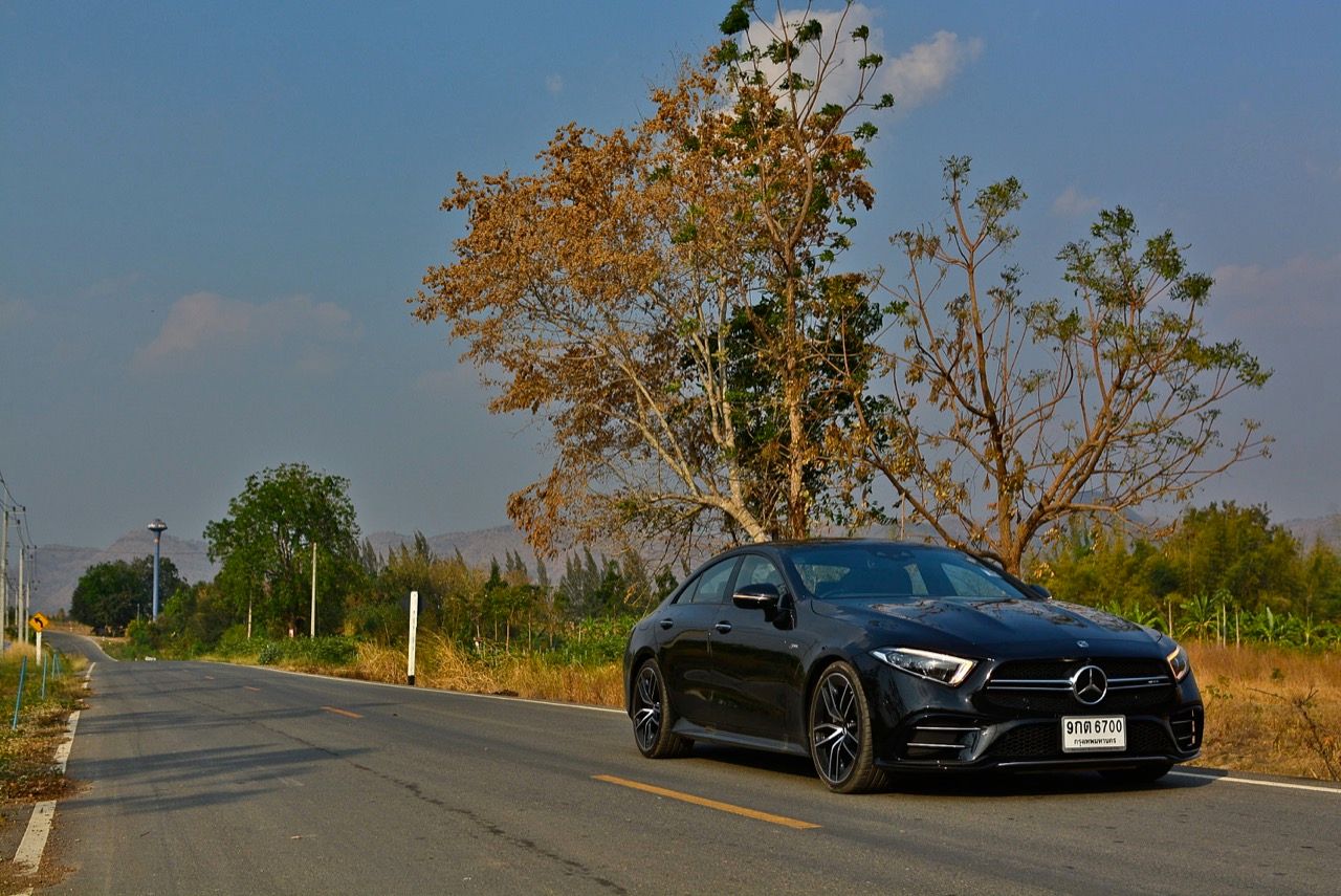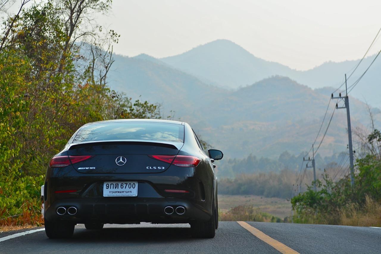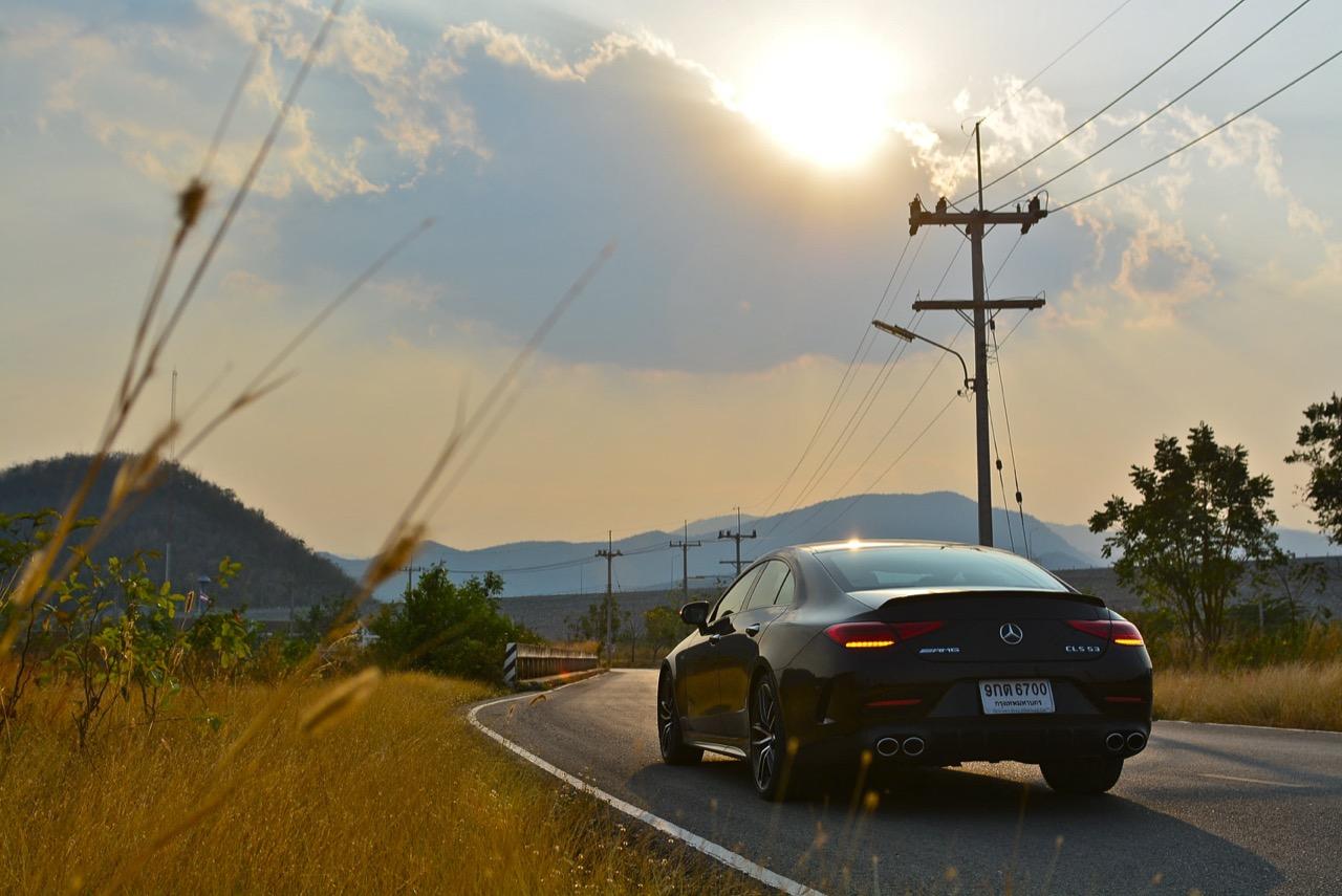 ผมลากเจ้าตราดาวสีดำคันนี้ไปแถวด่านช้าง ทะลุออกอ่างเก็บน้ำลำตะเพิน แล้วขับผ่านโครงการพระราชดำริ อ่างเก็บน้ำห้วยองคต ที่เงียบสงบและสวยงาม กำลัง 435 แรงม้า กับแรงบิด 520 นิวตัน-เมตร (แรงบิดจากมอเตอร์ไฟฟ้าในระบบ EQ Boost 250 นิวตัน-เมตร) พร้อมระบบขับเคลื่อน 4 ล้อ ที่ฉลาดหลักแหลมอย่างระบบ 4MATIC+ ชุดควบคุมระบบขับเคลื่อนเพื่อกระจายแรงบิดให้มีความสมดุลตลอดการขับขี่ ช่วงล่าง Adaptive Air Suspension ที่ถูกปรับปรุงใหม่ทั้งหมด ผลที่ได้รับก็คือ CLS 53 AMG เร็วพอที่จะไล่จี้ BMW M4 แบบสบายๆ ทั้งๆ ที่คันใหญ่กว่าเยอะ เมื่อกดคันเร่งลงลึกในโหมด Comfort ความรู้สึกย้อนแย้งก็เริ่มเกิดขึ้น เมื่อคุณใช้โหมดธรรมดาสามัญในการขับเคลื่อนรถสปอร์ตสองบุคลิกคันนี้ แต่ดันทะลึ่งขับเร็ว เซนเซอร์ที่ตรวจจับการทำงานของคันเร่งไฟฟ้าพยายามสื่อสารกับ ECU ว่า ควรจะเปิดทุกสิ่งทุกอย่างตามที่คนขับต้องการ หลังจากนั้นแค่แวบเดียว เสียงเครื่องยนต์ที่เคยดังเบาๆ แบบสุภาพก็เปลี่ยนไปทันที CLS 53 AMG แตกต่างจาก AMG ทั่วไป ในด้านของบุคลิก ส่วนสมรรถนะ การเร่งจาก 0-100 กิโลเมตรต่อชั่วโมงที่ว่องไวนั้นสูสีกับพี่น้องในตระกูล 53 ทุกรุ่น คือพอขับแล้วก็ให้ความรู้สึกในการตอบสนองที่คล้ายกัน