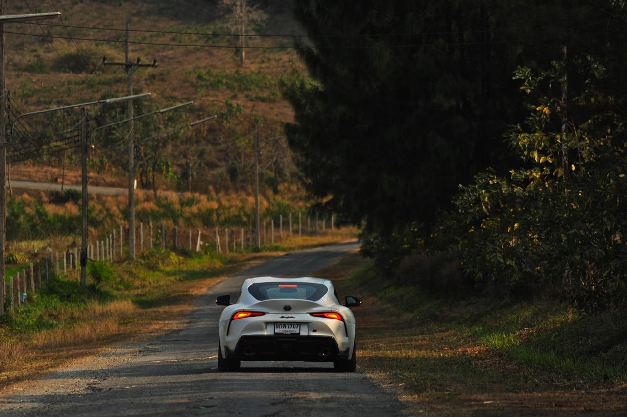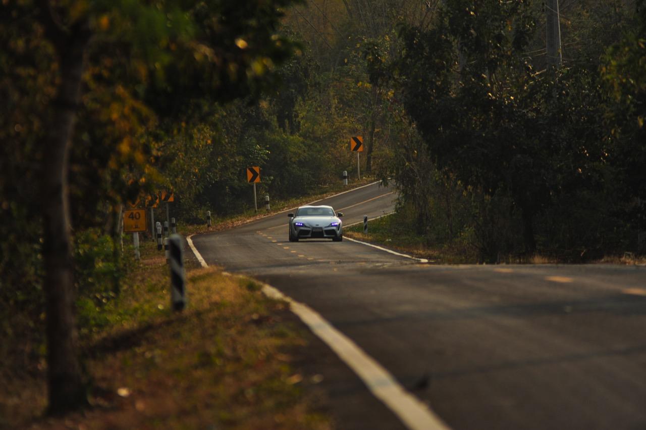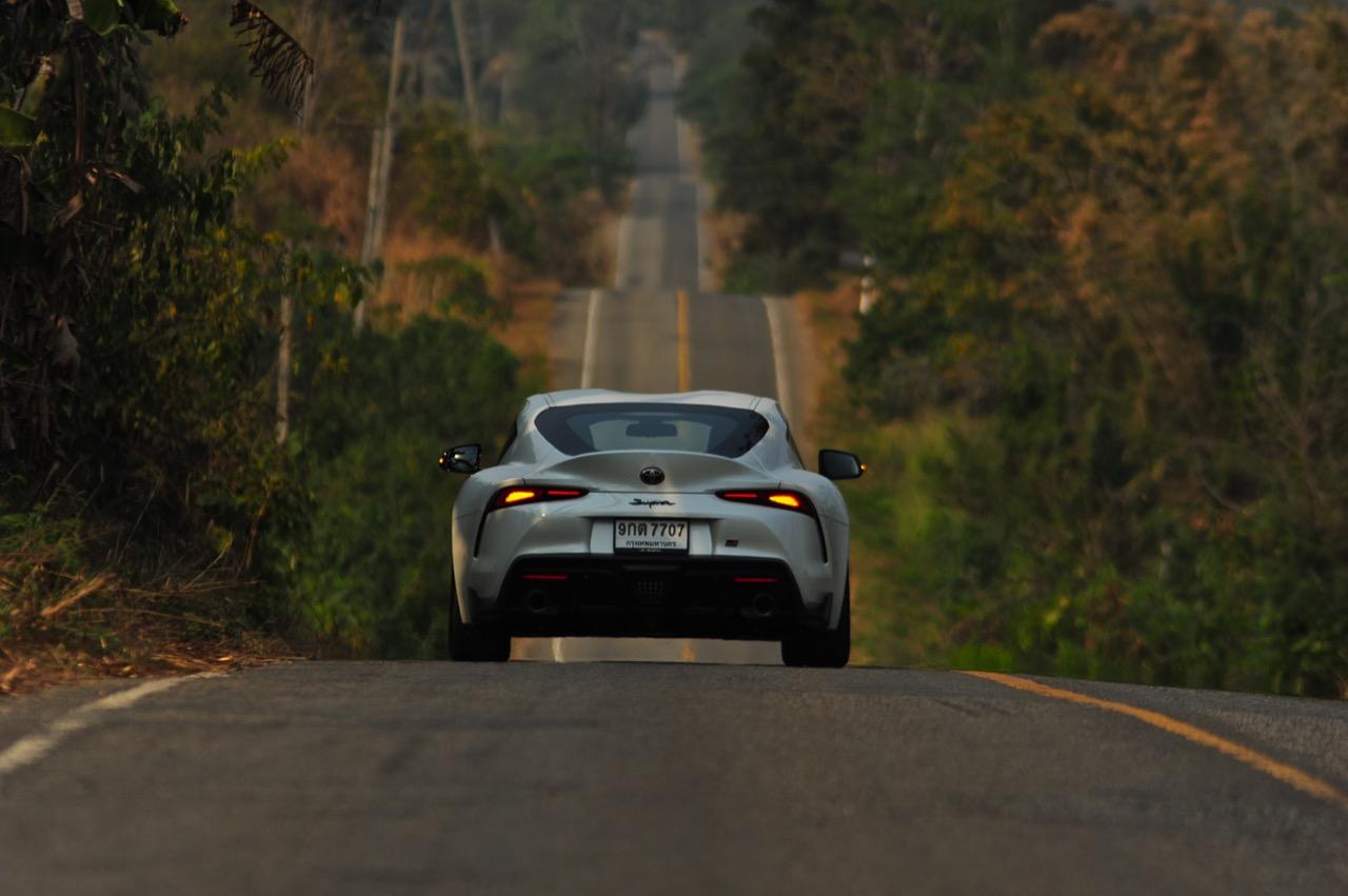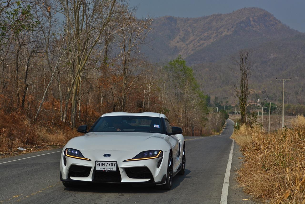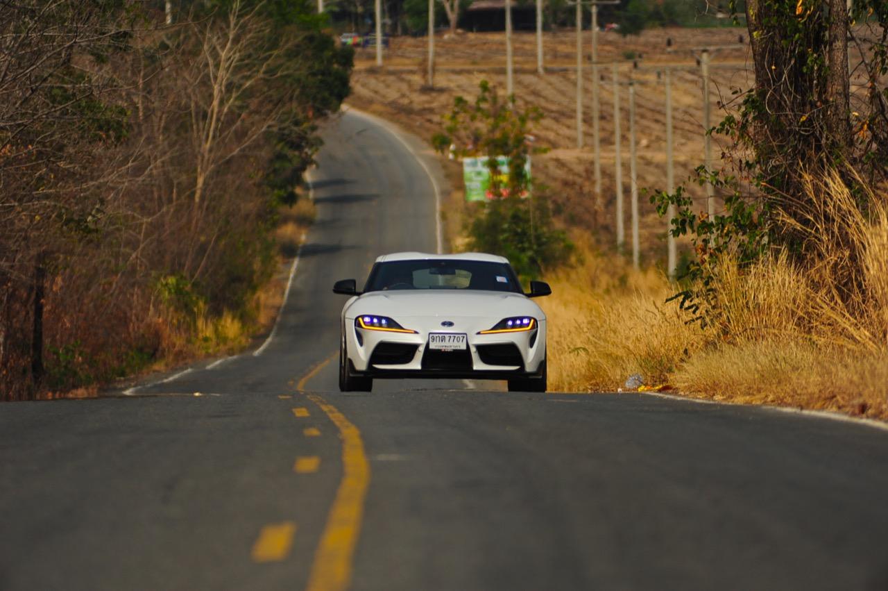 เมื่อปลายเดือนสิงหาคม 2562 ผมมีโอกาสได้ลองขับมันสั้นๆ บนถนนสายรองในเมืองเซนได และในช่วงบ่ายก็ลงไปอัดเต็มเหนี่ยวในสนามแข่งรถ Sugo International Race Circuit ที่โดนครูฝึกชาวอาทิตย์อุทัยสั่งให้กระหน่ำคันเร่งแบบลืมตายบนสนามที่ผมไม่มีความคุ้นเคยเลยแม้แต่นิดเดียว! กลับมาถึงเมืองไทย หลังจากการเปิดตัวก่อนปีใหม่ จนมาถึงวันสุดท้ายของเดือนมกราคม 2563 ผมรับรถทดสอบ GR Supra สีขาว แล้วขับออกทางไกลโดยใช้เส้นทางที่คิดว่าเหมาะสมและใกล้กับกรุงเทพฯ มากที่สุด ถนนเส้นสุพรรณบุรีออกไปทางอำเภอเลาขวัญเชื่อมต่อกับหนองปรือและอ่างเก็บน้ำลำตะเพิน มีอุปสรรคทุกอย่างที่ทำให้การขับรถทดสอบกลายเป็นเรื่องท้าทาย ไม่ว่าจะเป็นทางปูนที่ไม่ถูกโรคกับยางแก้มเตี้ยและช่วงล่างแข็งๆ โค้งขึ้นลงเนินเขาที่มองไม่เห็นปลายโค้ง คอสะพานชันและโด่งราวกับคางของดาราสาวบางคน หลุมที่ซ่อนตัวเพื่อดักพวกขับไม่ระวัง หรือเนินยาวที่พอเทลงมาก็จะเจอเข้ากับสี่แยก ถนนที่มีความหลากหลายของประเทศไทยในแถบตะวันตกสามารถทดสอบประสิทธิภาพของรถแต่ละคันได้เป็นอย่างดี ที่สำคัญก็คือความปลอดภัย เพราะถนนเส้นดังกล่าวมีรถน้อย โดยเฉพาะรถบรรทุกที่นานๆ ถึงจะโผล่มาคันนึง รวมถึงสภาพอากาศของสุพรรณบุรีและกาญจนบุรีที่ร้อนทั้งปีทั้งชาติก็ยังมีความเหมาะสมกับการทดสอบความอึดของเครื่องยนต์ การทำงานของระบบระบายความร้อนและระบบปรับอากาศอีกด้วย ช่วงล่างของ Supra ทำงานได้อย่างสมบูรณ์แบบ ไม่ได้กระด้างจนทำให้กระเด้งกระดอนไปมาในรถ ออกไปในแบบบหนึบๆ บางจังหวะก็แอบมีนุ่มเมื่อวิ่งผ่านทางลาดยางเรียบๆ โช้คอัพกับสปริง มีระยะยืดและยุบพอดิบพอดี แม้จะเจอเข้ากับคอสะพานชันๆ ก็ยังผ่านไปได้แบบไม่เสียอาการ รถสเปกไทยมีช่วงล่างแบปรับตั้งค่าได้สองระดับ (Normal / Sport) เป็นอุปกรณ์มาตรฐาน ช่วงล่างที่เซตค่ามาเป็นอย่างดีช่วยทำให้การวิ่งผ่านผิวถนนที่ไม่เรียบบนยางสปอร์ตมีความนุ่มนวลใช้ได้ ช่วงล่างหน้าแบบแมคเฟอร์สัน สตรัท สปริง โช้คและกันโคลงช่วยดูดซับอาการสะเทือนที่ทำให้รู้สึกไม่สบายเนื้อตัวออกไปได้มาก มากพอที่คนอายุ 50 อย่างผมจะหวดมันได้ทั้งวันโดยไม่มีอาการปวดเมื่อยเนื้อตัวตามมาหลังจากกลับถึงบ้าน