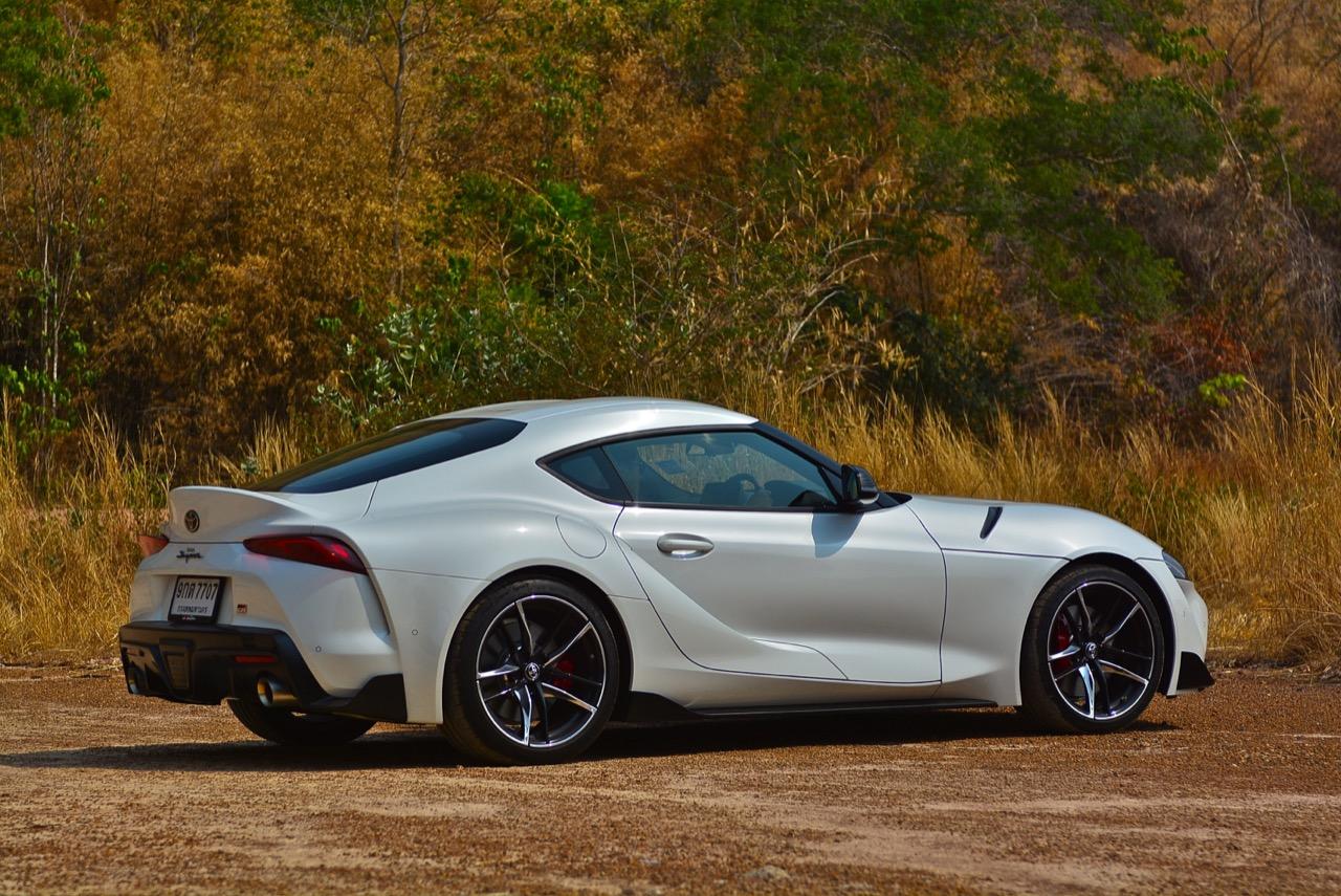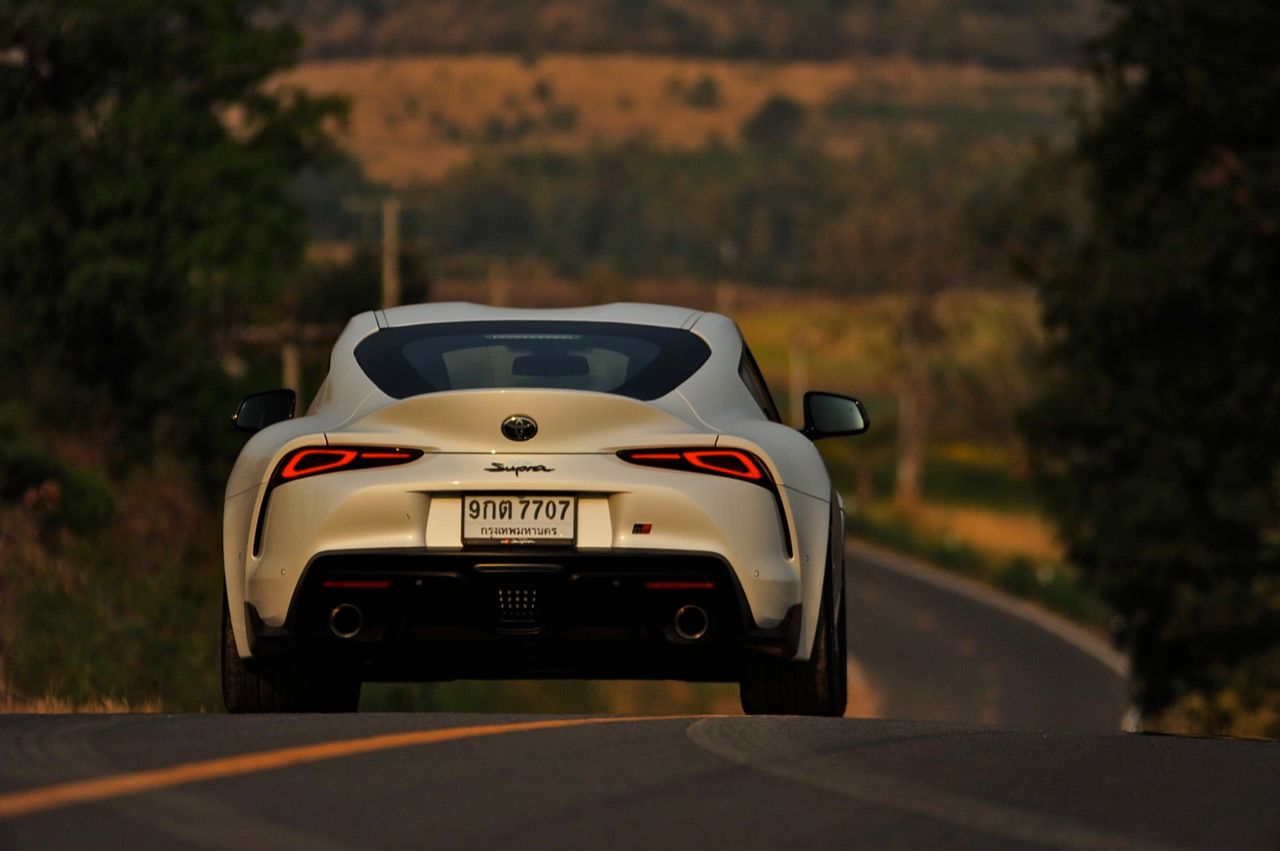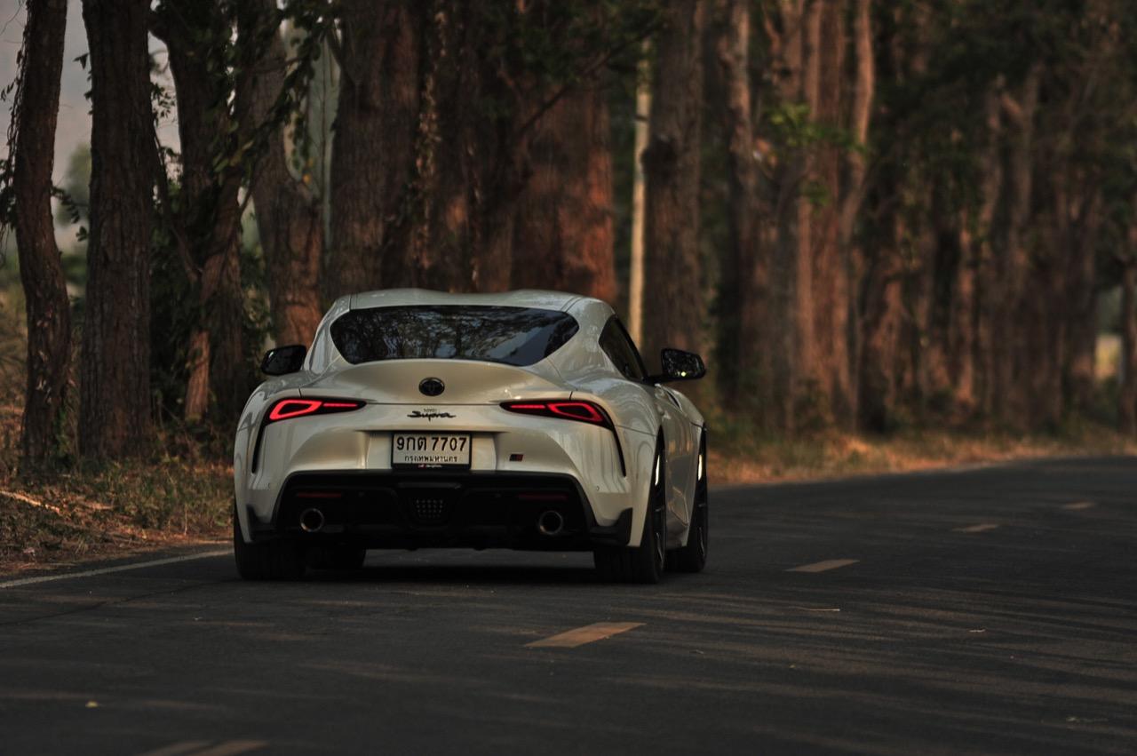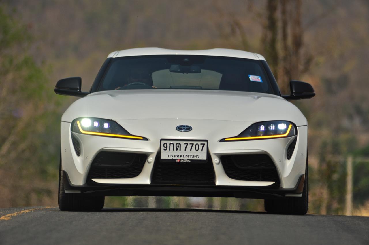 เมื่อปลายเดือนสิงหาคม 2562 ผมมีโอกาสได้ลองขับมันสั้นๆ บนถนนสายรองในเมืองเซนได และในช่วงบ่ายก็ลงไปอัดเต็มเหนี่ยวในสนามแข่งรถ Sugo International Race Circuit ที่โดนครูฝึกชาวอาทิตย์อุทัยสั่งให้กระหน่ำคันเร่งแบบลืมตายบนสนามที่ผมไม่มีความคุ้นเคยเลยแม้แต่นิดเดียว! กลับมาถึงเมืองไทย หลังจากการเปิดตัวก่อนปีใหม่ จนมาถึงวันสุดท้ายของเดือนมกราคม 2563 ผมรับรถทดสอบ GR Supra สีขาว แล้วขับออกทางไกลโดยใช้เส้นทางที่คิดว่าเหมาะสมและใกล้กับกรุงเทพฯ มากที่สุด ถนนเส้นสุพรรณบุรีออกไปทางอำเภอเลาขวัญเชื่อมต่อกับหนองปรือและอ่างเก็บน้ำลำตะเพิน มีอุปสรรคทุกอย่างที่ทำให้การขับรถทดสอบกลายเป็นเรื่องท้าทาย ไม่ว่าจะเป็นทางปูนที่ไม่ถูกโรคกับยางแก้มเตี้ยและช่วงล่างแข็งๆ โค้งขึ้นลงเนินเขาที่มองไม่เห็นปลายโค้ง คอสะพานชันและโด่งราวกับคางของดาราสาวบางคน หลุมที่ซ่อนตัวเพื่อดักพวกขับไม่ระวัง หรือเนินยาวที่พอเทลงมาก็จะเจอเข้ากับสี่แยก ถนนที่มีความหลากหลายของประเทศไทยในแถบตะวันตกสามารถทดสอบประสิทธิภาพของรถแต่ละคันได้เป็นอย่างดี ที่สำคัญก็คือความปลอดภัย เพราะถนนเส้นดังกล่าวมีรถน้อย โดยเฉพาะรถบรรทุกที่นานๆ ถึงจะโผล่มาคันนึง รวมถึงสภาพอากาศของสุพรรณบุรีและกาญจนบุรีที่ร้อนทั้งปีทั้งชาติก็ยังมีความเหมาะสมกับการทดสอบความอึดของเครื่องยนต์ การทำงานของระบบระบายความร้อนและระบบปรับอากาศอีกด้วย ช่วงล่างของ Supra ทำงานได้อย่างสมบูรณ์แบบ ไม่ได้กระด้างจนทำให้กระเด้งกระดอนไปมาในรถ ออกไปในแบบบหนึบๆ บางจังหวะก็แอบมีนุ่มเมื่อวิ่งผ่านทางลาดยางเรียบๆ โช้คอัพกับสปริง มีระยะยืดและยุบพอดิบพอดี แม้จะเจอเข้ากับคอสะพานชันๆ ก็ยังผ่านไปได้แบบไม่เสียอาการ รถสเปกไทยมีช่วงล่างแบปรับตั้งค่าได้สองระดับ (Normal / Sport) เป็นอุปกรณ์มาตรฐาน ช่วงล่างที่เซตค่ามาเป็นอย่างดีช่วยทำให้การวิ่งผ่านผิวถนนที่ไม่เรียบบนยางสปอร์ตมีความนุ่มนวลใช้ได้ ช่วงล่างหน้าแบบแมคเฟอร์สัน สตรัท สปริง โช้คและกันโคลงช่วยดูดซับอาการสะเทือนที่ทำให้รู้สึกไม่สบายเนื้อตัวออกไปได้มาก มากพอที่คนอายุ 50 อย่างผมจะหวดมันได้ทั้งวันโดยไม่มีอาการปวดเมื่อยเนื้อตัวตามมาหลังจากกลับถึงบ้าน