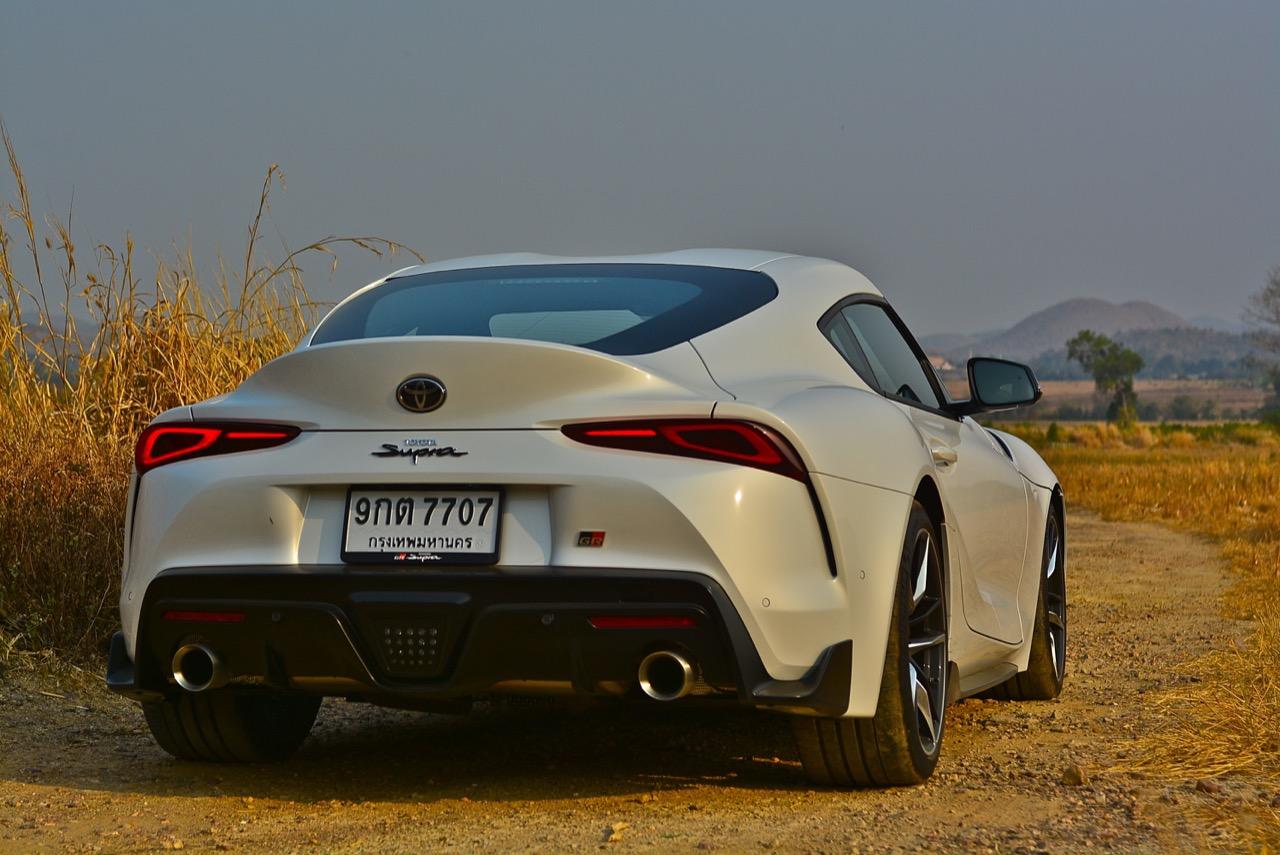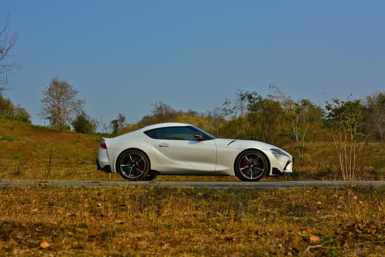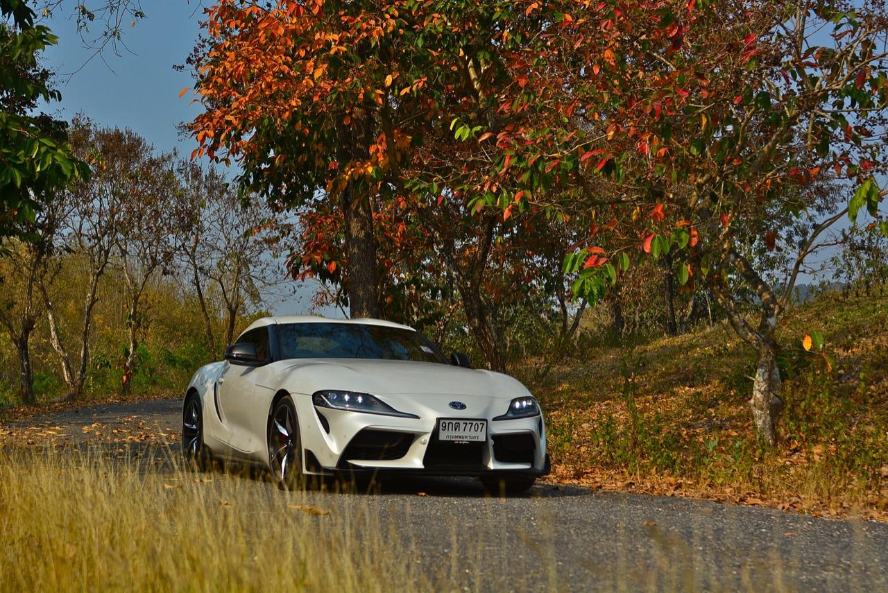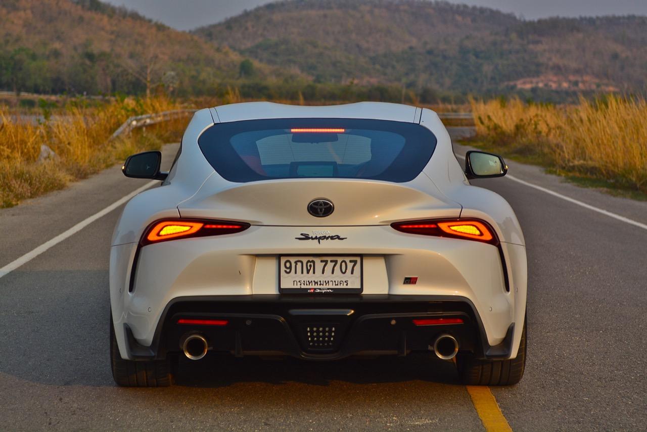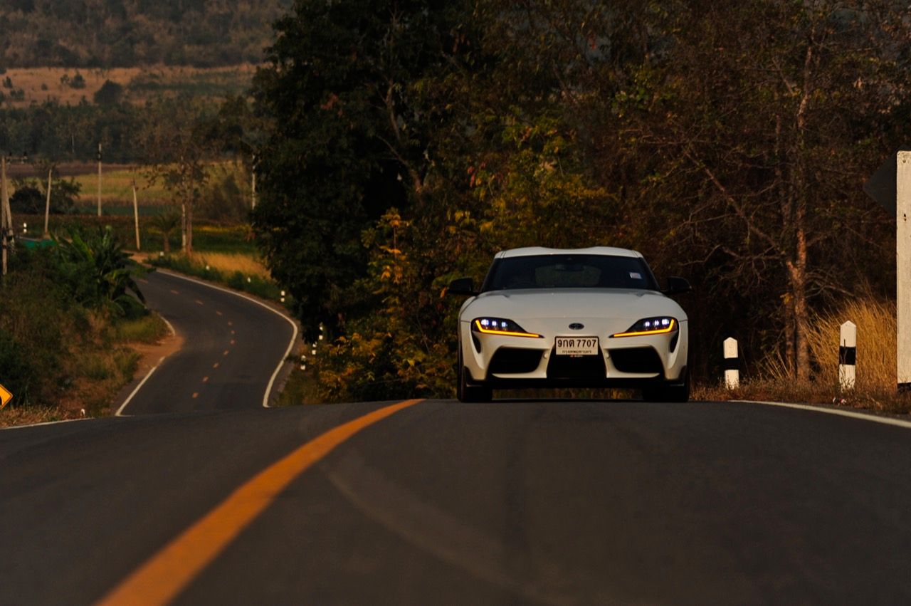 เมื่อปลายเดือนสิงหาคม 2562 ผมมีโอกาสได้ลองขับมันสั้นๆ บนถนนสายรองในเมืองเซนได และในช่วงบ่ายก็ลงไปอัดเต็มเหนี่ยวในสนามแข่งรถ Sugo International Race Circuit ที่โดนครูฝึกชาวอาทิตย์อุทัยสั่งให้กระหน่ำคันเร่งแบบลืมตายบนสนามที่ผมไม่มีความคุ้นเคยเลยแม้แต่นิดเดียว! กลับมาถึงเมืองไทย หลังจากการเปิดตัวก่อนปีใหม่ จนมาถึงวันสุดท้ายของเดือนมกราคม 2563 ผมรับรถทดสอบ GR Supra สีขาว แล้วขับออกทางไกลโดยใช้เส้นทางที่คิดว่าเหมาะสมและใกล้กับกรุงเทพฯ มากที่สุด ถนนเส้นสุพรรณบุรีออกไปทางอำเภอเลาขวัญเชื่อมต่อกับหนองปรือและอ่างเก็บน้ำลำตะเพิน มีอุปสรรคทุกอย่างที่ทำให้การขับรถทดสอบกลายเป็นเรื่องท้าทาย ไม่ว่าจะเป็นทางปูนที่ไม่ถูกโรคกับยางแก้มเตี้ยและช่วงล่างแข็งๆ โค้งขึ้นลงเนินเขาที่มองไม่เห็นปลายโค้ง คอสะพานชันและโด่งราวกับคางของดาราสาวบางคน หลุมที่ซ่อนตัวเพื่อดักพวกขับไม่ระวัง หรือเนินยาวที่พอเทลงมาก็จะเจอเข้ากับสี่แยก ถนนที่มีความหลากหลายของประเทศไทยในแถบตะวันตกสามารถทดสอบประสิทธิภาพของรถแต่ละคันได้เป็นอย่างดี ที่สำคัญก็คือความปลอดภัย เพราะถนนเส้นดังกล่าวมีรถน้อย โดยเฉพาะรถบรรทุกที่นานๆ ถึงจะโผล่มาคันนึง รวมถึงสภาพอากาศของสุพรรณบุรีและกาญจนบุรีที่ร้อนทั้งปีทั้งชาติก็ยังมีความเหมาะสมกับการทดสอบความอึดของเครื่องยนต์ การทำงานของระบบระบายความร้อนและระบบปรับอากาศอีกด้วย ช่วงล่างของ Supra ทำงานได้อย่างสมบูรณ์แบบ ไม่ได้กระด้างจนทำให้กระเด้งกระดอนไปมาในรถ ออกไปในแบบบหนึบๆ บางจังหวะก็แอบมีนุ่มเมื่อวิ่งผ่านทางลาดยางเรียบๆ โช้คอัพกับสปริง มีระยะยืดและยุบพอดิบพอดี แม้จะเจอเข้ากับคอสะพานชันๆ ก็ยังผ่านไปได้แบบไม่เสียอาการ รถสเปกไทยมีช่วงล่างแบปรับตั้งค่าได้สองระดับ (Normal / Sport) เป็นอุปกรณ์มาตรฐาน ช่วงล่างที่เซตค่ามาเป็นอย่างดีช่วยทำให้การวิ่งผ่านผิวถนนที่ไม่เรียบบนยางสปอร์ตมีความนุ่มนวลใช้ได้ ช่วงล่างหน้าแบบแมคเฟอร์สัน สตรัท สปริง โช้คและกันโคลงช่วยดูดซับอาการสะเทือนที่ทำให้รู้สึกไม่สบายเนื้อตัวออกไปได้มาก มากพอที่คนอายุ 50 อย่างผมจะหวดมันได้ทั้งวันโดยไม่มีอาการปวดเมื่อยเนื้อตัวตามมาหลังจากกลับถึงบ้าน