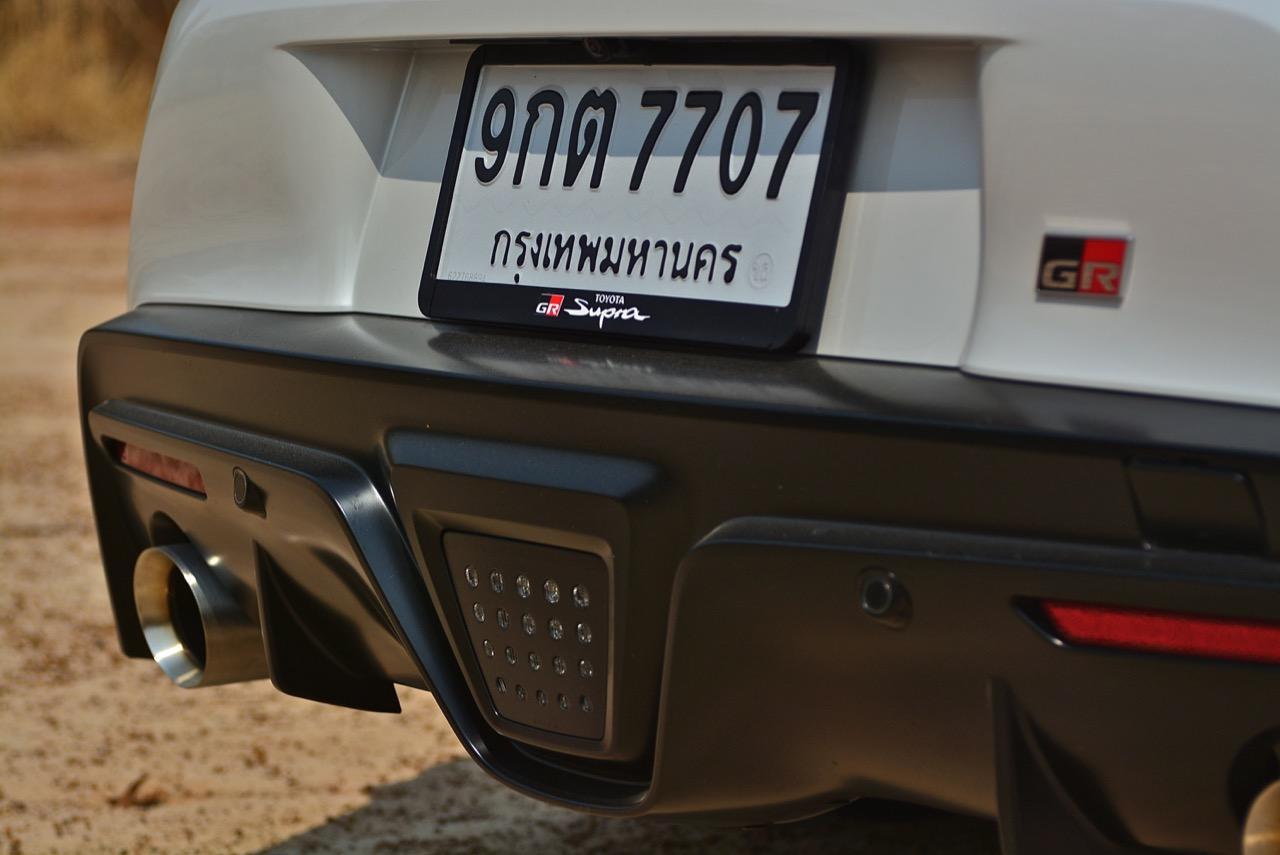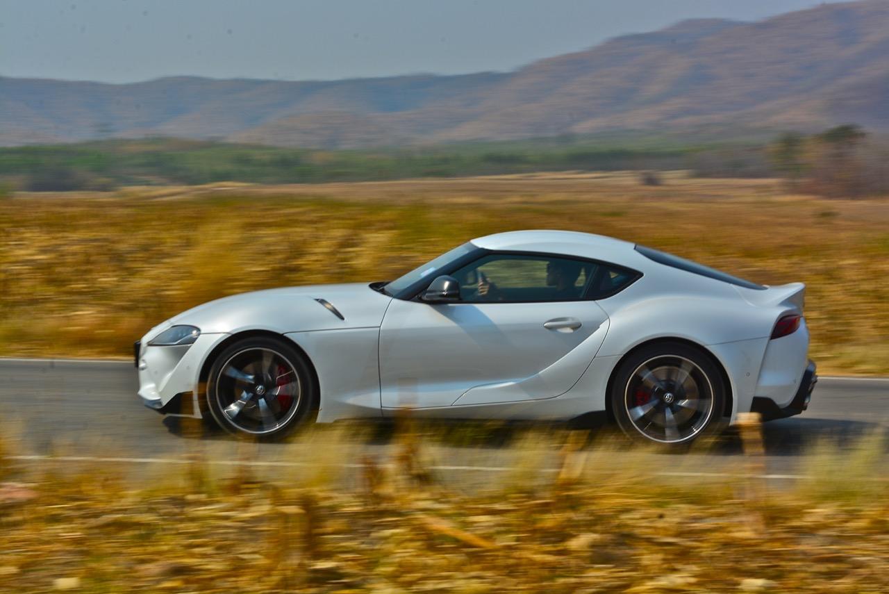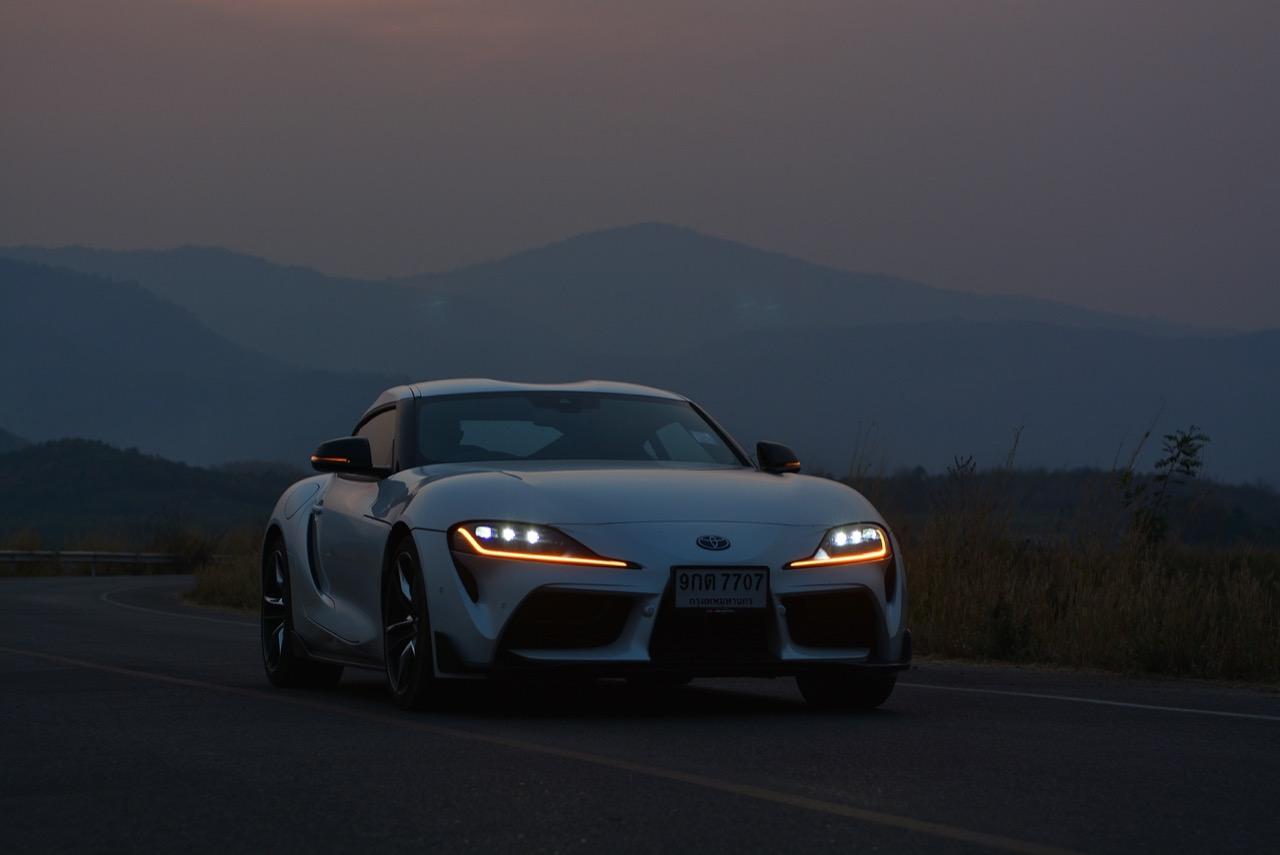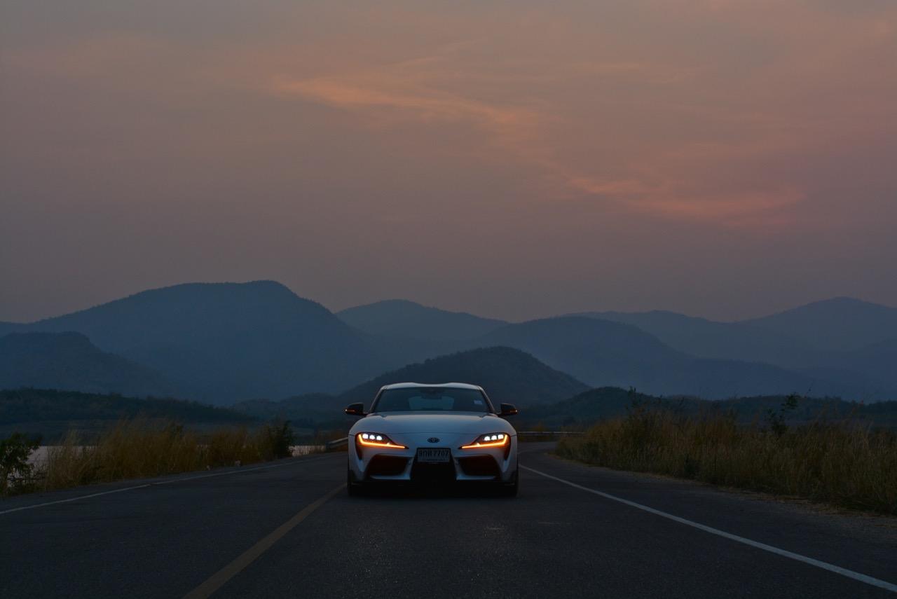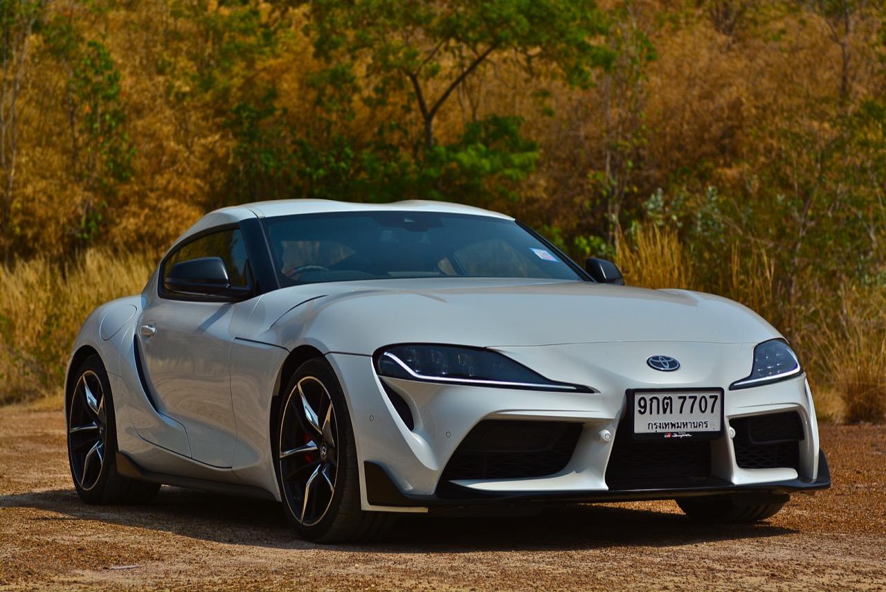 เมื่อปลายเดือนสิงหาคม 2562 ผมมีโอกาสได้ลองขับมันสั้นๆ บนถนนสายรองในเมืองเซนได และในช่วงบ่ายก็ลงไปอัดเต็มเหนี่ยวในสนามแข่งรถ Sugo International Race Circuit ที่โดนครูฝึกชาวอาทิตย์อุทัยสั่งให้กระหน่ำคันเร่งแบบลืมตายบนสนามที่ผมไม่มีความคุ้นเคยเลยแม้แต่นิดเดียว! กลับมาถึงเมืองไทย หลังจากการเปิดตัวก่อนปีใหม่ จนมาถึงวันสุดท้ายของเดือนมกราคม 2563 ผมรับรถทดสอบ GR Supra สีขาว แล้วขับออกทางไกลโดยใช้เส้นทางที่คิดว่าเหมาะสมและใกล้กับกรุงเทพฯ มากที่สุด ถนนเส้นสุพรรณบุรีออกไปทางอำเภอเลาขวัญเชื่อมต่อกับหนองปรือและอ่างเก็บน้ำลำตะเพิน มีอุปสรรคทุกอย่างที่ทำให้การขับรถทดสอบกลายเป็นเรื่องท้าทาย ไม่ว่าจะเป็นทางปูนที่ไม่ถูกโรคกับยางแก้มเตี้ยและช่วงล่างแข็งๆ โค้งขึ้นลงเนินเขาที่มองไม่เห็นปลายโค้ง คอสะพานชันและโด่งราวกับคางของดาราสาวบางคน หลุมที่ซ่อนตัวเพื่อดักพวกขับไม่ระวัง หรือเนินยาวที่พอเทลงมาก็จะเจอเข้ากับสี่แยก ถนนที่มีความหลากหลายของประเทศไทยในแถบตะวันตกสามารถทดสอบประสิทธิภาพของรถแต่ละคันได้เป็นอย่างดี ที่สำคัญก็คือความปลอดภัย เพราะถนนเส้นดังกล่าวมีรถน้อย โดยเฉพาะรถบรรทุกที่นานๆ ถึงจะโผล่มาคันนึง รวมถึงสภาพอากาศของสุพรรณบุรีและกาญจนบุรีที่ร้อนทั้งปีทั้งชาติก็ยังมีความเหมาะสมกับการทดสอบความอึดของเครื่องยนต์ การทำงานของระบบระบายความร้อนและระบบปรับอากาศอีกด้วย ช่วงล่างของ Supra ทำงานได้อย่างสมบูรณ์แบบ ไม่ได้กระด้างจนทำให้กระเด้งกระดอนไปมาในรถ ออกไปในแบบบหนึบๆ บางจังหวะก็แอบมีนุ่มเมื่อวิ่งผ่านทางลาดยางเรียบๆ โช้คอัพกับสปริง มีระยะยืดและยุบพอดิบพอดี แม้จะเจอเข้ากับคอสะพานชันๆ ก็ยังผ่านไปได้แบบไม่เสียอาการ รถสเปกไทยมีช่วงล่างแบปรับตั้งค่าได้สองระดับ (Normal / Sport) เป็นอุปกรณ์มาตรฐาน ช่วงล่างที่เซตค่ามาเป็นอย่างดีช่วยทำให้การวิ่งผ่านผิวถนนที่ไม่เรียบบนยางสปอร์ตมีความนุ่มนวลใช้ได้ ช่วงล่างหน้าแบบแมคเฟอร์สัน สตรัท สปริง โช้คและกันโคลงช่วยดูดซับอาการสะเทือนที่ทำให้รู้สึกไม่สบายเนื้อตัวออกไปได้มาก มากพอที่คนอายุ 50 อย่างผมจะหวดมันได้ทั้งวันโดยไม่มีอาการปวดเมื่อยเนื้อตัวตามมาหลังจากกลับถึงบ้าน