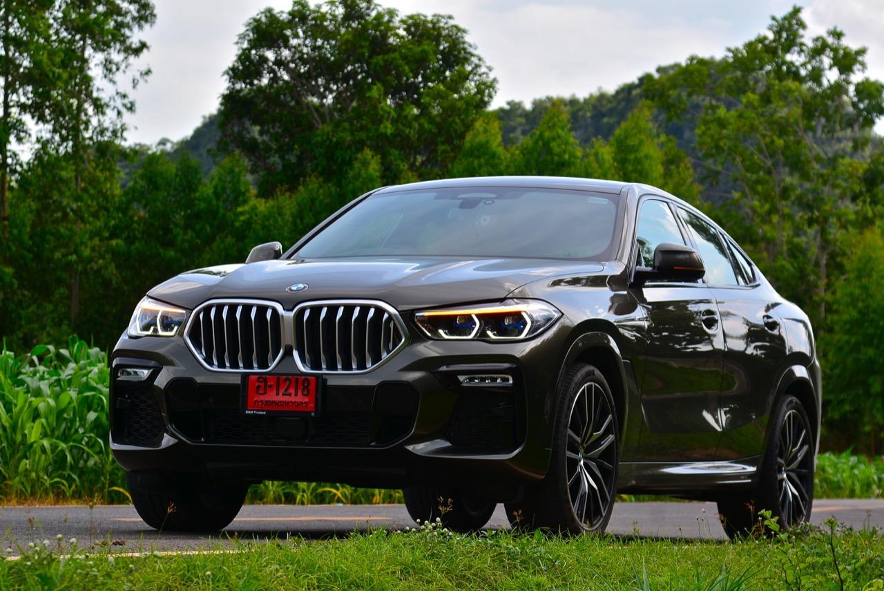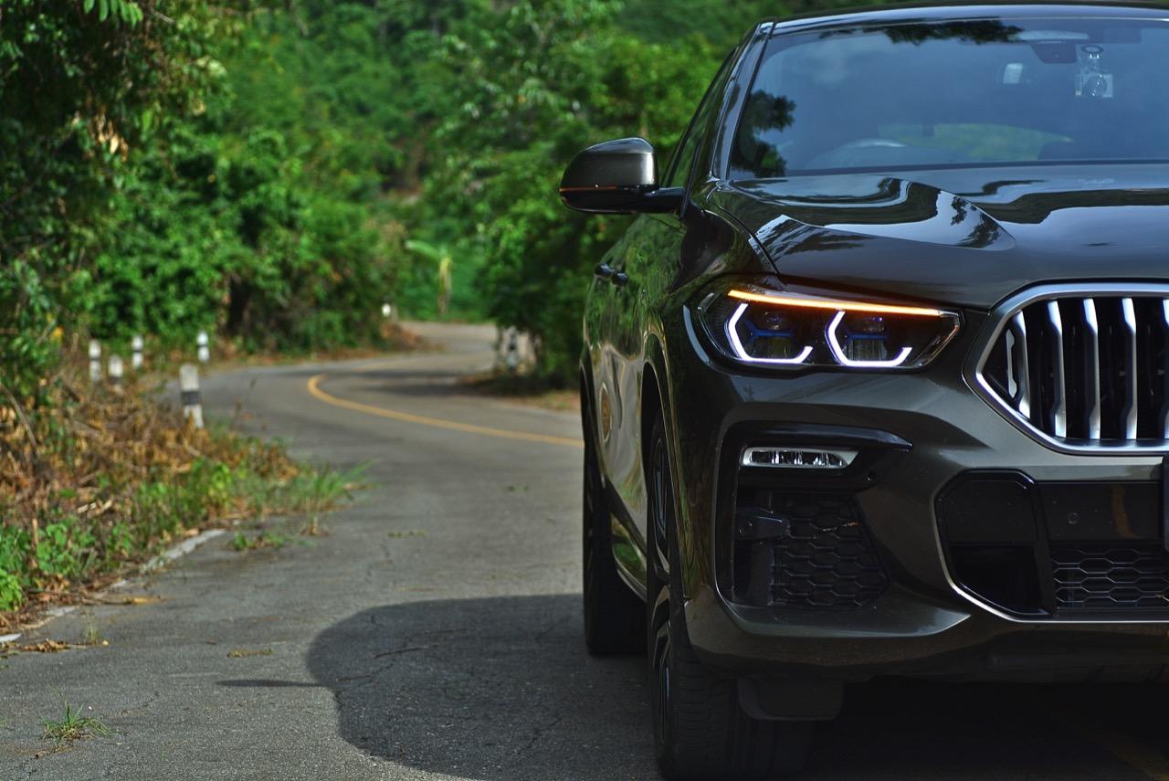 BMW X6 เจนเนอเรชั่นที่ 3 รหัสตัวถัง G06 รุ่น xDRIVE 30d M Sport สี Manhattan Green Metallic ยิ่งดูใกล้ๆ ก็ยิ่งทำให้นึกถึงแฮตชแบคทรงล้ำอนาคตที่ถูกขยายสัดส่วนทั้งความกว้าง ความยาว ส่วนความสูงลดลงเล็กน้อย ไฟหน้าและกระจังหน้าที่เป็นเอกลักษณ์ของรุ่นนั้นสวยงามดุดันมากกว่าเดิม เทคโนโลยีที่ก้าวล้ำของหลอดไฟ LED ที่ทำงานร่วมกับเซนเซอร์ในระบบส่องสว่างแบบอัตโนมัติด้วยระบบไฟ BMW Laser Adaptive LED ภายในกรอบไฟหน้าตกแต่งด้วยพลาสติกสีฟ้าที่มีรูปทรงคล้ายก้างปลา กระจังหน้าพร้อมระบบเปิด-ปิดอัตโนมัติ เมื่อเครื่องยนต์มีอุณหภูมิต่ำ กระจังจะปิดเพื่อกั้นไม่ให้กระแสลมไหลผ่าน ซึ่งทำให้แรงต้านอากาศลดลง กระจังจะเปิดออกเองโดยอัตโนมัติ เมื่อเซนเซอร์ตรวจพบว่าอุณหภูมิของห้องเครื่องยนต์อยู่ในเกณฑ์ที่จะต้องระบายความร้อนอย่างรวดเร็ว กันชน M มีช่องรับอากาศขนาดใหญ่ บริเวณใต้กระจังหน้าและด้านข้างของชุดกันชนทั้งสองฝั่ง แม้จะไม่ค่อยมีความจำเป็น เนื่องจากระบบไฟ LED นั้นสว่างมาก แต่ BMW ก็ยังติดตั้งไฟตัดหมอกมาให้ เพื่อเพิ่มความสว่างขณะขับบนถนนที่กำลังมีหมอกลงจัด รูปทรงด้านหน้าที่ว่างามและดุดัน ยังไม่เท่ากับการออกแบบส่วนท้ายที่สลับซับซ้อนสุดๆ รูปลักษณ์ที่โหดเหี้ยมของ X6 ใหม่ ส่วนหนึ่งเกิดจากความใหญ่ของกระจังหน้า ไฟหน้าและงานออกแบบกันชนหน้า M