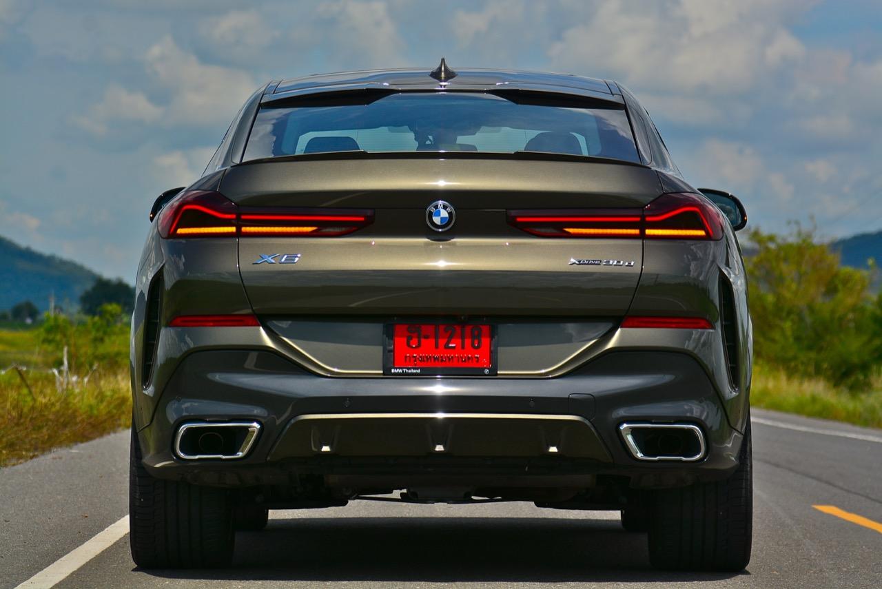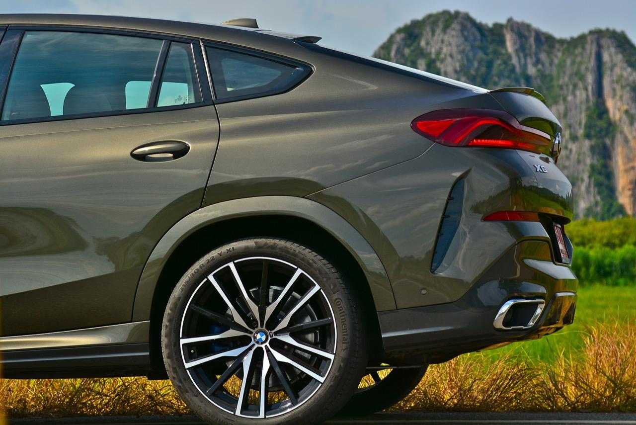 ล้ออัลลอยของ M ขนาดขอบ 22 นิ้ว เติมช่องเปิดบริเวณแก้มข้างที่เด่นชัด ห่อรัดด้วยยางสปอร์ตสมรรถนะสูง เพื่อทำให้ได้ประโยชน์จากการเพิ่มระดับของการยึดเกาะ เส้นหลังคาไหลลาดลงด้านหลัง ซึ่งลงท้ายด้วยความละเอียดอ่อน สปอยเลอร์ชิ้นเล็กๆ แปะติดกับขอบของฝาท้าย ซุ้มล้อหลังที่แผ่กว้างผสมผสานเข้ากับส่วนโค้งเว้าของการออกแบบกันชนหลัง บั้นท้ายของ X6 เป็นแบบแยกส่วนสองชั้นที่ใช้งานได้จริง มีการเพิ่มเติมความสวยงามด้วยการออกแบบไฟท้ายทรงยาวที่ขนานในแนวนอนไปกับขอบของฝาท้าย บั้นท้ายของมันยังได้รับการปรับปรุงประสิทธิภาพในด้านอากาศพลศาสตร์ ส่วนที่ลงตัวและซับซ้อนมากที่สุดก็คือ ฝาท้ายแนวของกันชนหลัง และแถบครีบรีดอากาศบริเวณชายล่างของกันชนหลัง ไฟท้าย LED รูปตัว L บางเฉียบ ประดับด้านบนของฝาท้ายโดยอยู่สูงเหนือท่อไอเสียทรงเหลี่ยม ซึ่งรวมอยู่ในแผงดิฟฟิวเซอร์ เป็นงานออกแบบที่ลงตัวและสวยงามไร้ที่ติ จุดนี้ BMW ทำออกมาได้ดีกว่าบั้นท้ายของรถคู่แข่ง