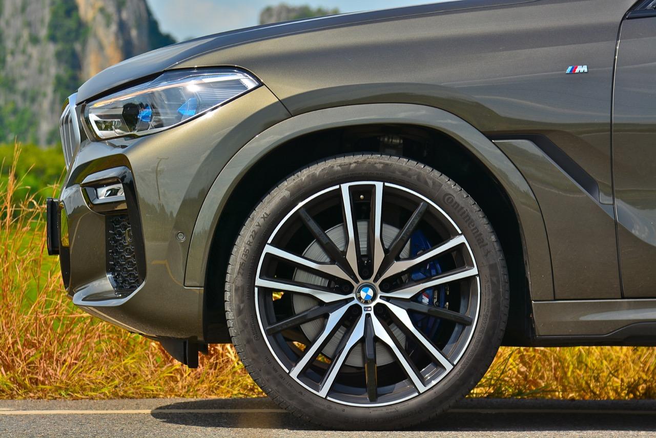 X6 xDRIVE 30d M Sport คันทดสอบ มีช่วงล่างธรรมดาสามัญ ไม่ใช่ Adaptive Air Suspension แต่ระบบรองรับของมัน กับกำลังในรูปของแรงบิดจากเครื่องดีเซลที่มากถึง 620 นิวตันเมตร ให้ความรู้สึกเหมือนขับรถคันเล็ก ช่วงล่างและชุดบังคับเลี้ยว อาจไม่คมและเนียนเท่า Audi Q8 55 TFSI แต่แชสซีที่อัดแน่นด้วยเทคโนโลยี กับโช้คที่มีค่าคงที่ ทำให้ X6 ใหม่ เกาะโค้งได้นิ่งสนิท จังหวะมุดเข้าโค้งมุมแคบ รถจะออกอาการเทอะทะเล็กน้อยพองาม ไม่ถึงกับเนียน เนื่องจากสัดส่วนความสูงสไตล์ SAV และแรงเหวี่ยงหนีศูนย์กลางที่เข้ามากระทำกับตัวรถ บางครั้งเมื่อลองเข้าโค้งแรงๆ จนทำให้รถเอียงวูบ ทำให้ผมเสียวสันหลังวาบอยู่เหมือนกัน ระยะของคันเร่งที่สั้นลงในโหมด Sport ทำให้ต้องระวังการเทแรงบิดเพลินๆจนมาถึงหัวโค้ง เบรก M performance ช่วยลดความเร็วก่อนเข้าสู่โค้งได้ดี แต่น้ำหนักตัวของมันทำให้ผมต้องใช้เบรกเร็วขึ้นกว่าเดิม เวลาออกตัวแบบกดจนสุด มีความรู้สึกว่าหน้ารถเชิดขึ้นเล็กน้อย เนื่องจากแรงบิด 620 นิวตันเมตรที่เทลงไปบนล้อ ชุดขับสี่ xDRIVE พวงมาลัยไฟฟ้าและช่วงล่างแจ่มๆ ช่วยทำให้การวิ่งเร็วบนไฮเวย์เป็นเรื่องที่ง่ายดาย โดยเฉพาะตอนเร่งแซงซึ่งต้องมีการเปลี่ยนเลนสลับไปมา รถมีอาการโคลงน้อยลง ช่วงล่างให้ความรู้สึกนิ่มกว่า X6 เจนเนอเรชั่นที่ 2 รวมถึงพวงมาลัยก็เลี้ยวได้อย่างต่อเนื่องและปราศจากอาการสับสน คุณจะรู้สึกปลอดภัยเมื่ออยู่ใน X6 ใหม่ ไม่ว่าจะเป็นขนาด ความสูง ระบบป้องกันต่างๆ และความแม่นของพวงมาลัย
