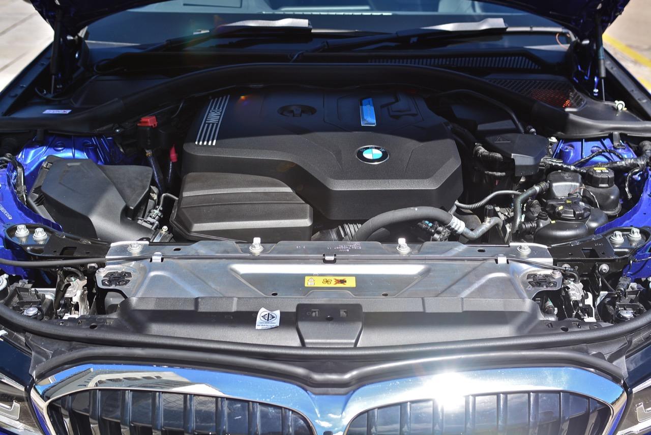 เครื่องยนต์เบนซิน 2.0 ลิตร เทอร์โบ อัพแรงม้าได้เท่ากับเครื่องยนต์ 6 สูบเรียงในอดีตที่ไม่มีระบบอัดอากาศ มาตรการเข้มในการลดขนาดของเครื่องยนต์ด้วยการลดจำนวนกระบอกสูบ เพื่อลดการปล่อยมลพิษ โดยปรับให้เครื่องยนต์กินเชื้อเพลิงเท่าที่จำเป็น คือประเด็นหลักในการคิดค้นเครื่องยนต์เบนซินรุ่นนี้ 330e คันทดสอบ ที่มีระบบปลั๊กอินไฮบริดพ่วงต่อนั้นวางเครื่องยนต์เบนซินแถวเรียง 4 กระบอกสูบ รหัส B48B20B ขนาด 2.0 ลิตร ปริมาตรความจุ 1,998 ซีซี. ระบบอัดอากาศเทคโนโลยี TwinPower Turbo ของ BMW ใช้เทอร์โบชาร์จเดี่ยวแบบ Twin-scroll ความกว้างกระบอกสูบ 82.0 มิลลิเมตร ช่วงชัก 94.6 มิลลิเมตร อัตราส่วนกำลังอัด 10.2:1 ระบบจ่ายเชื้อเพลิงแบบยิงตรง Direct injection กำลังสูงสุด 184 แรงม้า ที่ 5,000 – 6,500 รอบต่อนาที แรงบิดสูงสุดทำได้ที่ 300 นิวตันเมตร ที่ 1,550 – 4,400 รอบต่อนาที เป็นแรงบิดที่ราบเรียบและกว้างตั้งแต่รอบต่ำไปจนถึงเกือบ 5,000 รอบต่อนาที ระบบส่งกำลังใช้เกียร์อัตโนมัติฝังมอเตอร์ไฟฟ้าของ ZF รุ่น 8HP แบบ 8 สปีด พร้อมกลไกแมนวล Sport Steptronic ติดตั้งแป้นเปลี่ยนตำแหน่งเกียร์ Paddle Shift ที่พวงมาลัย เครื่องยนต์วางตามยาวในสไตล์ที่คุ้นเคยของ BMW และขับเคลื่อนด้วยล้อคู่หลัง ตัวเลขปล่อย Co2 เมื่อเครื่องยนต์และระบบไฮบริดทำงานพร้อมกันอยู่ที่ 37-43 กรัมต่อกิโลเมตร มาตรฐานมลพิษ EURO 6 ส่วนระบบปลั๊กอินไฮบริดของ 330e ประกอบด้วยแบตเตอรี่แบบใหม่ที่มีความจุ 10.79 kWh มากกว่าเดิมพอสมควร ส่วนมอเตอร์ไฟฟ้าที่ซ่อนตัวอยู่ในเกียร์ 8 สปีด หรือ Electric motor power มีกำลังรวม 113 แรงม้า พร้อมแรงบิดที่ปราศจากอาการรอรอบที่ 265 นิวตันเมตร