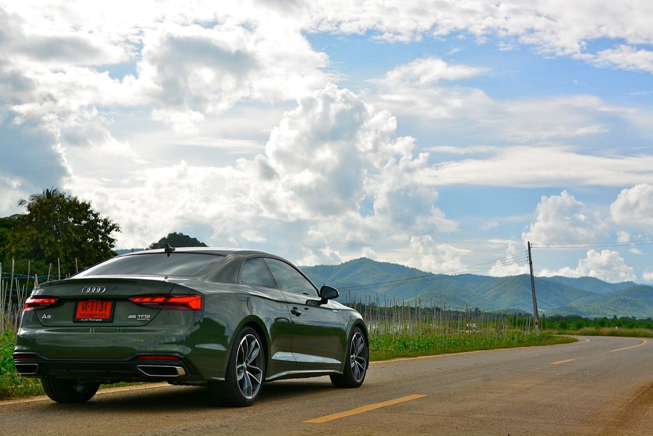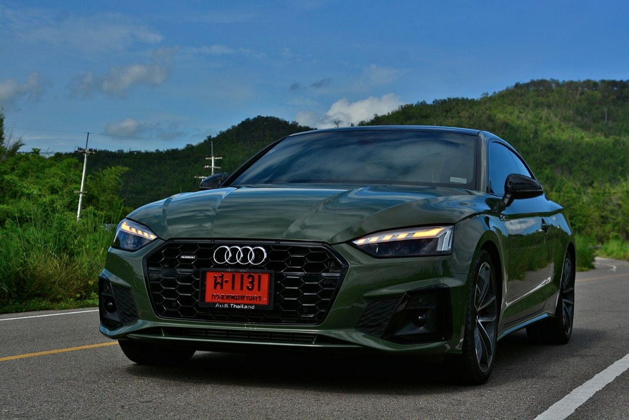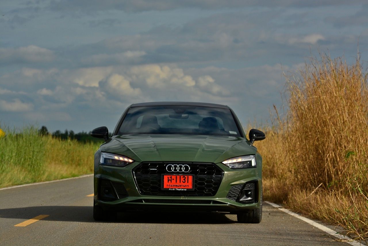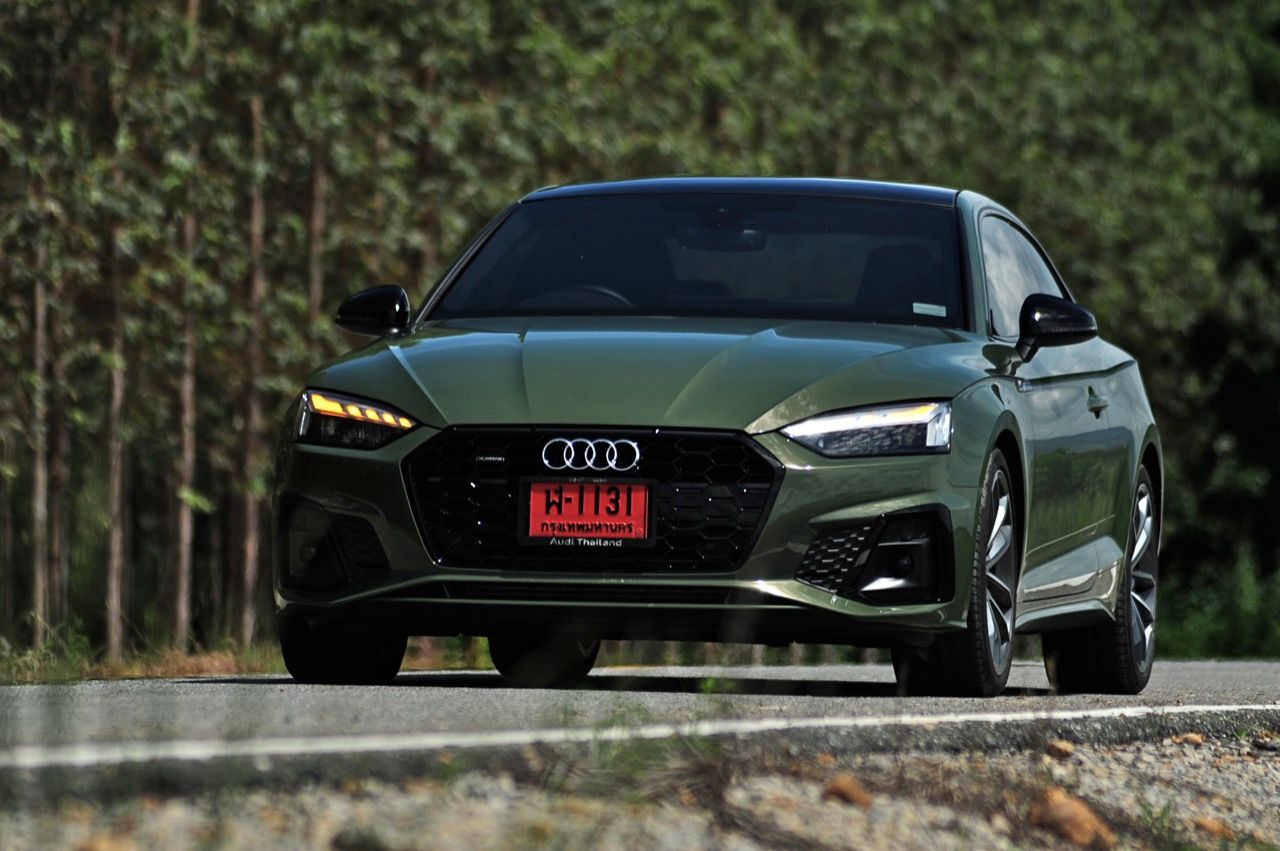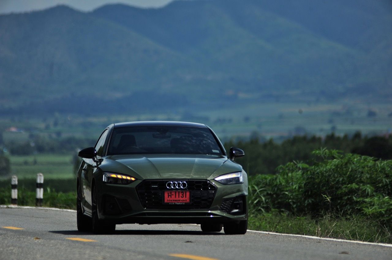 สีเขียว District Green ของ new A5 ทำให้มันกลายเป็นรถที่ดึงดูดสายตาของผู้คนรอบข้างมากเป็นพิเศษ นี่ถ้าขับเข้าไปในกรมทหาร สีเขียวแบบนี้น่าจะเหมาะสมกลมกลืนเป็นที่สุด ในเมือง เมื่อลองขับครั้งแรกด้วยโหมด Comfort เจ้า A5 Facelift รุ่น 45TFSi Quattro S Line พร้อมชุดแต่งของดำ Black Edition ราคา 3.6 ล้านบาท ให้ความรู้สึกที่ผ่อนคลายและเป็นมิตร นี่คือ Audi ที่มีตำแหน่งท่านั่งขับที่ลงตัวสุดๆ ระบบ MMI สามารถล้วงแคะแกะเกาเข้าไปดูฟังก์ชั่น หรือมือบอนเข้าไปปรับตั้งค่าต่างๆ ได้ง่ายสูสีกับสายหล่อ Coupe อย่าง BMW 4-Series และ Mercedes-Benz E-Coupe เครื่องเบนซิน 4 สูบ แถวเรียง อัดเทอร์โบ เมื่อขับในรอบต่ำวิ่งผ่านถนนบางบัวทอง-สุพรรณบุรี การใช้ความเร็วต่ำทำให้รถสี่ห่วงคันนี้ไม่สามารถสำแดงฤทธิ์เดชหรือตัวตนที่แท้จริงออกมาให้เห็น เนื่องจากสภาพการจราจรที่หนาแน่นบนถนน มีรถ 18 ล้อ วิ่งอยู่เต็มไปหมด ทำให้คันเร่งถูกใช้แบบค่อยเป็นค่อยไป พอพ้นช่วงแยกสองพี่น้องก็จะพบกับสภาพการจราจรท่ีเริ่มคล่องตัวมากขึ้น แม้จะเป็นรถสปอร์ตที่ไม่มีขอบบานกระจก แต่การเก็บเสียงที่ย่านความเร็วเดินถือว่าทำออกมาได้ดี ความเงียบของห้องโดยสารไม่แตกต่างไปจากรถคู่แข่ง น้ำหนักตัวที่เบาหวิวแค่ 1.5 ตัน นั้นเบาพอฟัดพอเหวี่ยงกับ Series-4 แต่เบาสุดๆ เมื่อเทียบกับ Mercedes Benz E200 AMG ซึ่งมีน้ำหนักตัวบานเบอะเฉียดๆ 1.7 ตัน พวงมาลัยในโหมดมาตรฐาน Comfort เบาสบายข้อมือ พวงมาลัยไฟฟ้าของ A5 ที่ความเร็วต่ำรู้สึกเบาอย่างชัดเจนถ้าคุณเพิ่งจะเดินลงมาจาก BMW