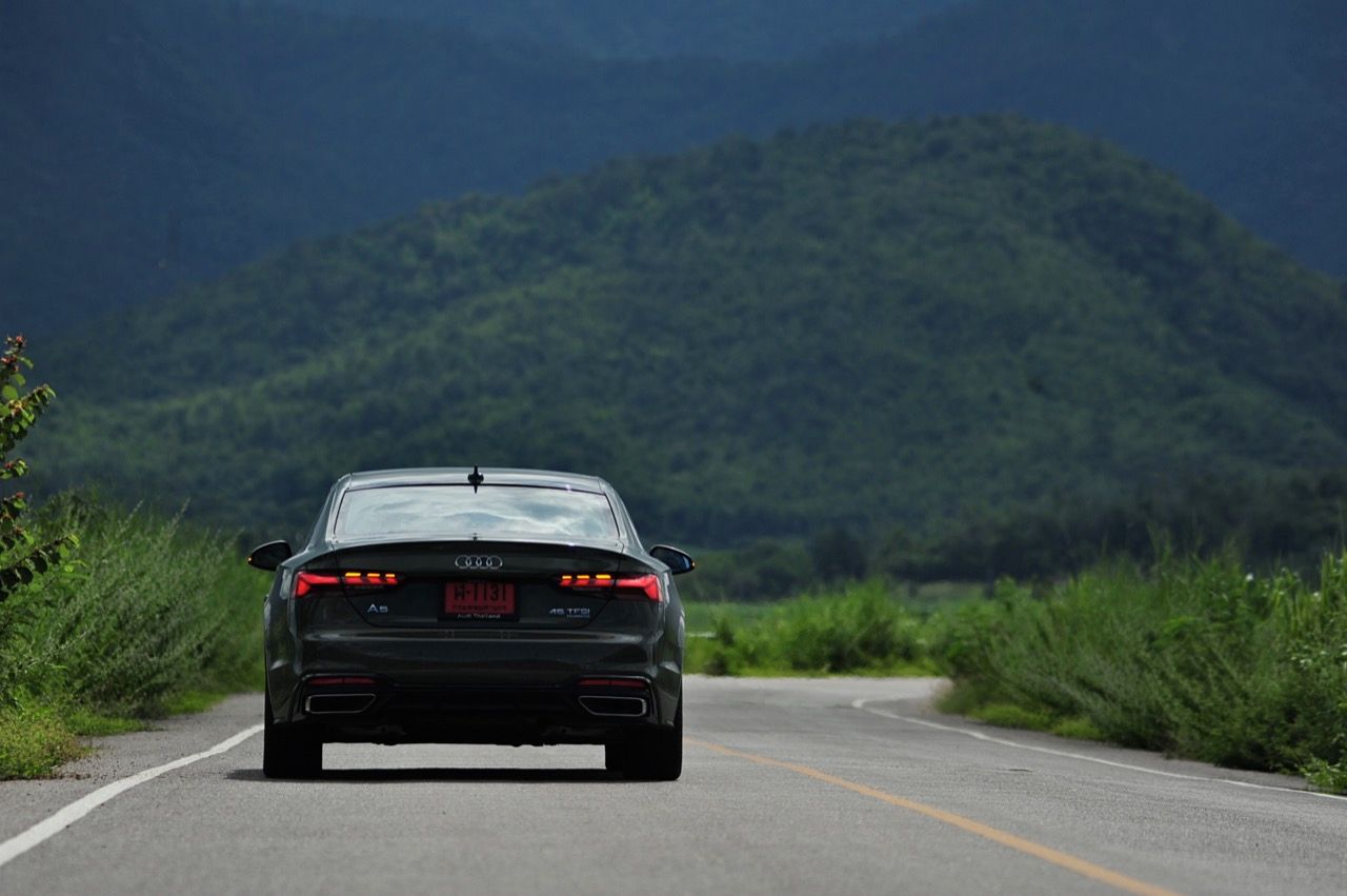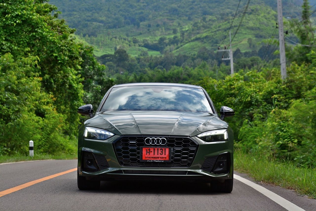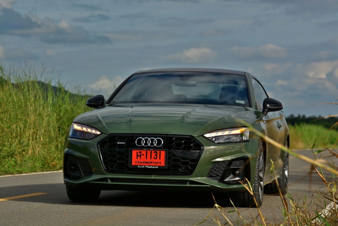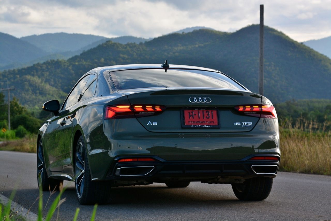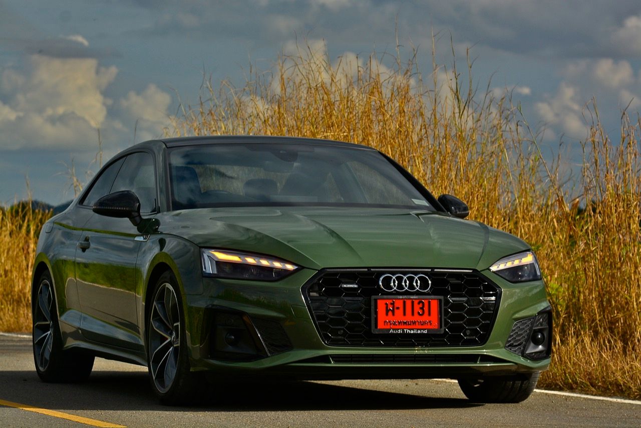 สีเขียว District Green ของ new A5 ทำให้มันกลายเป็นรถที่ดึงดูดสายตาของผู้คนรอบข้างมากเป็นพิเศษ นี่ถ้าขับเข้าไปในกรมทหาร สีเขียวแบบนี้น่าจะเหมาะสมกลมกลืนเป็นที่สุด ในเมือง เมื่อลองขับครั้งแรกด้วยโหมด Comfort เจ้า A5 Facelift รุ่น 45TFSi Quattro S Line พร้อมชุดแต่งของดำ Black Edition ราคา 3.6 ล้านบาท ให้ความรู้สึกที่ผ่อนคลายและเป็นมิตร นี่คือ Audi ที่มีตำแหน่งท่านั่งขับที่ลงตัวสุดๆ ระบบ MMI สามารถล้วงแคะแกะเกาเข้าไปดูฟังก์ชั่น หรือมือบอนเข้าไปปรับตั้งค่าต่างๆ ได้ง่ายสูสีกับสายหล่อ Coupe อย่าง BMW 4-Series และ Mercedes-Benz E-Coupe เครื่องเบนซิน 4 สูบ แถวเรียง อัดเทอร์โบ เมื่อขับในรอบต่ำวิ่งผ่านถนนบางบัวทอง-สุพรรณบุรี การใช้ความเร็วต่ำทำให้รถสี่ห่วงคันนี้ไม่สามารถสำแดงฤทธิ์เดชหรือตัวตนที่แท้จริงออกมาให้เห็น เนื่องจากสภาพการจราจรที่หนาแน่นบนถนน มีรถ 18 ล้อ วิ่งอยู่เต็มไปหมด ทำให้คันเร่งถูกใช้แบบค่อยเป็นค่อยไป พอพ้นช่วงแยกสองพี่น้องก็จะพบกับสภาพการจราจรท่ีเริ่มคล่องตัวมากขึ้น แม้จะเป็นรถสปอร์ตที่ไม่มีขอบบานกระจก แต่การเก็บเสียงที่ย่านความเร็วเดินถือว่าทำออกมาได้ดี ความเงียบของห้องโดยสารไม่แตกต่างไปจากรถคู่แข่ง น้ำหนักตัวที่เบาหวิวแค่ 1.5 ตัน นั้นเบาพอฟัดพอเหวี่ยงกับ Series-4 แต่เบาสุดๆ เมื่อเทียบกับ Mercedes Benz E200 AMG ซึ่งมีน้ำหนักตัวบานเบอะเฉียดๆ 1.7 ตัน พวงมาลัยในโหมดมาตรฐาน Comfort เบาสบายข้อมือ พวงมาลัยไฟฟ้าของ A5 ที่ความเร็วต่ำรู้สึกเบาอย่างชัดเจนถ้าคุณเพิ่งจะเดินลงมาจาก BMW