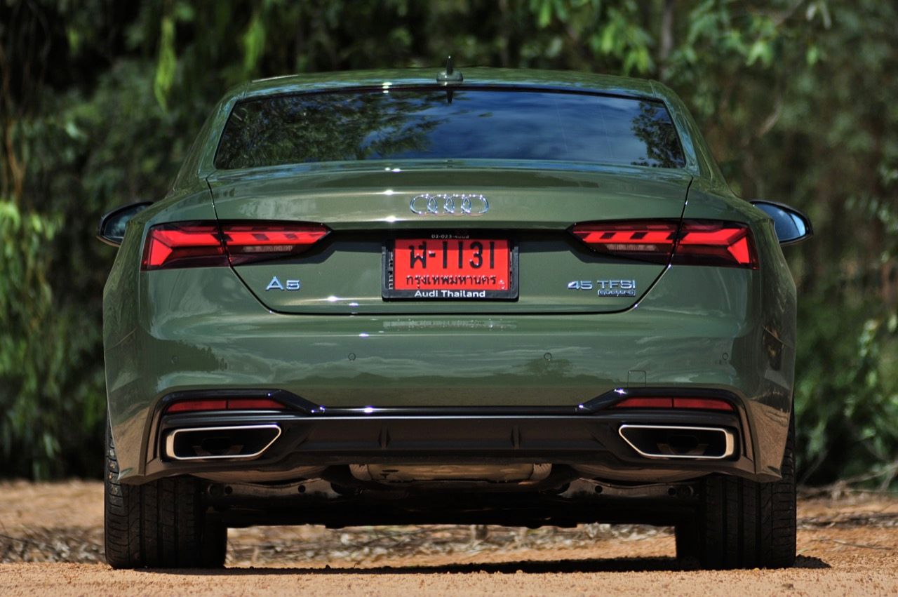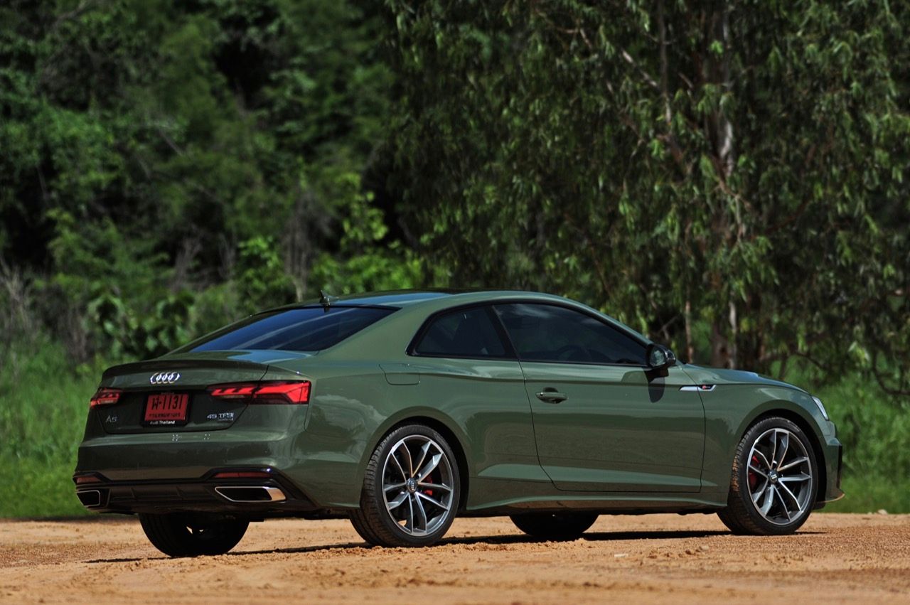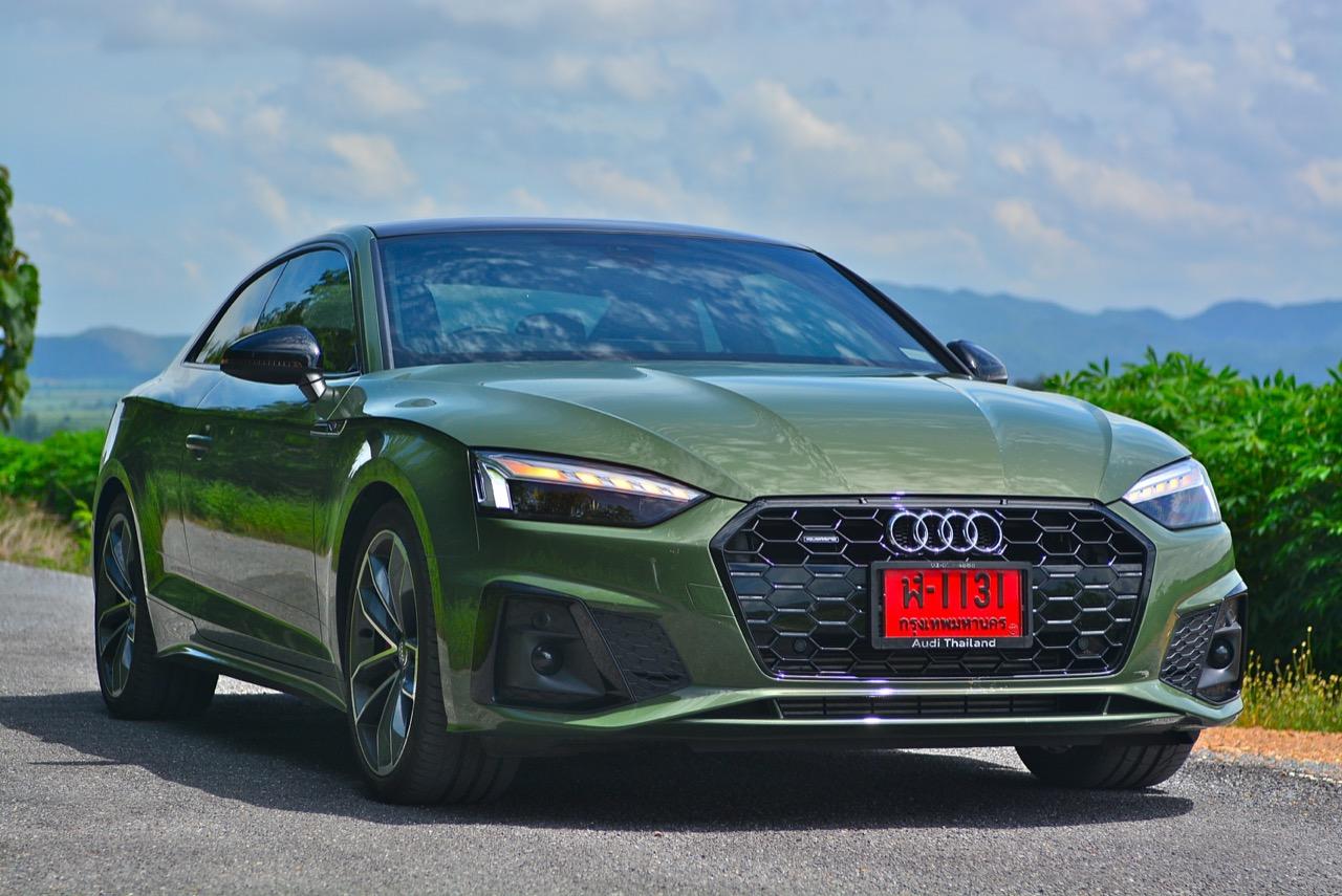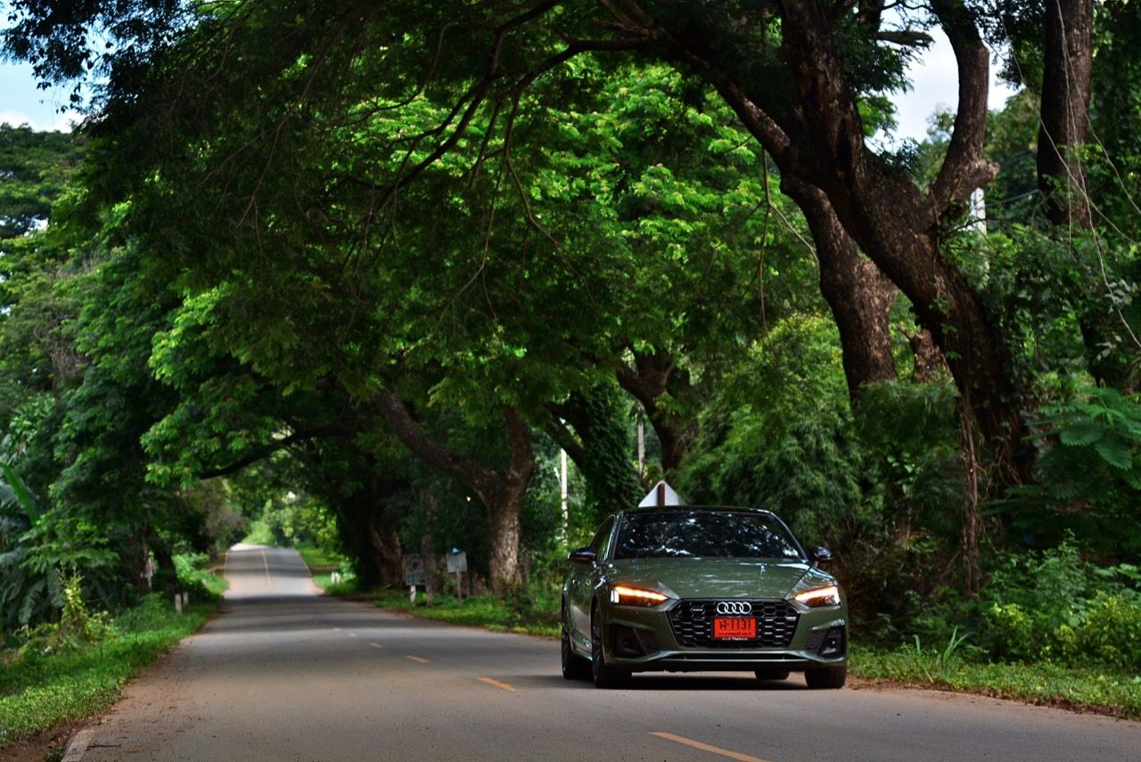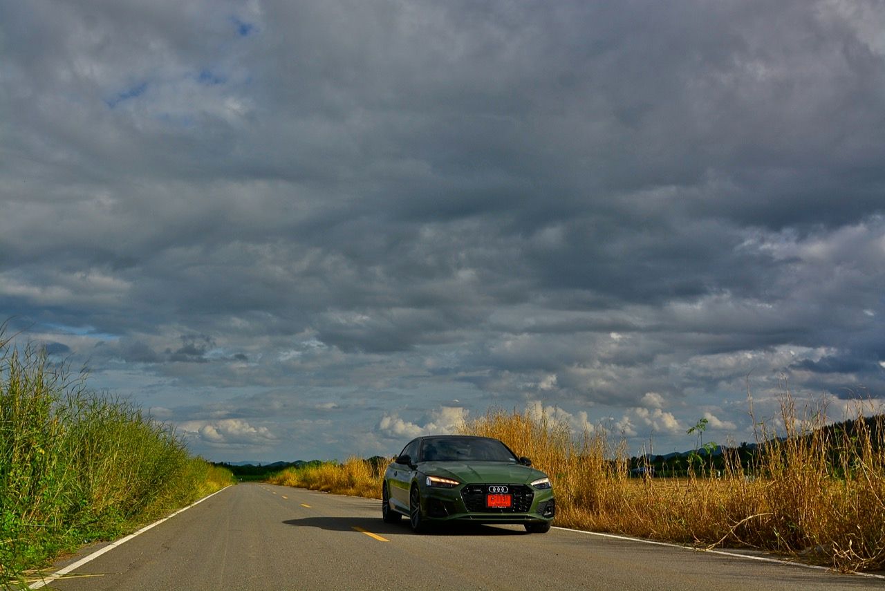 สีเขียว District Green ของ new A5 ทำให้มันกลายเป็นรถที่ดึงดูดสายตาของผู้คนรอบข้างมากเป็นพิเศษ นี่ถ้าขับเข้าไปในกรมทหาร สีเขียวแบบนี้น่าจะเหมาะสมกลมกลืนเป็นที่สุด ในเมือง เมื่อลองขับครั้งแรกด้วยโหมด Comfort เจ้า A5 Facelift รุ่น 45TFSi Quattro S Line พร้อมชุดแต่งของดำ Black Edition ราคา 3.6 ล้านบาท ให้ความรู้สึกที่ผ่อนคลายและเป็นมิตร นี่คือ Audi ที่มีตำแหน่งท่านั่งขับที่ลงตัวสุดๆ ระบบ MMI สามารถล้วงแคะแกะเกาเข้าไปดูฟังก์ชั่น หรือมือบอนเข้าไปปรับตั้งค่าต่างๆ ได้ง่ายสูสีกับสายหล่อ Coupe อย่าง BMW 4-Series และ Mercedes-Benz E-Coupe เครื่องเบนซิน 4 สูบ แถวเรียง อัดเทอร์โบ เมื่อขับในรอบต่ำวิ่งผ่านถนนบางบัวทอง-สุพรรณบุรี การใช้ความเร็วต่ำทำให้รถสี่ห่วงคันนี้ไม่สามารถสำแดงฤทธิ์เดชหรือตัวตนที่แท้จริงออกมาให้เห็น เนื่องจากสภาพการจราจรที่หนาแน่นบนถนน มีรถ 18 ล้อ วิ่งอยู่เต็มไปหมด ทำให้คันเร่งถูกใช้แบบค่อยเป็นค่อยไป พอพ้นช่วงแยกสองพี่น้องก็จะพบกับสภาพการจราจรท่ีเริ่มคล่องตัวมากขึ้น แม้จะเป็นรถสปอร์ตที่ไม่มีขอบบานกระจก แต่การเก็บเสียงที่ย่านความเร็วเดินถือว่าทำออกมาได้ดี ความเงียบของห้องโดยสารไม่แตกต่างไปจากรถคู่แข่ง น้ำหนักตัวที่เบาหวิวแค่ 1.5 ตัน นั้นเบาพอฟัดพอเหวี่ยงกับ Series-4 แต่เบาสุดๆ เมื่อเทียบกับ Mercedes Benz E200 AMG ซึ่งมีน้ำหนักตัวบานเบอะเฉียดๆ 1.7 ตัน พวงมาลัยในโหมดมาตรฐาน Comfort เบาสบายข้อมือ พวงมาลัยไฟฟ้าของ A5 ที่ความเร็วต่ำรู้สึกเบาอย่างชัดเจนถ้าคุณเพิ่งจะเดินลงมาจาก BMW