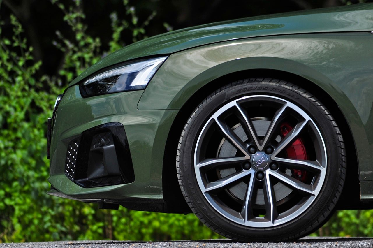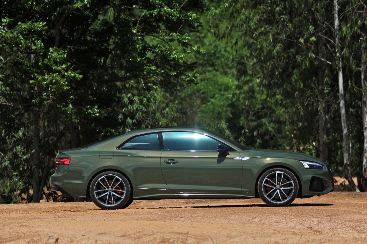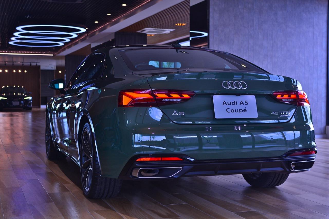 Audi A5 Coupe รุ่น 45TFSI Quattro S Line Black Edition วางเครื่องยนต์ขนาดกะทัดรัด เป็นเครื่องเบนซินแถวเรียง 4 กระบอกสูบ พ่วงกลไกระบบไฟฟ้าเสริม mild hybrid (MHEV) ขนาด 12 โวลต์ เครื่องยนต์เบนซินขนาดเล็ก ความจุ 2 ลิตร 1,984 ซีซี 4 วาล์วต่อสูบ พร้อมกลไกวาล์วแปรผัน Audi Valvelift system อัดอากาศด้วยเทอร์โบลูกเดี่ยวโดดๆ พร้อมอินเตอร์คูลเลอร์ ให้กำลัง 185 กิโลวัตต์ หรือ 249 แรงม้า ที่ 5,000-6,000 รอบต่อนาที แรงบิดจัดเต็ม ลงไปที่ล้อทั้งสี่ผ่านระบบ Quattro ด้วยตัวเลขแรงบิดระดับ 370 นิวตันเมตร ส่งกำลังด้วยเกียร์ออโต้ขับเคลื่อน 4 ล้อ S-Tronic 7 Speed ที่ต่อเชื่อมกับระบบขับเคลื่อน Quattro เวอร์ชั่นล่าสุด! สำหรับตัวเลขสมรรถนะนั้น A5 Coupe Facelift สามารถเร่งจาก 0-100 กิโลเมตรต่อชั่วโมงได้ในเวลาสั้นจู๋แค่ 5.8 วินาที (Mercedes Benz E300 AMG Dynamic ทำได้ 6.4 วินาที / BMW 420d M Sport ทำได้ 8 วินาที) โดยมีความเร็วสูงสุด 250 กิโลเมตรต่อชั่วโมง ระบบรองรับ ช่วงล่างด้านหน้าและหลังเป็นแบบ Five link มีชิ้นส่วนที่ทำจากโลหะอัลลอยผสมกับเหล็กเพื่อลดน้ำหนักใต้สปริง ทำให้ช่วงล่างของ A5 ให้ความรู้สึกที่เป็นกลางและเป็นธรรมชาติ การปรับตั้งค่าของโช้คอัพและสปริง ทำให้รถสามารถยึดเกาะกับถนนได้อย่างมีประสิทธิภาพ ระบบเบรก ด้านหน้าใช้เบรกแบบคาร์ลิปเปอร์อัลลอย 4 พอต พ่นสีแดงแต่ไม่มีตราสัญลักษณ์อะไรทั้งสิ้น ด้านหลังแบบซิงเกิลพอตพ่นสีแดงอีกเช่นกัน พร้อมจานเบรกแบบมีช่องระบายความร้อนกับตัวช่วยเบรก เช่นระบบเบรกป้องกันล้อล็อก ABS anti lock brake system ระบบกระจายแรงเบรก EBD electronic brake distribution ระบบป้องกันล้อหมุนฟรี ASR anti slip regulation และระบบควบคุมการทรงตัว ESC electronic control system with stability function
