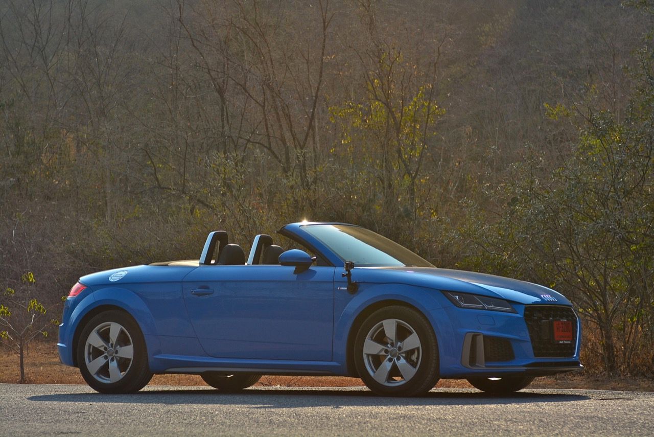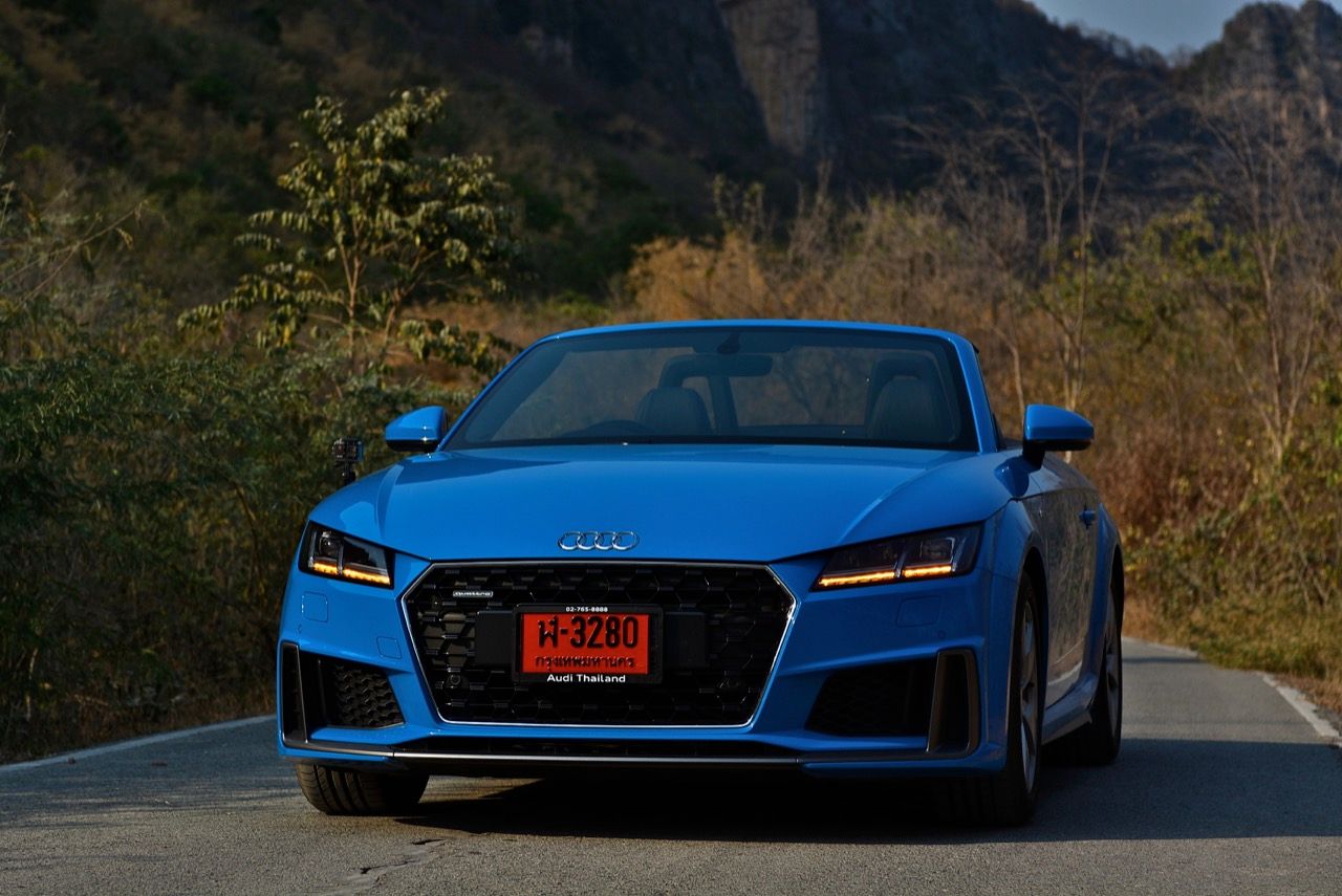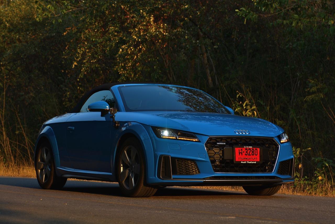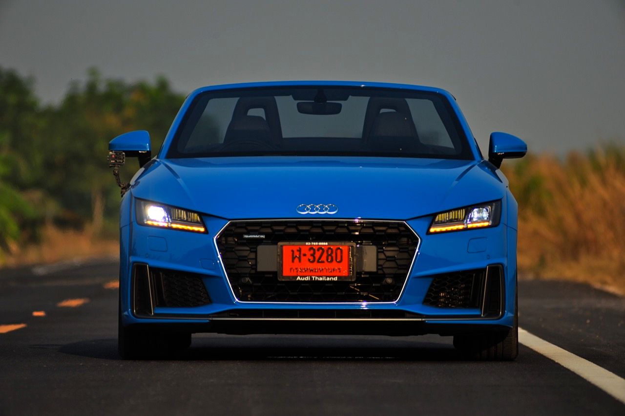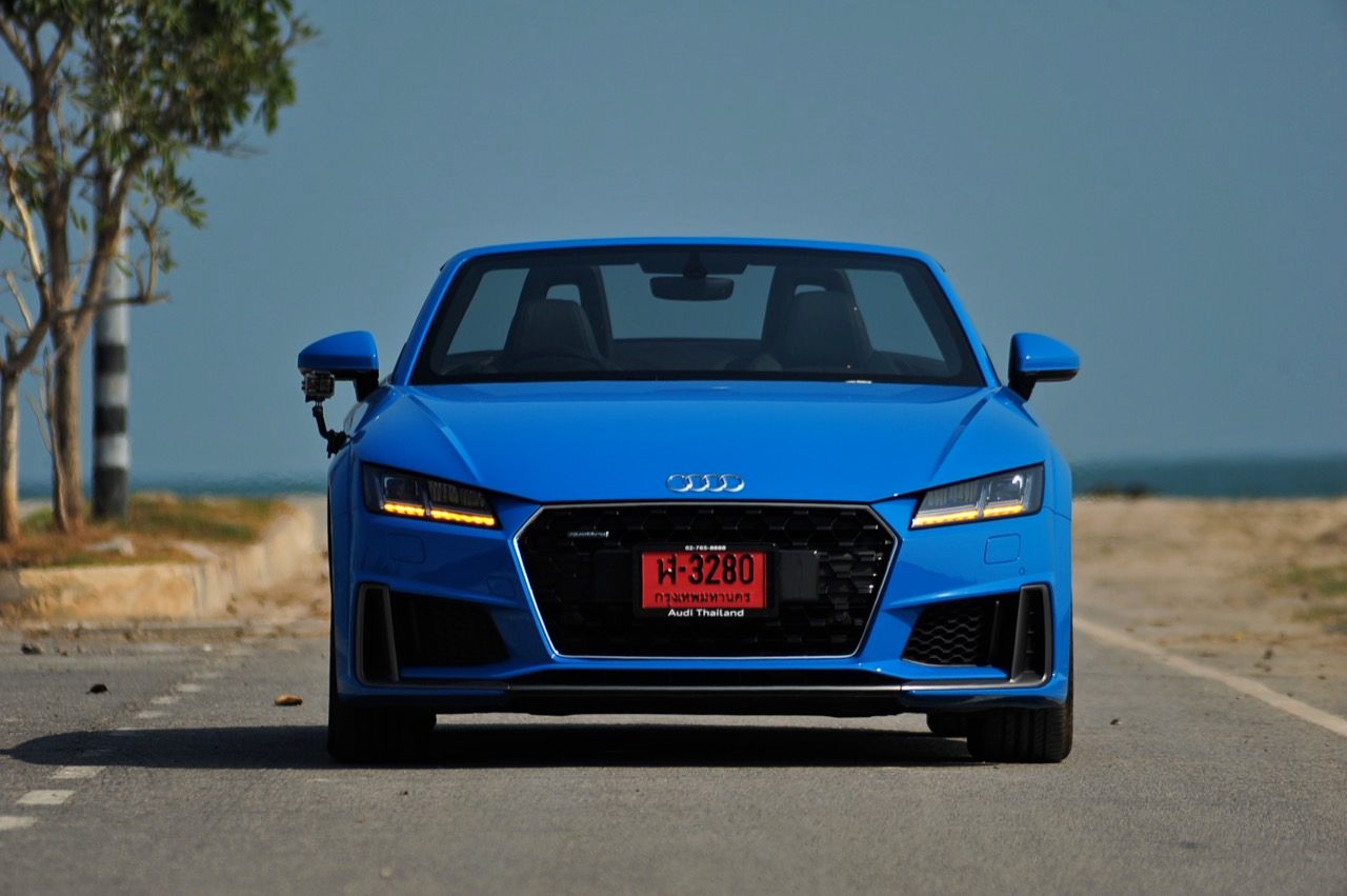 สีฟ้ากระจ่างตา Turbo blue solid (N6PA) TT Roadster เป็นรถเปิดหลังคาผลิตในเยอรมันที่มีค่าตัวถูกที่สุดเมื่อเทียบกับคู่แข่งอย่าง SLC300 / Z4 sDRIVE30i รวมถึง Porsche 718 Boxster ช่วงล่างและพวงมาลัยที่เชื่อมต่อกับระบบขับเคลื่อน 4 ล้อทำให้คุมรถได้ง่าย เกียร์ทำงานราบเรียบ เปลี่ยนอัตราทดเร็วและมีความกระชับ ตัวถังหนักกว่ารุ่น Coupe นิดเดียวทำให้เครื่องยนต์ 2.0 ลิตร เทอร์โบให้ความแรงและอัตราเร่งที่เพียงพอต่อความต้องการ ช่วงล่างเซ็ตมาดีมาก ช่วยลดอาการโคลงโดยไม่เพิ่มความกระด้างเมื่อวิ่งผ่านผิวทางที่ไม่เรียบ ตัวถังขนาดกะทัดรัดของ TT Roadster สัมพันธ์กับห้องโดยสารที่เล็กและแคบแต่ไม่ได้สร้างความรู้สึกอึดอัดเมื่อขับแบบปิดหลังคา ส่วนหลังคาผ้าใบความหนา 2 ชั้นทำงานด้วยไฟฟ้ามีการเปิด-ปิดที่รวดเร็วมากแค่ 10 วินาที ในการพับเก็บหรือกางออก