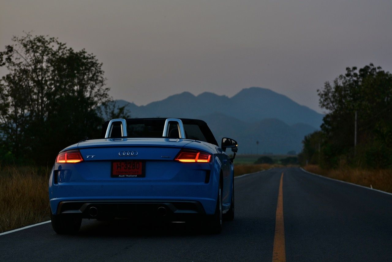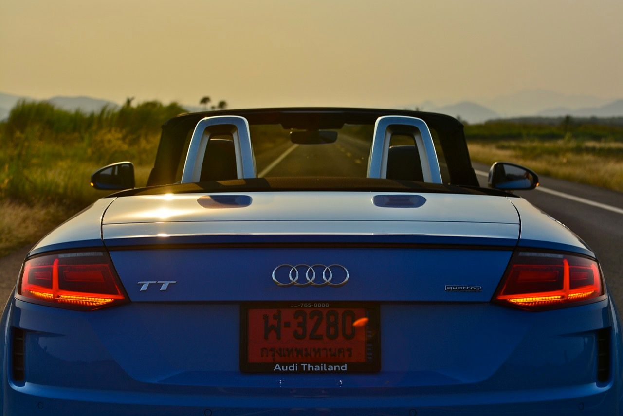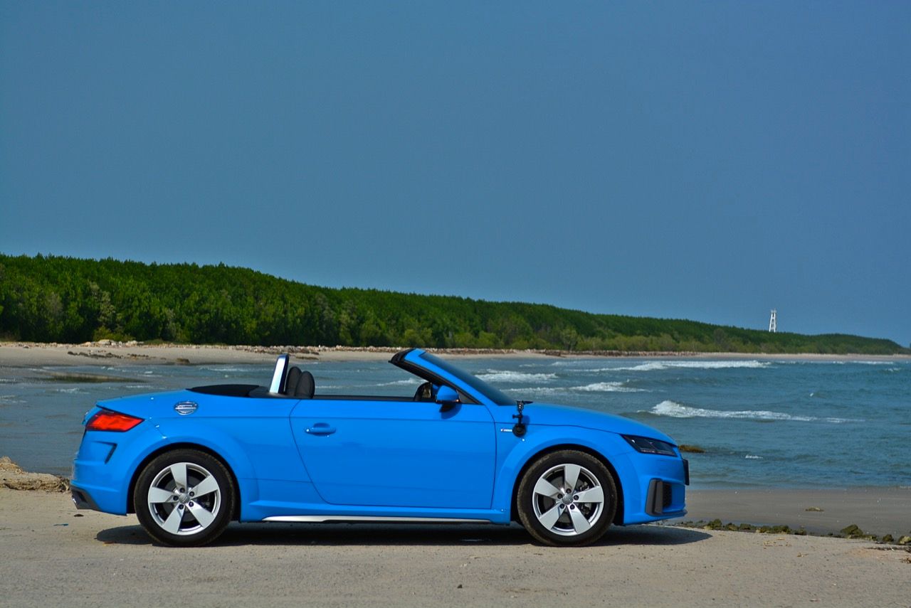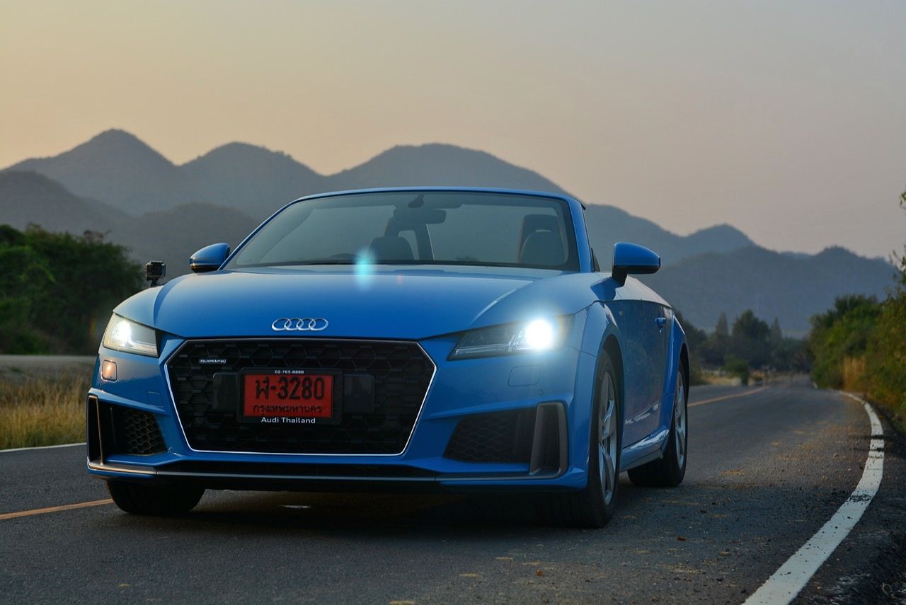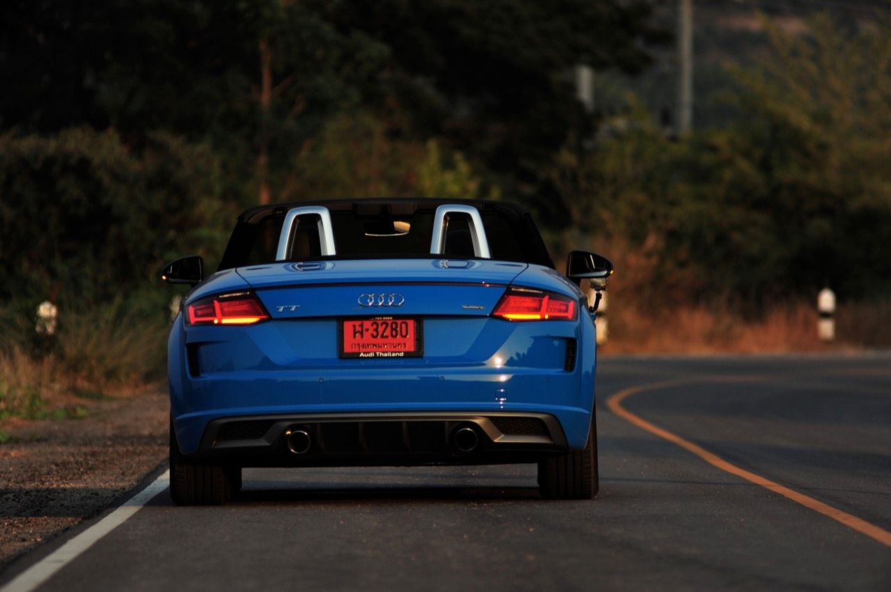 สีฟ้ากระจ่างตา Turbo blue solid (N6PA) TT Roadster เป็นรถเปิดหลังคาผลิตในเยอรมันที่มีค่าตัวถูกที่สุดเมื่อเทียบกับคู่แข่งอย่าง SLC300 / Z4 sDRIVE30i รวมถึง Porsche 718 Boxster ช่วงล่างและพวงมาลัยที่เชื่อมต่อกับระบบขับเคลื่อน 4 ล้อทำให้คุมรถได้ง่าย เกียร์ทำงานราบเรียบ เปลี่ยนอัตราทดเร็วและมีความกระชับ ตัวถังหนักกว่ารุ่น Coupe นิดเดียวทำให้เครื่องยนต์ 2.0 ลิตร เทอร์โบให้ความแรงและอัตราเร่งที่เพียงพอต่อความต้องการ ช่วงล่างเซ็ตมาดีมาก ช่วยลดอาการโคลงโดยไม่เพิ่มความกระด้างเมื่อวิ่งผ่านผิวทางที่ไม่เรียบ ตัวถังขนาดกะทัดรัดของ TT Roadster สัมพันธ์กับห้องโดยสารที่เล็กและแคบแต่ไม่ได้สร้างความรู้สึกอึดอัดเมื่อขับแบบปิดหลังคา ส่วนหลังคาผ้าใบความหนา 2 ชั้นทำงานด้วยไฟฟ้ามีการเปิด-ปิดที่รวดเร็วมากแค่ 10 วินาที ในการพับเก็บหรือกางออก