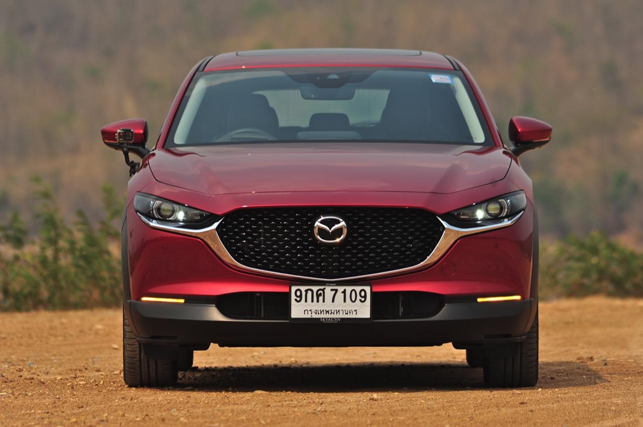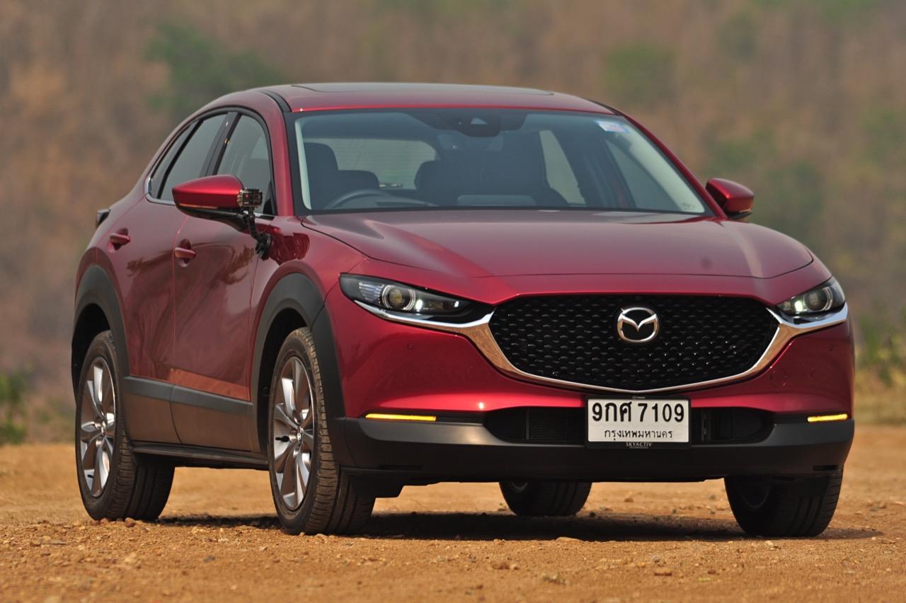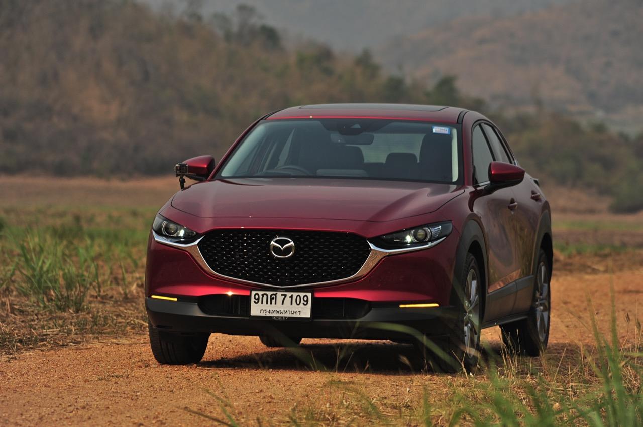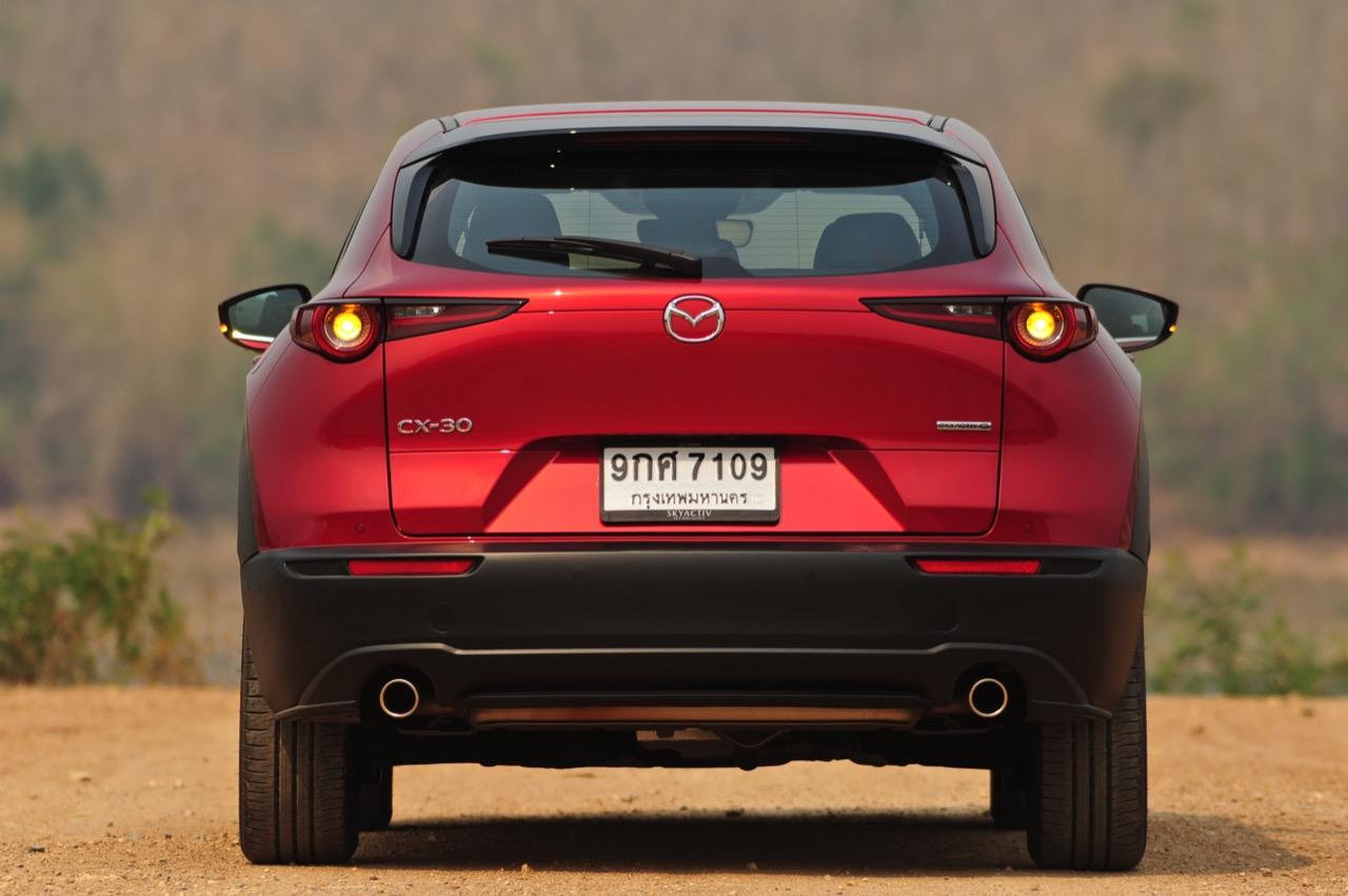 การมาถึงของ CX-30 ท่ามกลางสถานการณ์ การแพร่ระบาดของไวรัสโควิด-19 ทำให้ยอดขายของรถครอสโอเวอร์สายหล่อขับดีรุ่นนี้ ได้รับผลกระทบไปพอสมควร Mazda CX-30 รุ่น 2.0 SP ราคา 1,199,000 บาท ใช้แพลตฟอร์มใหม่ร่วมกับ New Mazda 3 แต่แตกต่างกันที่รูปลักษณ์ภายนอก งานตกแต่งภายในและรูปแบบของการใช้งาน ตัวถังถูกยกสูงมากกว่า Mazda CX-3 ใส่ระบบขับเคลื่อนของ Mazda 3 ใหม่ ไม่ว่าจะเป็นเครื่องยนต์และชุดส่งกำลัง ปรับแต่งระบบรองรับใหม่ให้แตกต่างไปจาก CX-3 รวมถึงพื้นที่ภายในที่กว้างขวางกว่า New Mazda 3 จุดเด่นของ CX-30 นอกจากจะขับได้ดีแล้ว มันยังเป็นรถที่ออกแบบได้อย่างเฉียบคมสมส่วน โดยภาพรวม Mazda CX-30 เป็นรถครอสโอเวอร์ไซส์เล็กที่ออกแบบได้อย่างลงตัวและงดงาม เสาหน้าเอนลาดด้วยองศาที่สมบูรณ์แบบและลงตัว ด้านข้างไหลลื่นแบบเรียบๆ ปราศจากคิ้วที่ทำให้ดูรก เสาท้ายออกแบบได้อย่างสวยงามสอดประสานไปกับผืนหลังคาที่ค่อยๆ ลาดเทลงไปยังส่วนท้าย ฝาท้ายแบบใหม่ทำงานด้วยระบบไฟฟ้า เมื่อเปิดออกแล้วพับเบาะหลังเพื่อขนสัมภาระก็จะได้พื้นที่เก็บของมากกว่า Mazda CX-3 สำหรับ CX-30 มีจุดที่น่ามองมากที่สุดก็คือดีไซน์ของไฟท้าย LED ที่ออกแบบได้อย่างลงตัวจากเส้นลากผ่านกลางระหว่างไฟท้ายทั้งซ้ายและขวา กันชนหลังเป็นชิ้นงานพลาสติกสีดำขนาดใหญ่เชื่อมโยงมาจากซุ้มล้อหลัง ท่อระบายไอเสียฝั่งละท่อที่เป็นของจริงไม่ใช่ท่อหลอกๆ ที่ตกแต่งเพื่อความสวยงาม