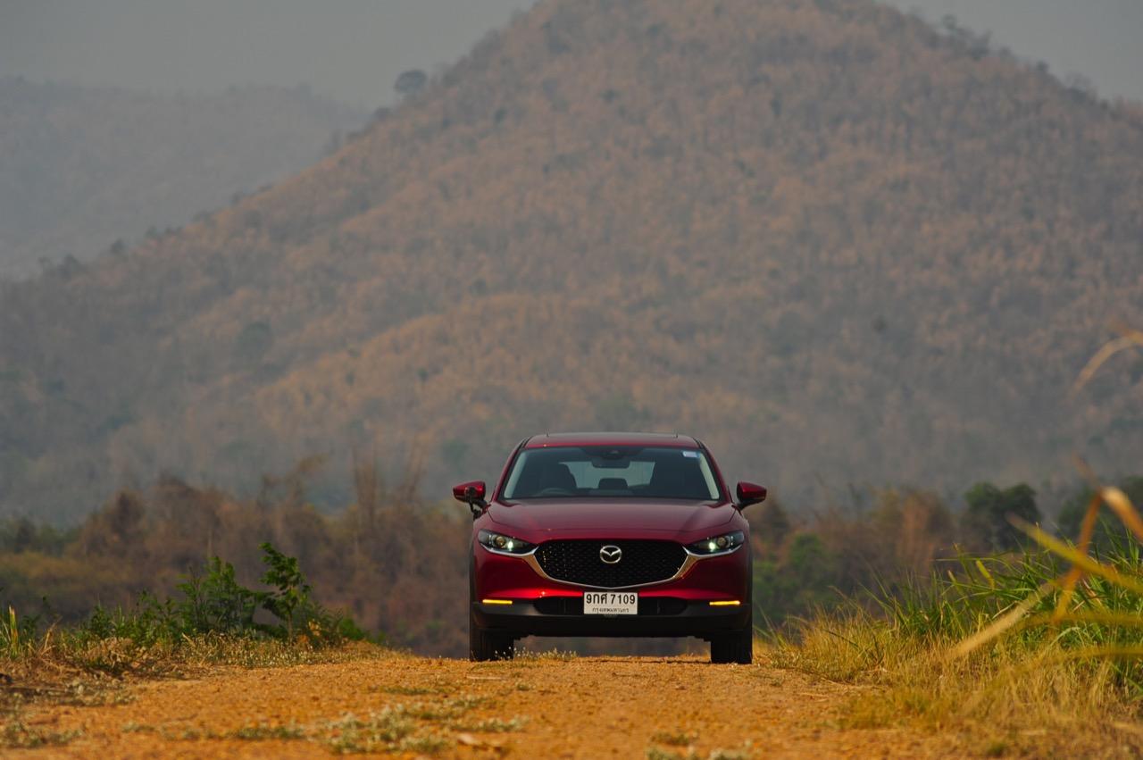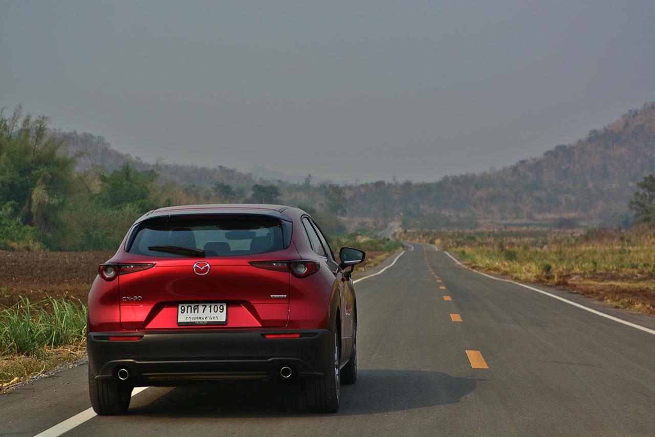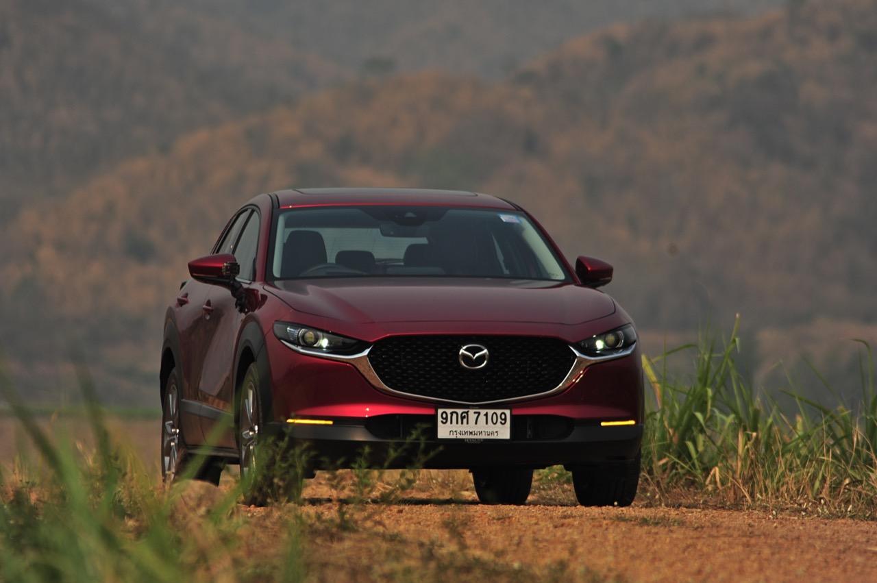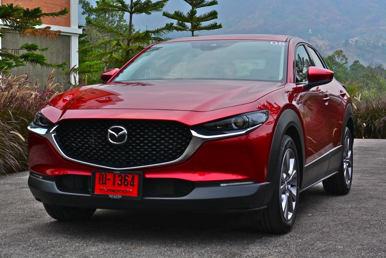 การมาถึงของ CX-30 ท่ามกลางสถานการณ์ การแพร่ระบาดของไวรัสโควิด-19 ทำให้ยอดขายของรถครอสโอเวอร์สายหล่อขับดีรุ่นนี้ ได้รับผลกระทบไปพอสมควร Mazda CX-30 รุ่น 2.0 SP ราคา 1,199,000 บาท ใช้แพลตฟอร์มใหม่ร่วมกับ New Mazda 3 แต่แตกต่างกันที่รูปลักษณ์ภายนอก งานตกแต่งภายในและรูปแบบของการใช้งาน ตัวถังถูกยกสูงมากกว่า Mazda CX-3 ใส่ระบบขับเคลื่อนของ Mazda 3 ใหม่ ไม่ว่าจะเป็นเครื่องยนต์และชุดส่งกำลัง ปรับแต่งระบบรองรับใหม่ให้แตกต่างไปจาก CX-3 รวมถึงพื้นที่ภายในที่กว้างขวางกว่า New Mazda 3 จุดเด่นของ CX-30 นอกจากจะขับได้ดีแล้ว มันยังเป็นรถที่ออกแบบได้อย่างเฉียบคมสมส่วน โดยภาพรวม Mazda CX-30 เป็นรถครอสโอเวอร์ไซส์เล็กที่ออกแบบได้อย่างลงตัวและงดงาม เสาหน้าเอนลาดด้วยองศาที่สมบูรณ์แบบและลงตัว ด้านข้างไหลลื่นแบบเรียบๆ ปราศจากคิ้วที่ทำให้ดูรก เสาท้ายออกแบบได้อย่างสวยงามสอดประสานไปกับผืนหลังคาที่ค่อยๆ ลาดเทลงไปยังส่วนท้าย ฝาท้ายแบบใหม่ทำงานด้วยระบบไฟฟ้า เมื่อเปิดออกแล้วพับเบาะหลังเพื่อขนสัมภาระก็จะได้พื้นที่เก็บของมากกว่า Mazda CX-3 สำหรับ CX-30 มีจุดที่น่ามองมากที่สุดก็คือดีไซน์ของไฟท้าย LED ที่ออกแบบได้อย่างลงตัวจากเส้นลากผ่านกลางระหว่างไฟท้ายทั้งซ้ายและขวา กันชนหลังเป็นชิ้นงานพลาสติกสีดำขนาดใหญ่เชื่อมโยงมาจากซุ้มล้อหลัง ท่อระบายไอเสียฝั่งละท่อที่เป็นของจริงไม่ใช่ท่อหลอกๆ ที่ตกแต่งเพื่อความสวยงาม