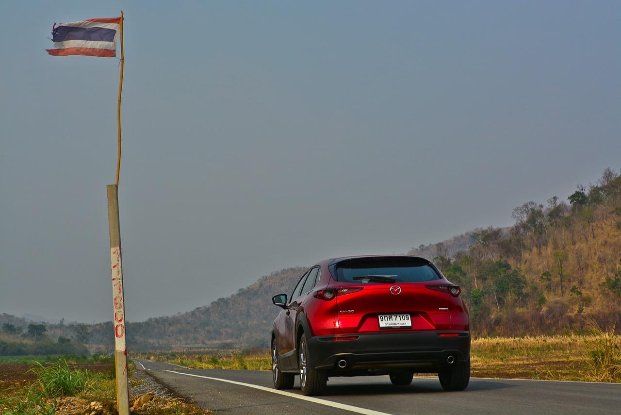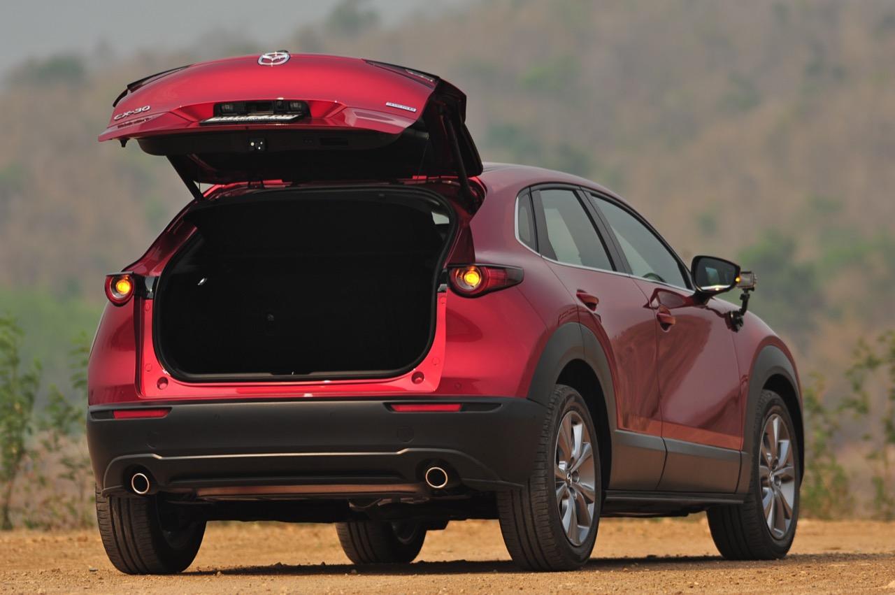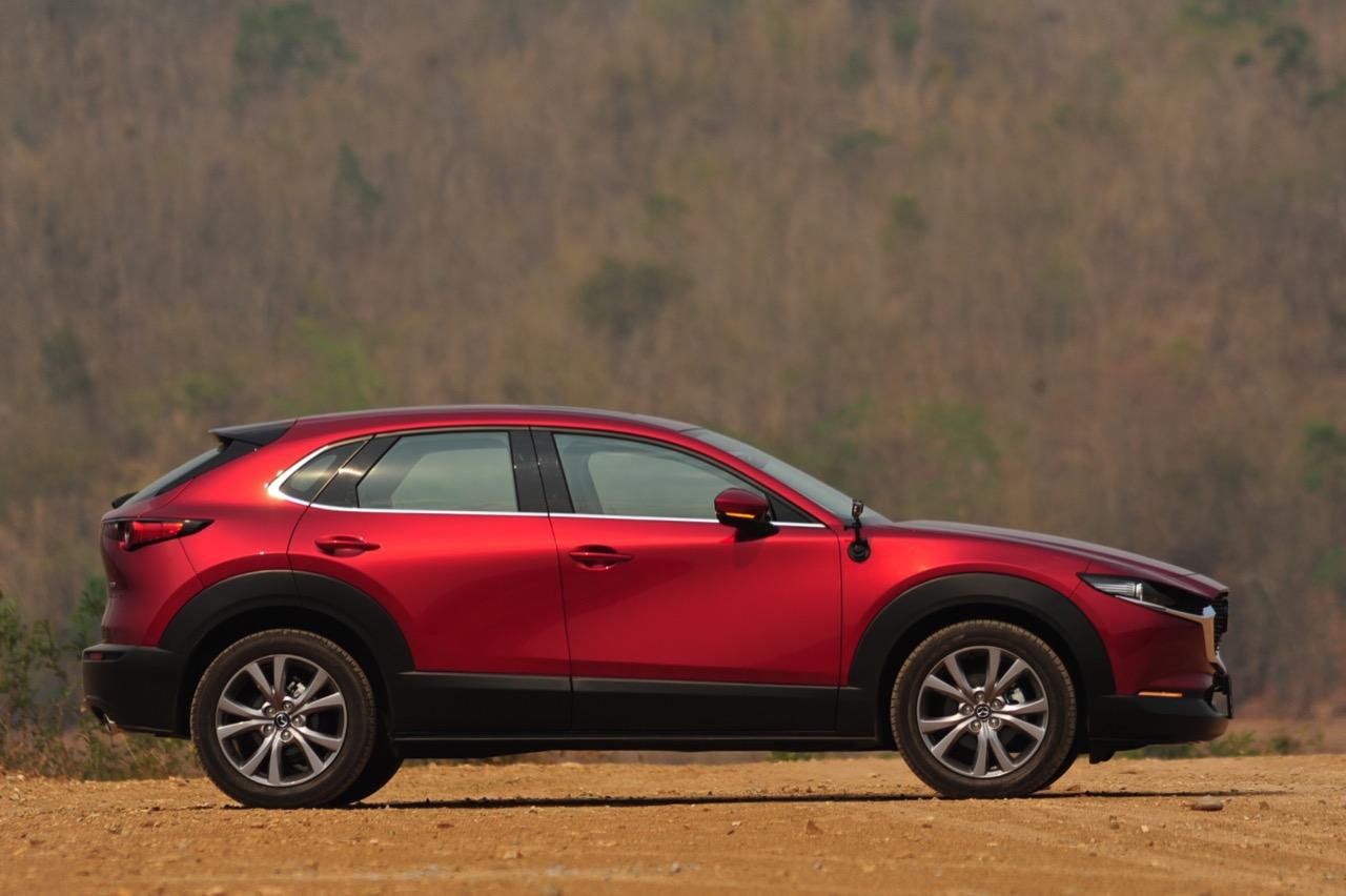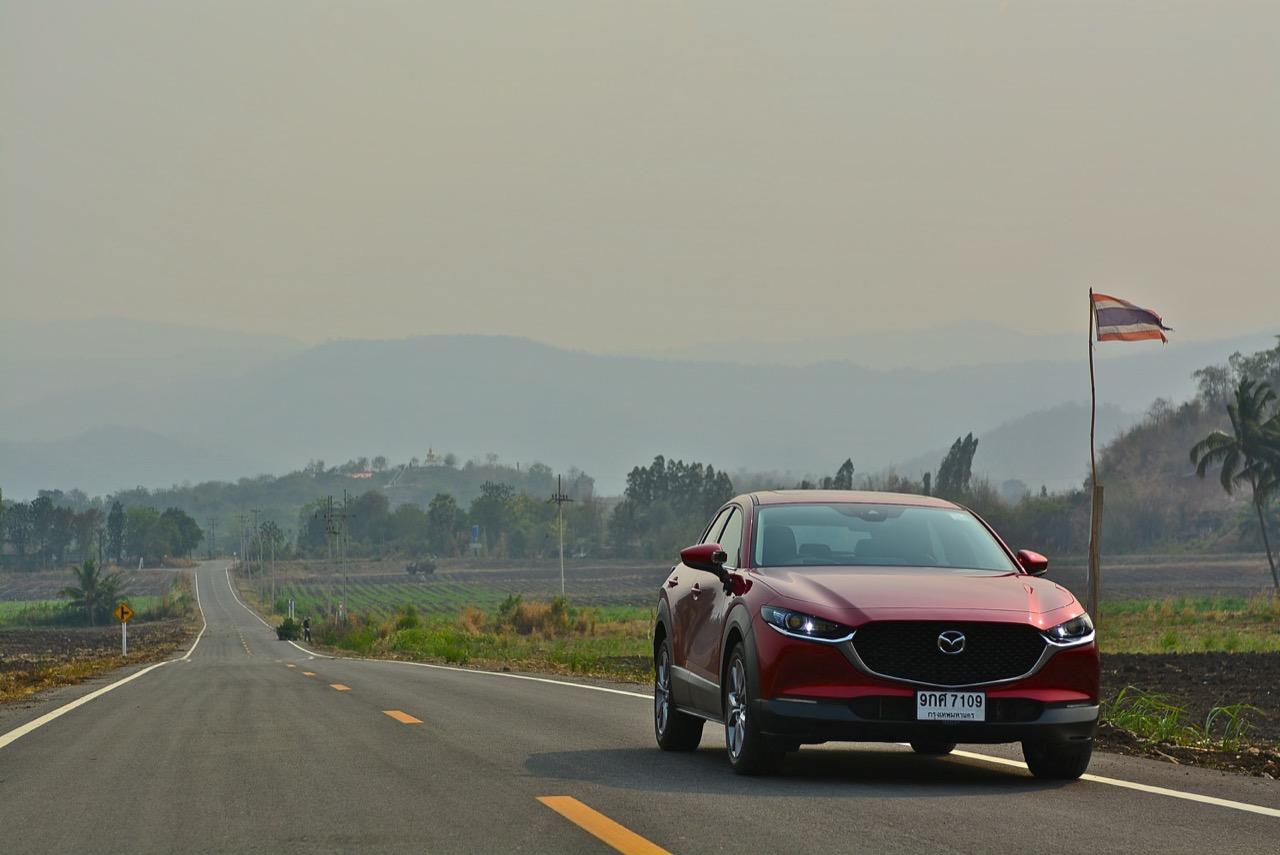 การมาถึงของ CX-30 ท่ามกลางสถานการณ์ การแพร่ระบาดของไวรัสโควิด-19 ทำให้ยอดขายของรถครอสโอเวอร์สายหล่อขับดีรุ่นนี้ ได้รับผลกระทบไปพอสมควร Mazda CX-30 รุ่น 2.0 SP ราคา 1,199,000 บาท ใช้แพลตฟอร์มใหม่ร่วมกับ New Mazda 3 แต่แตกต่างกันที่รูปลักษณ์ภายนอก งานตกแต่งภายในและรูปแบบของการใช้งาน ตัวถังถูกยกสูงมากกว่า Mazda CX-3 ใส่ระบบขับเคลื่อนของ Mazda 3 ใหม่ ไม่ว่าจะเป็นเครื่องยนต์และชุดส่งกำลัง ปรับแต่งระบบรองรับใหม่ให้แตกต่างไปจาก CX-3 รวมถึงพื้นที่ภายในที่กว้างขวางกว่า New Mazda 3 จุดเด่นของ CX-30 นอกจากจะขับได้ดีแล้ว มันยังเป็นรถที่ออกแบบได้อย่างเฉียบคมสมส่วน โดยภาพรวม Mazda CX-30 เป็นรถครอสโอเวอร์ไซส์เล็กที่ออกแบบได้อย่างลงตัวและงดงาม เสาหน้าเอนลาดด้วยองศาที่สมบูรณ์แบบและลงตัว ด้านข้างไหลลื่นแบบเรียบๆ ปราศจากคิ้วที่ทำให้ดูรก เสาท้ายออกแบบได้อย่างสวยงามสอดประสานไปกับผืนหลังคาที่ค่อยๆ ลาดเทลงไปยังส่วนท้าย ฝาท้ายแบบใหม่ทำงานด้วยระบบไฟฟ้า เมื่อเปิดออกแล้วพับเบาะหลังเพื่อขนสัมภาระก็จะได้พื้นที่เก็บของมากกว่า Mazda CX-3 สำหรับ CX-30 มีจุดที่น่ามองมากที่สุดก็คือดีไซน์ของไฟท้าย LED ที่ออกแบบได้อย่างลงตัวจากเส้นลากผ่านกลางระหว่างไฟท้ายทั้งซ้ายและขวา กันชนหลังเป็นชิ้นงานพลาสติกสีดำขนาดใหญ่เชื่อมโยงมาจากซุ้มล้อหลัง ท่อระบายไอเสียฝั่งละท่อที่เป็นของจริงไม่ใช่ท่อหลอกๆ ที่ตกแต่งเพื่อความสวยงาม