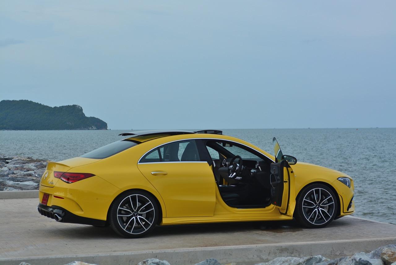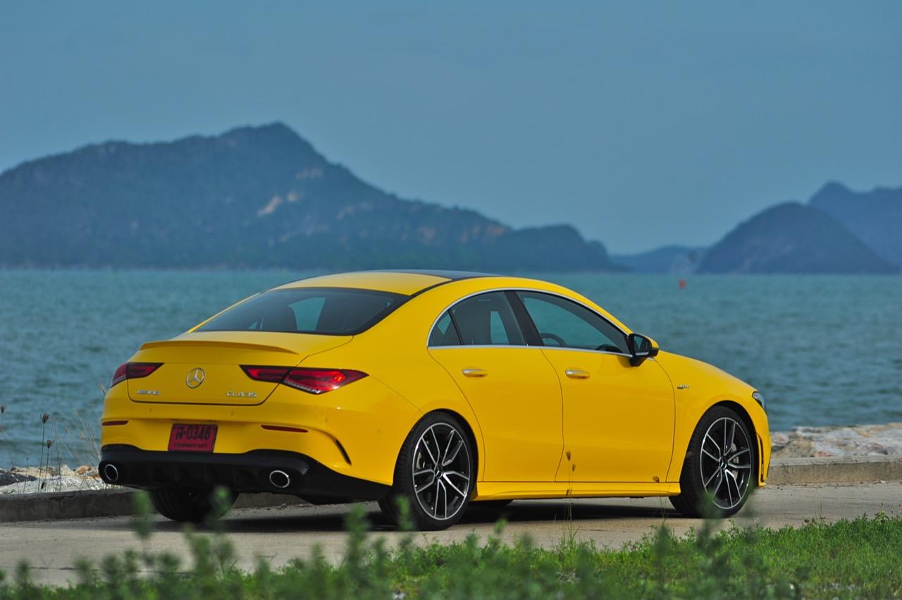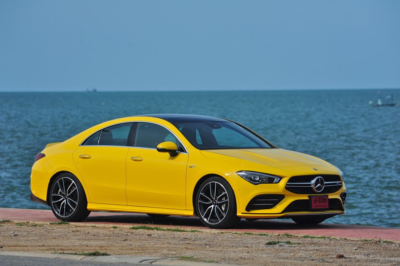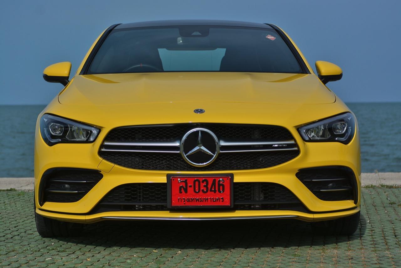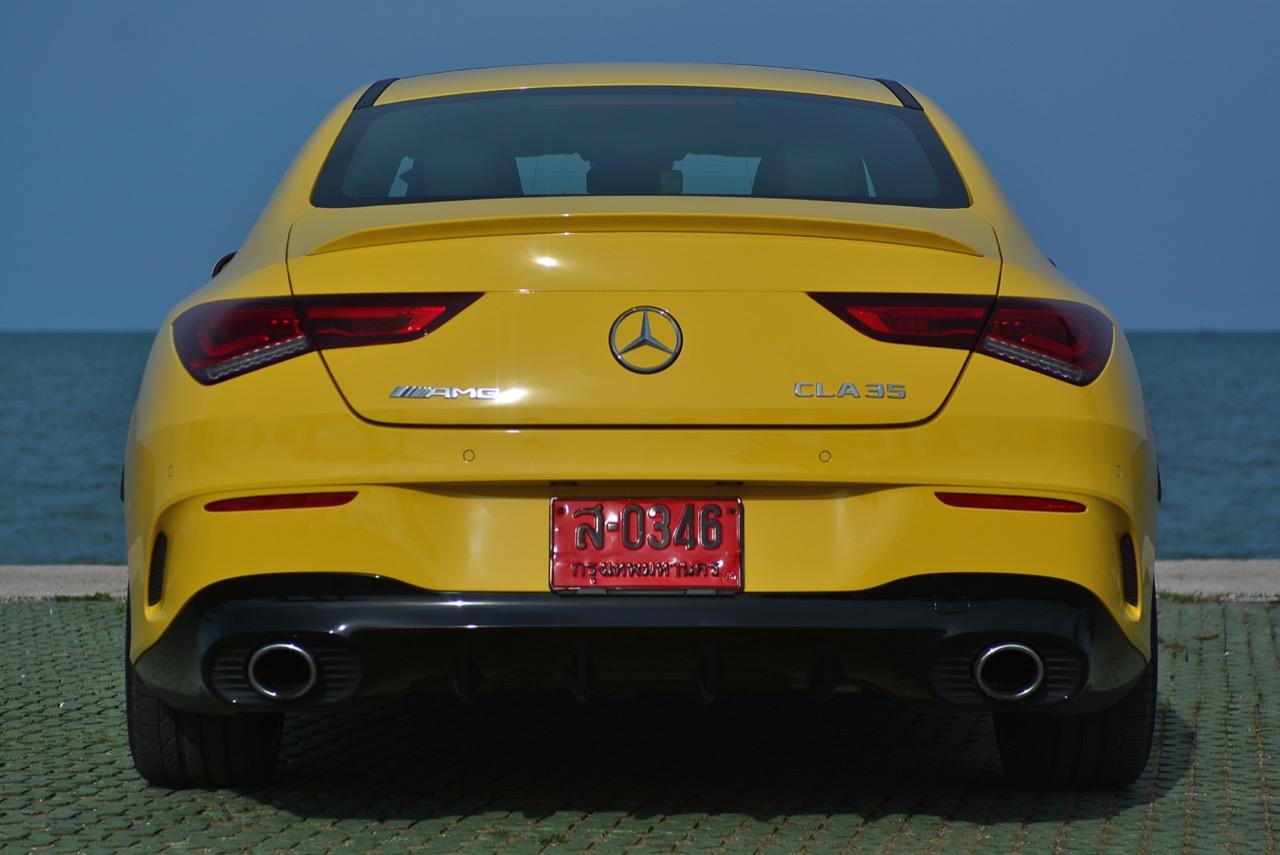 CLA ใหม่ ในเวอร์ชั่น 35 AMG เป็นรถคันเล็ก เครื่องเล็ก แรงม้าเยอะ และใช้ระบบขับเคลื่อน 4 ล้อ ด้วยกลไกไฟฟ้าในระบบ 4Matic ราคาขาย 3,999,000 บาท แพงเอาเรื่องอยู่เหมือนกัน แต่ก็นับว่าคุ้ม เมื่อเทียบกับประสิทธิภาพและความสนุกหลังพวงมาลัย CLA35 รหัสตัวถัง C118 ตัวถังสาดสีเหลือง เป็นสปอร์ตซีดานคันเล็กระดับเริ่มต้นของ Mercedes-AMG ส่วนรุ่นที่แรง และแพงกว่าอย่าง CLA45 ทำตลาดในไทยแบบควบคู่กันไปโดยมีให้สองทางเลือก ด้วยรูปแบบของนำเข้า และไม่มีการประกอบในประเทศทั้งสองรุ่น รวมถึงยังเป็นรถรุ่นพิเศษของ AMG ทำให้พี่น้อง Baby CLS มีราคาสูงพอสมควร CLA35 มี powerdomes บนฝากระโปรง กระจังหน้าคู่ louvre และช่องรับอากาศด้านหน้าแบบพิเศษ (พร้อมกับ "flics" บนช่องอากาศ) ระบบอากาศพลศาสตร์ที่ได้รับการขัดเกลาใหม่หมด ล้ออัลลอย AMG ลายใหม่คล้าย CLS53 ขนาด 19 นิ้ว สปอยเลอร์หลังขนาดเล็ก และปลายท่อทรงกลมทั้งสองฝั่งแบบรถแรงของ AMG ไฟหน้า LED High Performance headlamps พร้อมระบบไฟอัตโนมัติ มีกำลังในการส่องสว่างเพื่อเพิ่มทัศนวิสัยในตอนกลางคืน Mercedes-AMG ออกแบบชุดโคม LED โดยปรับให้หลอดกินกระแสไฟไม่มาก ใช้พลังงานต่ำในการส่องสว่าง ส่วนระบบเบรกของ CLA35 4MATIC ที่จะต้องรับมือกับกำลังกว่า 300 แรงม้า ได้รับการอัพเกรดปรับปรุงให้ทำงานได้เร็วขึ้น เบรกหน้าใช้คาลิปเปอร์ AMG 4 พอต จานดิสก์เบรกหน้ามีขนาดเส้นผ่าศูนย์กลาง 350 มิลลิเมตร เบรกหลังแบบคาลิปเปอร์ลูกสูบเดี่ยว จานเบรกหลังขนาด 330 มิลลิเมตร จานเบรกเจาะรูระบายความร้อนในขณะที่คาลิปเปอร์เบรกหน้าสีเงินแปะตัวอักษร AMG สีดำ พลังในการเบรกของ CLA35 ถือว่าทำได้ดี โดยเฉพาะการถ่ายเทน้ำหนักขณะเบรก ล้อ AMG มีลวดลายคล้ายกับ CLS53 ขนาด 19 นิ้ว ห่อรัดด้วยยางสปอร์ตของ Pirelli รุ่น P Zero ยางหน้าและหลังมีขนาดเท่ากันที่ 245/35 R19 93Y