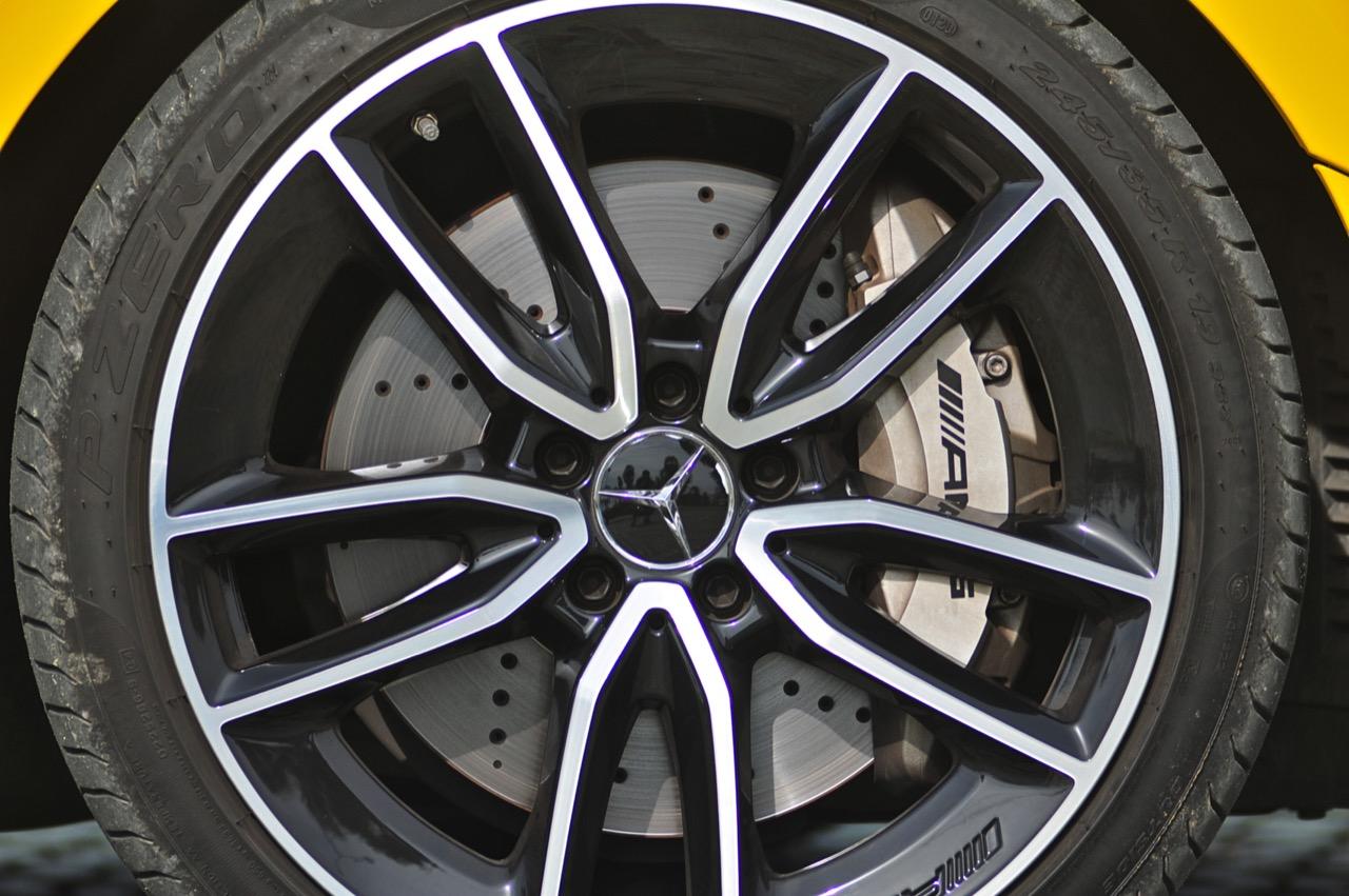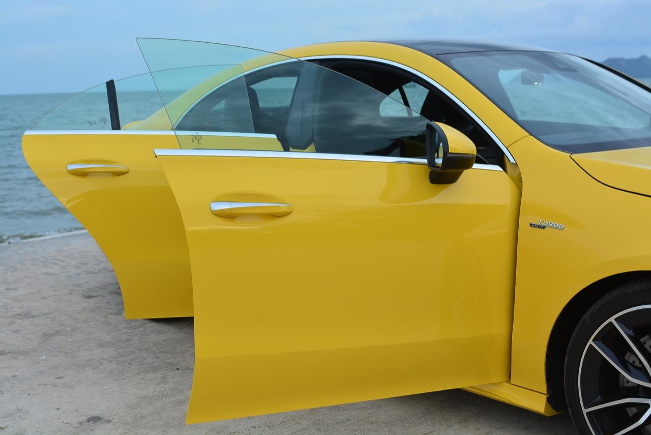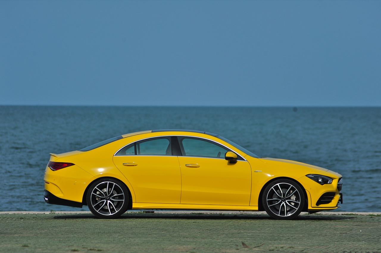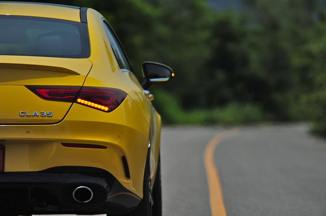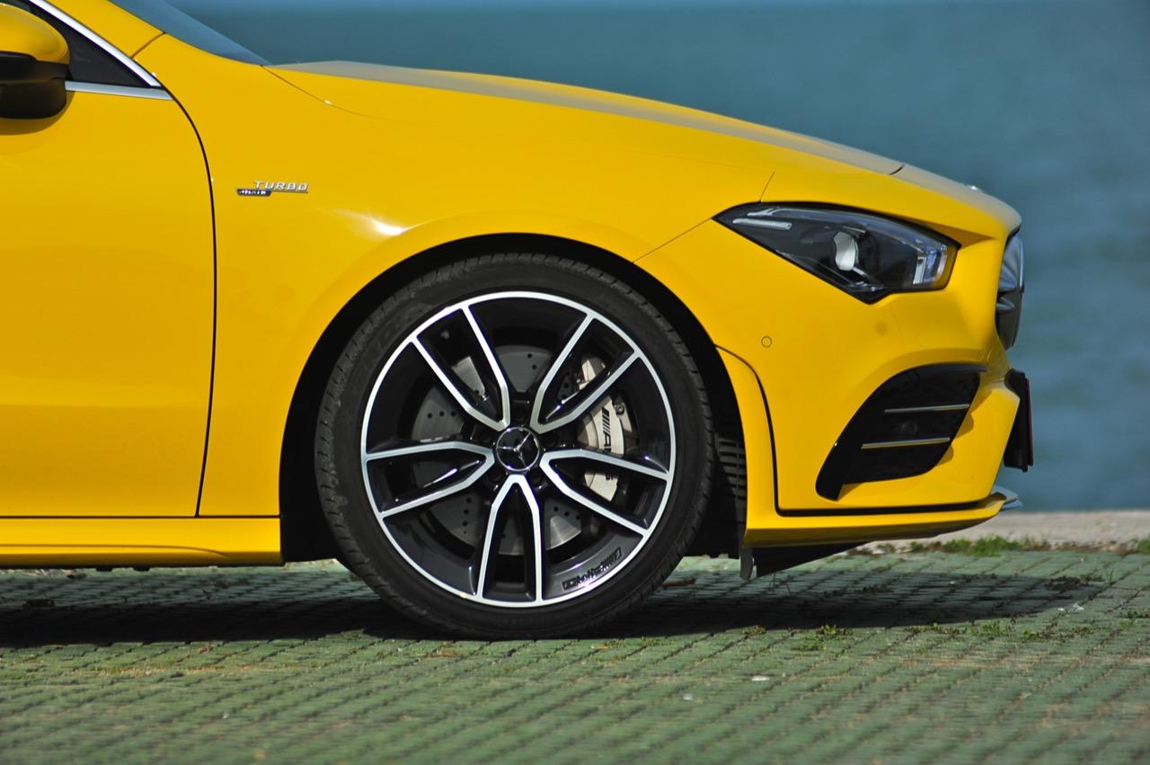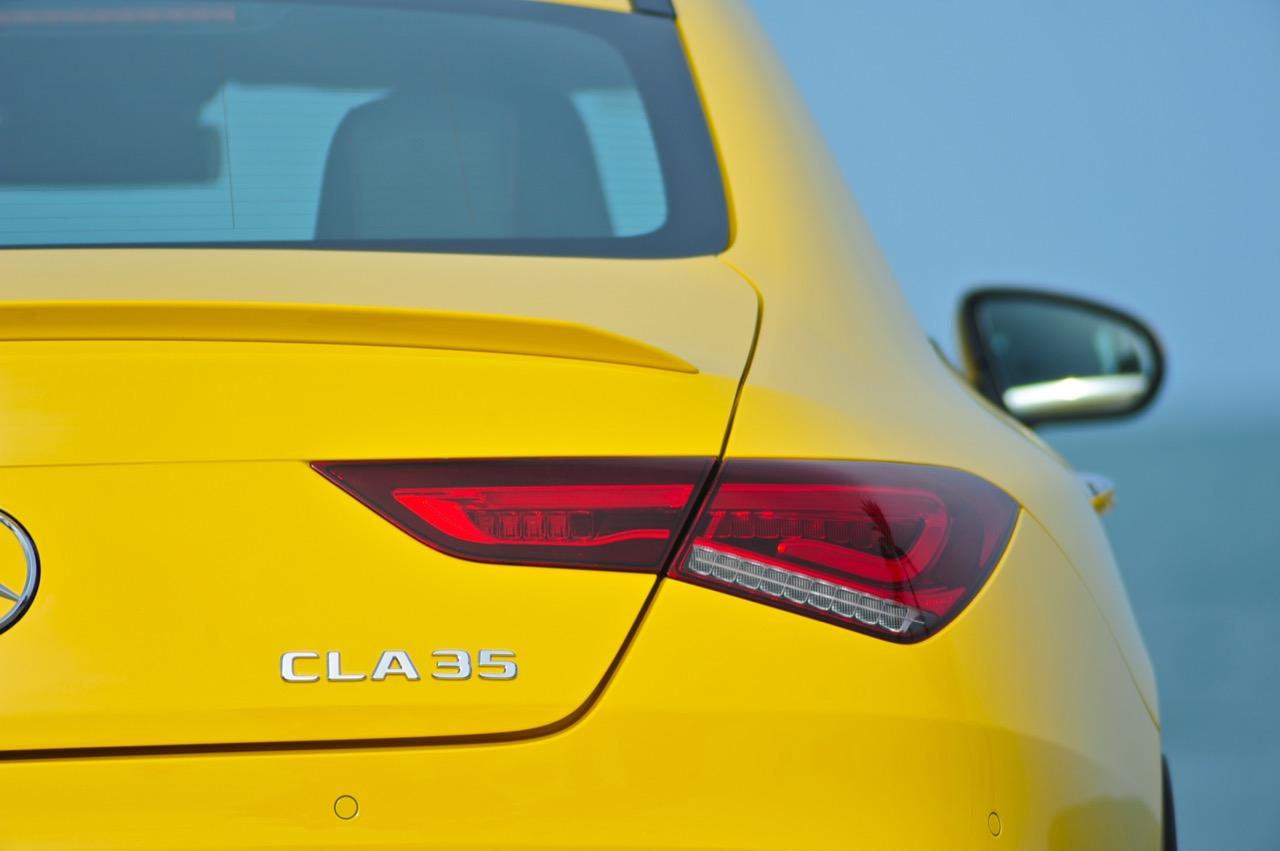 CLA ใหม่ ในเวอร์ชั่น 35 AMG เป็นรถคันเล็ก เครื่องเล็ก แรงม้าเยอะ และใช้ระบบขับเคลื่อน 4 ล้อ ด้วยกลไกไฟฟ้าในระบบ 4Matic ราคาขาย 3,999,000 บาท แพงเอาเรื่องอยู่เหมือนกัน แต่ก็นับว่าคุ้ม เมื่อเทียบกับประสิทธิภาพและความสนุกหลังพวงมาลัย CLA35 รหัสตัวถัง C118 ตัวถังสาดสีเหลือง เป็นสปอร์ตซีดานคันเล็กระดับเริ่มต้นของ Mercedes-AMG ส่วนรุ่นที่แรง และแพงกว่าอย่าง CLA45 ทำตลาดในไทยแบบควบคู่กันไปโดยมีให้สองทางเลือก ด้วยรูปแบบของนำเข้า และไม่มีการประกอบในประเทศทั้งสองรุ่น รวมถึงยังเป็นรถรุ่นพิเศษของ AMG ทำให้พี่น้อง Baby CLS มีราคาสูงพอสมควร CLA35 มี powerdomes บนฝากระโปรง กระจังหน้าคู่ louvre และช่องรับอากาศด้านหน้าแบบพิเศษ (พร้อมกับ "flics" บนช่องอากาศ) ระบบอากาศพลศาสตร์ที่ได้รับการขัดเกลาใหม่หมด ล้ออัลลอย AMG ลายใหม่คล้าย CLS53 ขนาด 19 นิ้ว สปอยเลอร์หลังขนาดเล็ก และปลายท่อทรงกลมทั้งสองฝั่งแบบรถแรงของ AMG ไฟหน้า LED High Performance headlamps พร้อมระบบไฟอัตโนมัติ มีกำลังในการส่องสว่างเพื่อเพิ่มทัศนวิสัยในตอนกลางคืน Mercedes-AMG ออกแบบชุดโคม LED โดยปรับให้หลอดกินกระแสไฟไม่มาก ใช้พลังงานต่ำในการส่องสว่าง ส่วนระบบเบรกของ CLA35 4MATIC ที่จะต้องรับมือกับกำลังกว่า 300 แรงม้า ได้รับการอัพเกรดปรับปรุงให้ทำงานได้เร็วขึ้น เบรกหน้าใช้คาลิปเปอร์ AMG 4 พอต จานดิสก์เบรกหน้ามีขนาดเส้นผ่าศูนย์กลาง 350 มิลลิเมตร เบรกหลังแบบคาลิปเปอร์ลูกสูบเดี่ยว จานเบรกหลังขนาด 330 มิลลิเมตร จานเบรกเจาะรูระบายความร้อนในขณะที่คาลิปเปอร์เบรกหน้าสีเงินแปะตัวอักษร AMG สีดำ พลังในการเบรกของ CLA35 ถือว่าทำได้ดี โดยเฉพาะการถ่ายเทน้ำหนักขณะเบรก ล้อ AMG มีลวดลายคล้ายกับ CLS53 ขนาด 19 นิ้ว ห่อรัดด้วยยางสปอร์ตของ Pirelli รุ่น P Zero ยางหน้าและหลังมีขนาดเท่ากันที่ 245/35 R19 93Y