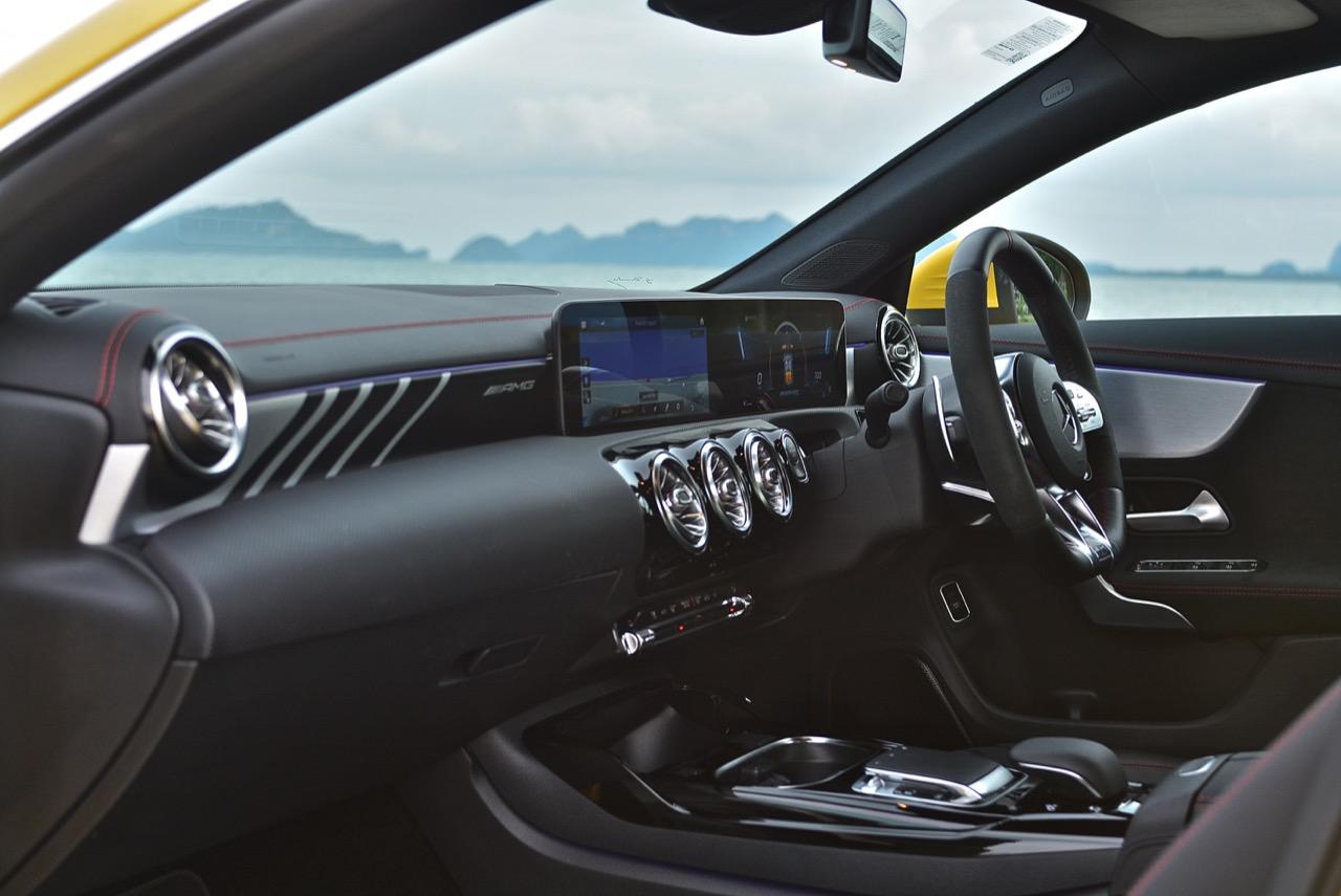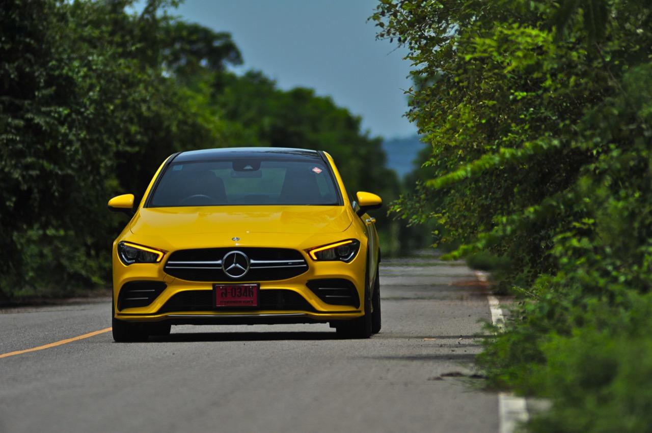 ขับทางไกลลากกันยาวๆ ไปปากน้ำปราณ จนไปถึงอำเภอสามร้อยยอด ในจังหวัดประจวบ เมื่อดูจากแรงม้าและแรงบิดของเจ้าเด็กเหลือง มันเป็นซีานเล็กที่ไม่ได้ดึงโหดเท่า CLA45S 4Matic + ซึ่งใช้เครื่องยนต์สองลิตรเทอร์โบที่ถือว่าเป็นเครื่องเบนซิน 2.0 ลิตร ที่แรงที่สุดในโลก แต่แรงบิดของน้องเล็กอย่าง CLA35 ไม่ใช่เรื่องล้อเล่นที่จะเอามาอำกันในกลุ่มนักขับ ในปี 2020 CLA เวอร์ชั่น AMG ก็ยังใช้เครื่อง 2 ลิตรเทอร์โบ ขับเคลื่อน 4 ล้อ และมี 4 ประตูเหมือนเดิม แต่สิ่งที่เปลี่ยนแปลง CLA AMG ก็คือ เทคโนโลยีใหม่ของระบบขับเคลื่อน รูปทรงที่สวยงามลงตัว กับความสามารถในการทำตัวเป็นยานพาหนะแบบสปอร์ตที่ใช้งานได้ทุกวัน โดยเฉพาะกำลังแรงบิดที่พอดิบพอดีราวกับสูทที่ได้รับการตัดเย็บมาเป็นอย่างดี! สำนัก AMG มีช่างปรับแต่งเกียร์ขั้นเทพ CLA35 ใช้เกียร์ทวินคลัตช์ 7G DCT เป็นชุดส่งกำลังที่มีคลัตช์ 2 ชุด โดยมีการปรับอัตราทดของแต่ละเกียร์ ให้เหมาะสมกับกำลังระดับ 306 แรงม้า เชื่อมต่อการทำงานกับระบบ 4Matic ส่งผลให้รถมีความเร้าร้อนมากกว่า CLA เวอร์ชั่นแรก ซอฟต์แวร์เกียร์ ควมคุมระบบ Speedshift ยกมาจาก AMG รุ่นพี่ที่มีพละกำลังมากกว่า เกียร์ 7-G DCT เปลี่ยนเกียร์ไวและไหลลื่นสุดๆ ช่วยเพิ่มรอบเครื่องยนต์ขณะเปลี่ยนเกียร์ที่ควบคุมด้วยคอมพิวเตอร์ โหมดแมนนวลและโหมดสปอร์ต รถจะเปลี่ยนเกียร์ได้เร็วสูสีกับอัตราทดในซุปเปอร์คาร์ โหมด Comfort หรือ C ย่อมาจากคำว่า Controlled Efficiency ช่วยทำให้มันประพฤติตัวเป็นมิตรกับสิ่งแวดล้อม Auto Start/Stop ทำงานอย่างขยันขันแข็งแม้จะเป็นตัวแรงของ AMG แต่เมื่อเปิดใช้งานมันจะดับเครื่องยนต์ทุกครั้งที่จอดนิ่งๆ รอการเคลื่อนตัว ส่วนโหมดเกียร์ธรรมดาก็ยังเปิดโอกาสให้คุณชิฟเกียร์เล่นได้คล้ายกับการขับรถแข่งในสนาม การใช้นิ้วแตะ Paddle Shift สร้างความเร้าใจได้ดีพอๆ กับการตอบสนองที่ว่องไวของระบบเกียร์ มันยังเป็นรถที่เร่ง เลี้ยว และเบรกได้ดีเอามากๆ จนทำให้ผมติดใจในความพอดีแบบไม่มีขาดหรือเกินของ CLA35 4Matic กำลังแค่ 306 แรงม้า แต่การตอบสนองของคันเร่งไฟฟ้านั้นรวดเร็วสูสีกับ Mercedes-AMG GTC ที่ผมเคยเอามารีวิวเมื่อปลายปี 2562 เจ้า CLA35 เหมือนกับได้รับแรงบันดาลใจมาจากประสิทธิภาพด้านอัตราเร่งของ AMG รุ่นที่มีพละกำลังมากกว่า ท่อระบายไอเสียแบบสปอร์ตก็ยังช่วยปรุงแต่งเสียงให้มีความน่าขับอีกต่างหาก เทอร์โบแบบ TwinScroll มีโอเวอร์บูสต์ช่วยให้คุณเร่งความเร็วได้อย่างเสมอต้นเสมอปลาย ไหลยาวตั้งแต่เกียร์ 4 ไปจนถึงเกียร์ 7 เครื่องยนต์ดึงหนักข้อตราบใดที่คุณยังรักษารอบเครื่องให้อยู่ในช่วงเทแรงบิด การขับในโหมด Sport ระบบควบคุมการทำงานของชุดเกี