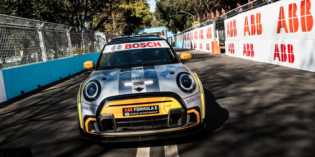 MINI เซฟตี้คาร์ของรถแข่งฟอร์มูลาอี มีการจัดซุ้มล้อใหม่ ที่ได้รับการปรับให้เข้ากับความกว้างของแทร็กหรือระยะห่างระหว่างล้อที่ถูกขยับเพิ่มในขณะที่สปอยเลอร์หน้า ไฟสีขาวกะพริบของรถถูกรวมเข้ากับฝากระโปรงหน้าโดยไฟหลังยังได้รับลายเซ็นของแบรนด์อีกด้วย ในภาพ จะสังเกตเห็นสเกิร์ตข้างอย่างโหด โป่งซุ้มล้อที่ดัดแปลงมาจากทรงของ MINI GP ล้อขนาด 18 นิ้วสีส้มสลับสีดำ ที่น่าสนใจคือ spats และสปอยเลอร์เป็นชิ้นงาน 3 มิติ หล่อจากจากคาร์บอนไฟเบอร์ รีไซเคิลโดยบางส่วนมีเส้นที่เน้นสีเหลือง ในขณะเดียวกัน สีของตัวถังจะเป็นสีเงินด้านแม้ว่าจะมีการเคลือบเงาด้วยการไล่ระดับสีแบบสองขั้นตอน ตั้งแต่สีส้ม Highspeed Orange ไปจนถึงสีแดง Curbside Red ที่แสดงออกถึงความร้อนแรงของพลังงานไฟฟ้า!