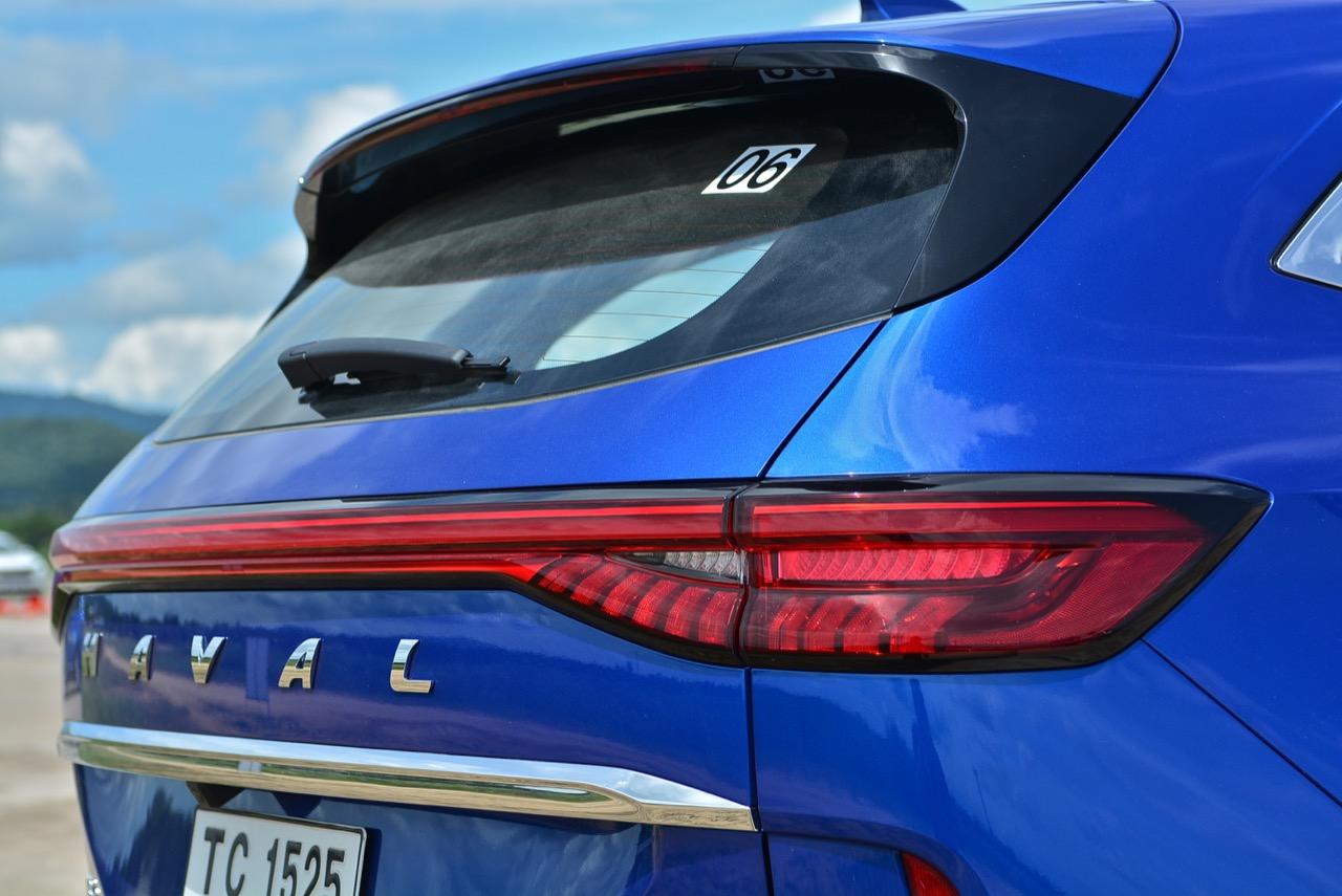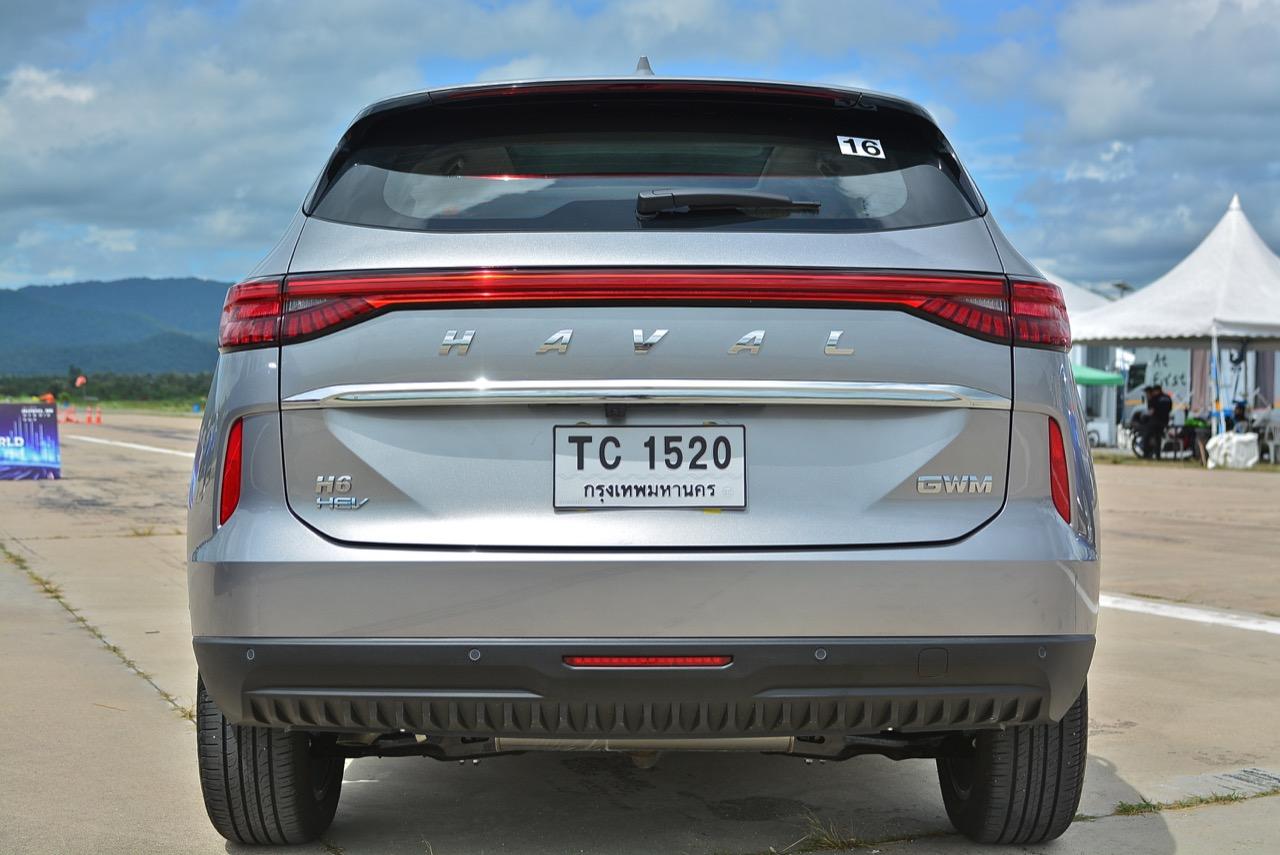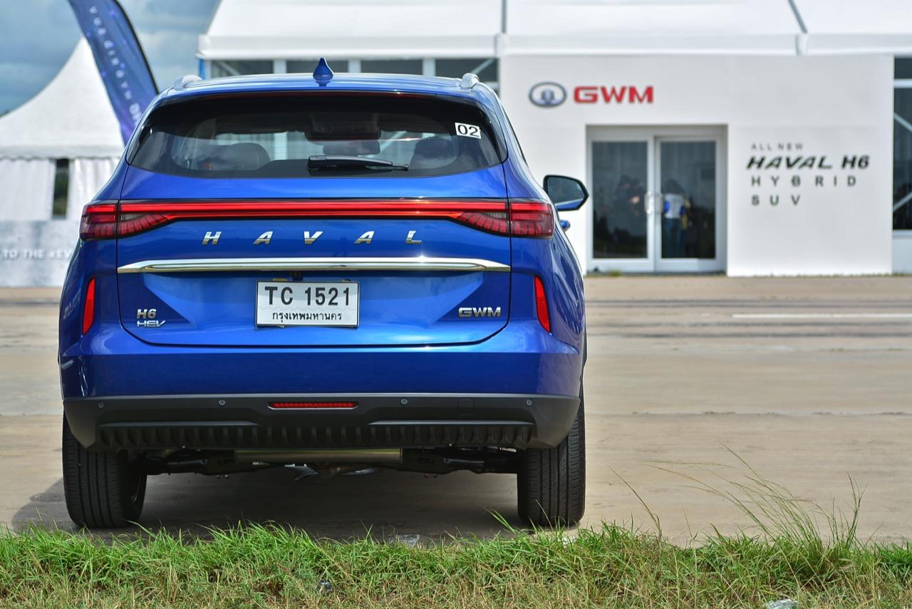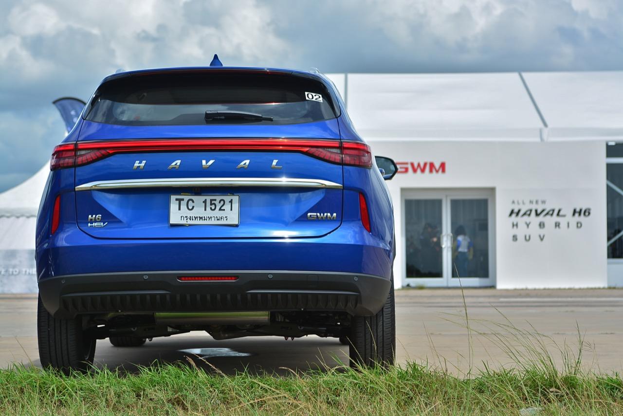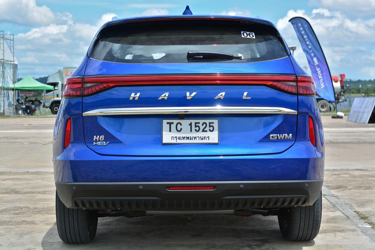 บั้นท้ายมีการผสมผสานรูปแบบของไฟท้ายที่คล้ายกับ Porsche Macan แถบไฟท้ายพาดยาว เชื่อมไฟท้ายทั้งสองฝั่งจากซ้ายจรดขวา LED taillight strip ฝาท้ายระบบไฟฟ้า ช่วยอำนวยความสะดวกไม่ต้องออกแรงยกฝาท้ายเหมือนเอสยูวีบางรุ่น ไฟท้ายพลาสติกสีแดงอมชมพูอย่างสวย ใช้หลอดไฟท้าย ทั้งไฟหรี่ ไฟเบรกและไฟถอยหลังเป็นแบบ Full LED ทั้งหมด กึ่งกลางของฝาท้ายตกแต่งคาดกลางด้วยชิ้นงานพลาสติกโครเมียม สัญลักษณ์ GWM ที่มุมด้านขวาและคำว่า H6 HEV ที่มุมด้านซ้ายของฝาท้าย ไฟเบรกดวงที่สามหลอด LED ยกขึ้นไปติดอยู่บนขอบของสปอยเลอร์หลัง เพื่อมุมมองที่ชัดเจนจากตำแหน่งของการติดตั้ง กระจกฝาท้ายมีใบปัดน้ำฝนเล็กๆ ติดมาให้ใช้งาน กันชนหลังบริเวณมุมทั้งสองข้างติดตั้งพลาสติกสะท้อนแสงมัลติรีเฟลกเตอร์ ชายล่างของชุดกันชนหลังติดตั้งพลาสติกกันกระแทกสีดำ พร้อมตำแหน่งของเซนเซอร์หลัง 4 จุด ท่อระบายไอเสียมองไม่เห็นเนื่องจากมีการออกแบบให้ชิ้นงานพลาสติกที่ปิดทับชายล่างของชุดกันชนหลังคลุมปิดตัวท่อที่อยู่ด้านล่างจนมองไม่เห็น