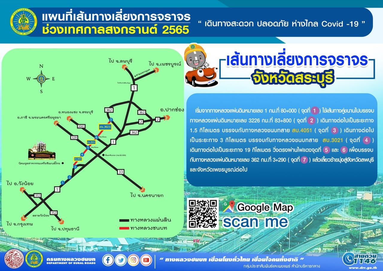 กรมทางหลวงชนบท มีการแนะนำเส้นทาง 8 เส้นทาง เพื่อหลีกเลี่ยงการจราจรช่วงเทศกาลสงกรานต์ 2565 ให้ประชาชนวางแผนการเดินทางได้อย่างสะดวกปลอดภัย ตามนโยบายของรัฐมนตรีว่าการกระทรวงคมนาคม นายอภิรัฐ ไชยวงศ์น้อย อธิบดีกรมทางหลวงชนบท เปิดเผยว่า ช่วงวันหยุดเทศกาลสงกรานต์ ระหว่างวันที่ 11 – 17 เมษายน 2565 คาดการณ์ว่าจะมีปริมาณการจราจรเดินทางออกสู่ต่างจังหวัดเป็นจำนวนมาก กรมทางหลวงชนบท (ทช.) จึงได้รวบรวมเส้นทางสำหรับหลีกเลี่ยงการจราจรติดขัดและช่วยแบ่งเบาปริมาณการจราจรจากถนนสายหลักในช่วงเวลาดังกล่าว เพื่อให้ประชาชนสามารถวางแผนการเดินทางล่วงหน้าได้อย่างสะดวกปลอดภัย ตามนโยบายของ นายศักดิ์สยาม ชิดชอบ รัฐมนตรีว่าการกระทรวงคมนาคม ซึ่งจะช่วยป้องกันและลดอัตราการเกิดอุบัติเหตุระหว่างการเดินทางช่วงเทศกาลสงกรานต์ 2565 ได้อย่างมีประสิทธิภาพ โดยแบ่งเป็น 8 เส้นทาง ดังนี้