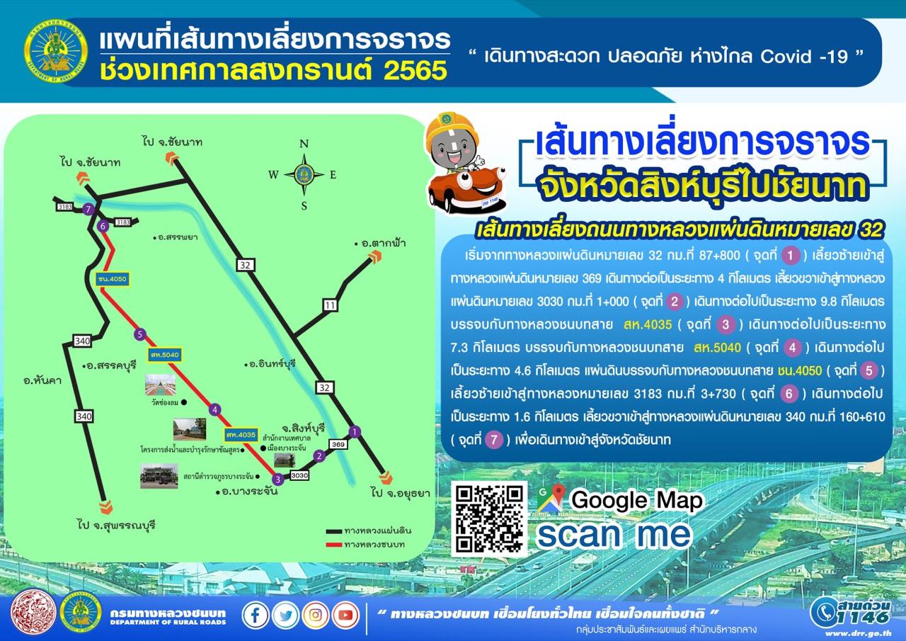 5.) เส้นทางเลี่ยงทางหลวงแผ่นดินหมายเลข 32 เริ่มจากทางหลวงแผ่นดินหมายเลข 32 กม.ที่ 87+800 (จุดที่ 1) เลี้ยวซ้ายเข้าสู่ทางหลวงแผ่นดินหมายเลข 369 เดินทางต่อเป็นระยะทาง 4 กิโลเมตร เลี้ยวขวาเข้าสู่ทางหลวงแผ่นดินหมายเลข 3030 กม.ที่ 1+000 (จุดที่ 2) เดินทางต่อไปเป็นระยะทาง 9.8 กิโลเมตร บรรจบกับทางหลวงชนบทสาย สห.4035 (จุดที่ 3) เดินทางต่อไปเป็นระยะทาง 7.3 กิโลเมตร บรรจบกับทางหลวงชนบทสาย สห.5040 (จุดที่ 4) เดินทางต่อไปเป็นระยะทาง 4.6 กิโลเมตร บรรจบกับทางหลวงชนบทสาย ชน.4050 (จุดที่ 5) เลี้ยวซ้ายเข้าสู่ทางหลวงแผ่นดินหมายเลข 3183 กม.ที่ 3+730 (จุดที่ 6) เดินทางต่อไปเป็นระยะทาง 1.6 กิโลเมตร แล้วเลี้ยวขวาเข้าสู่ทางหลวงแผ่นดินหมายเลข 340 กม.ที่ 160+610 (จุดที่ 7) เพื่อเดินทางเข้าสู่จังหวัดชัยนาท เส้นทางเลี่ยงการจราจรจังหวัดสระบุรี