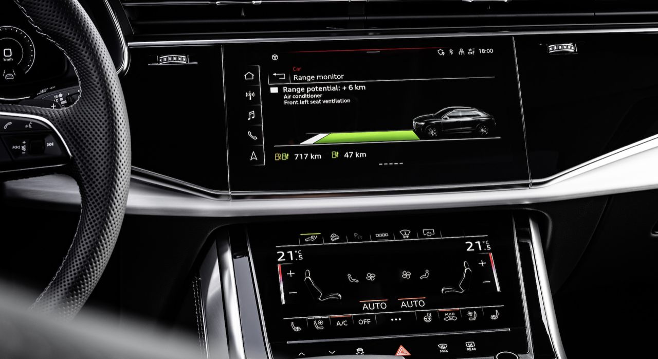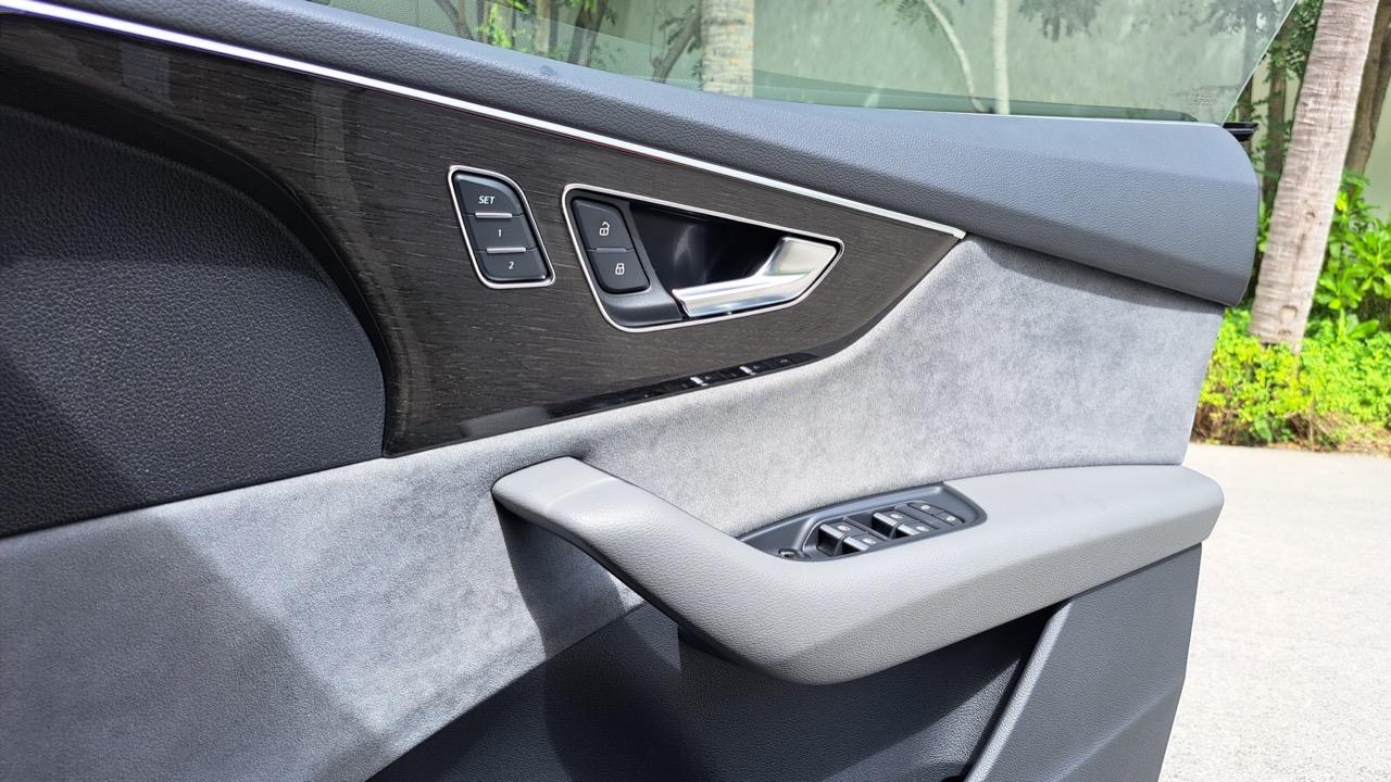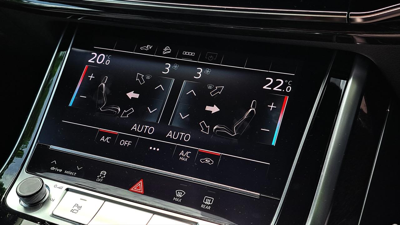 แม้ว่าเราจะเข้าสู่ยุคสมัยที่บริษัทรถแข่งกันลดจำนวนปุ่มกด ก้านโยก สวิตช์หมุน เพื่อลดต้นทุนและย้ายทุกอย่างไปอยู่บนจอ เพราะมันสวยไฉไลใครเห็นก็กรี๊ด...Audi ก็ดูจะต้องไหลตัวไปตามกระแสนั้นอย่างเลี่ยงได้ยาก แต่ความเหมือนระหว่าง Audi กับ Porsche ในวิศวกรรมการออกแบบก็คือ เราลองขับ ลองจับ ลองใช้ เราจะรู้สึกได้ว่า กลไกการสั่งงาน เปิด/ปิด ใช้งานส่วนต่างๆ มันถูกคิดมาโดยคนที่ชอบรถ เข้าใจในรถจริงๆ อย่างใน Q8 นั้น แม้แผงควบคุมแอร์ที่เป็นทัชสกรีนสั่นตามการแตะจะแหงนหน้าสะท้อนแสงมากไปบ้าง แต่การใช้งานจดจำง่ายมาก ปุ่มต่างๆ ส่วนใหญ่..ย้ำว่าส่วนใหญ่ โต กดง่ายในระหว่างขับ จะมีก็แค่สวิตช์สลับโหมด e-Tron ซึ่งสั่งการทำงานระบบไฮบริด (EV, Hybrid Auto, Battery Hold, Battery Charge) นั่นแหละที่พ่อเจ้าประคุณเล็กเกิน แล้วกดระหว่างขับยากด้วย