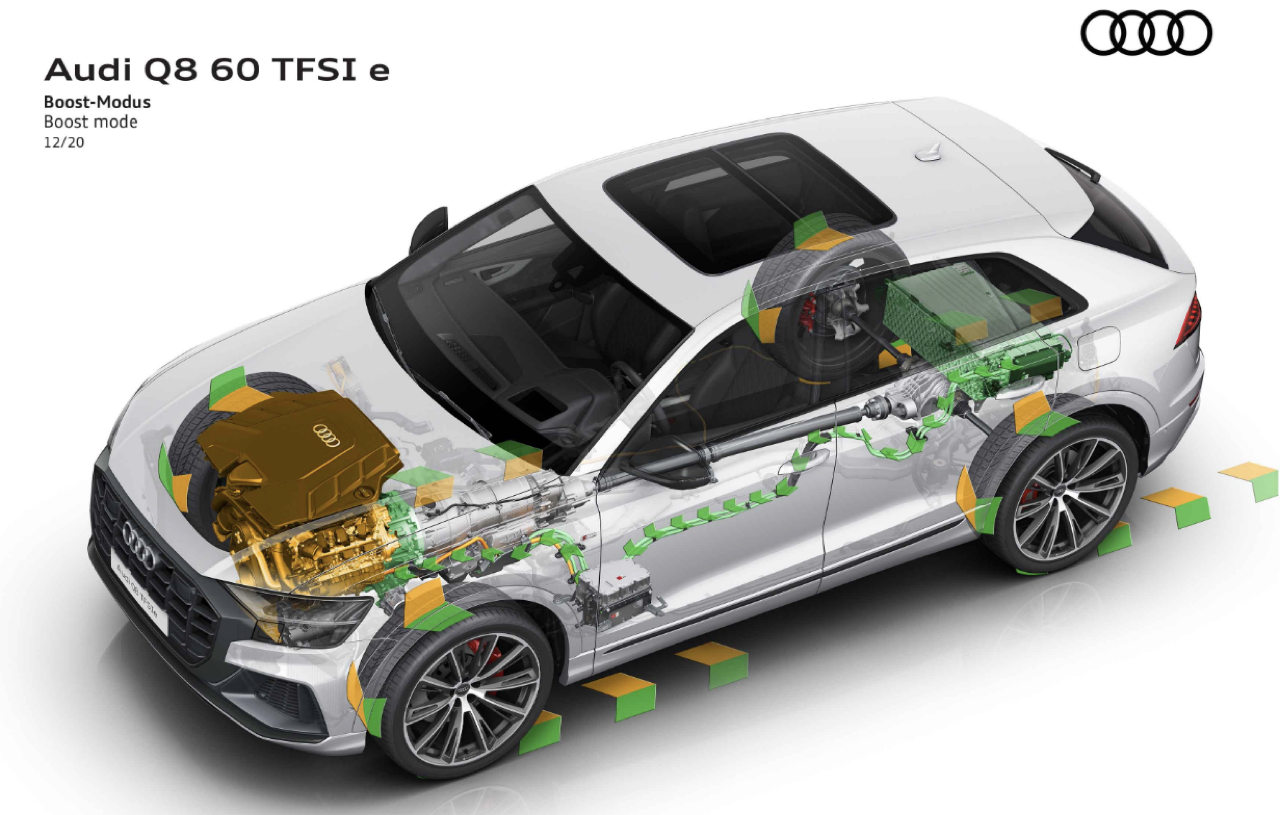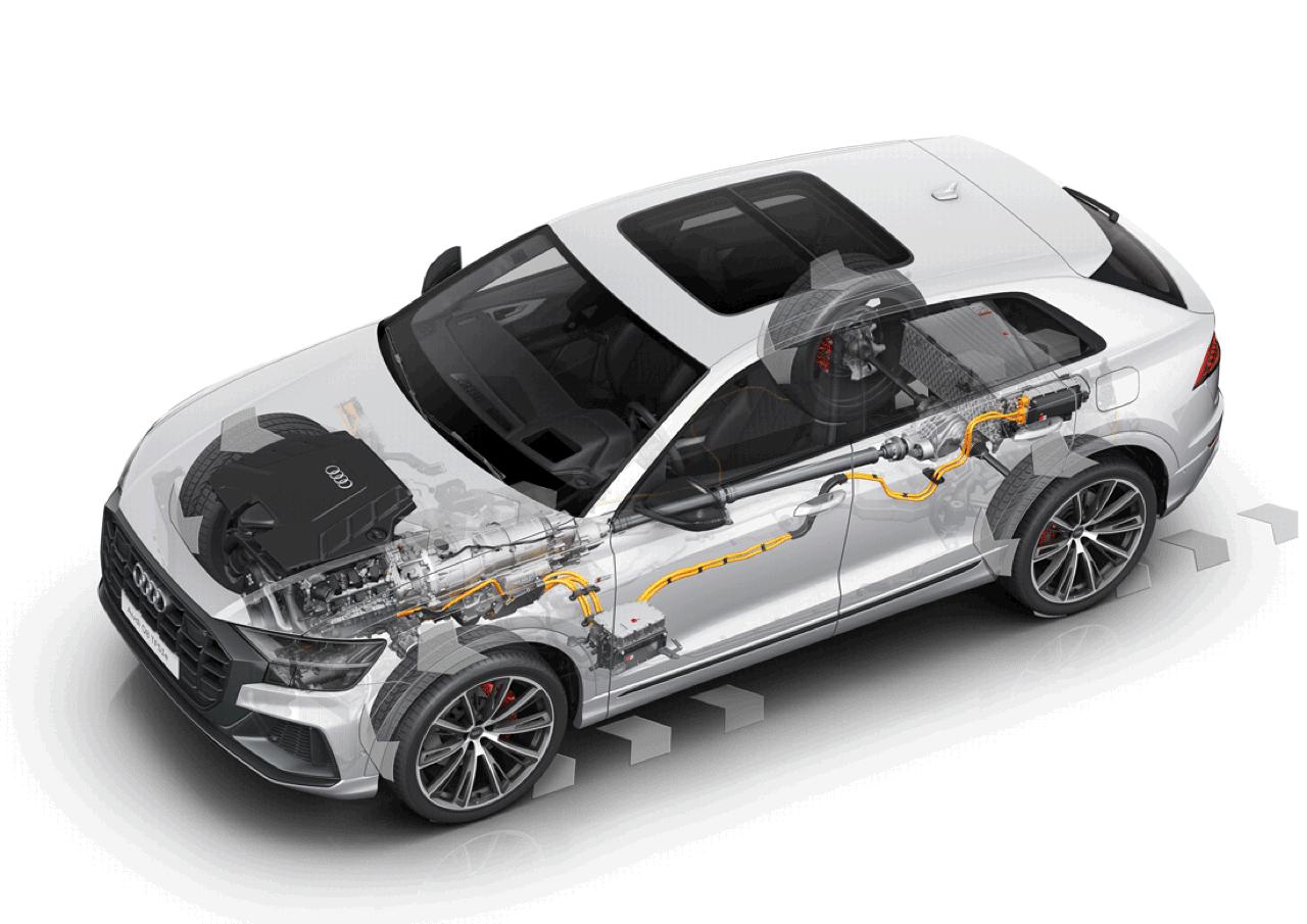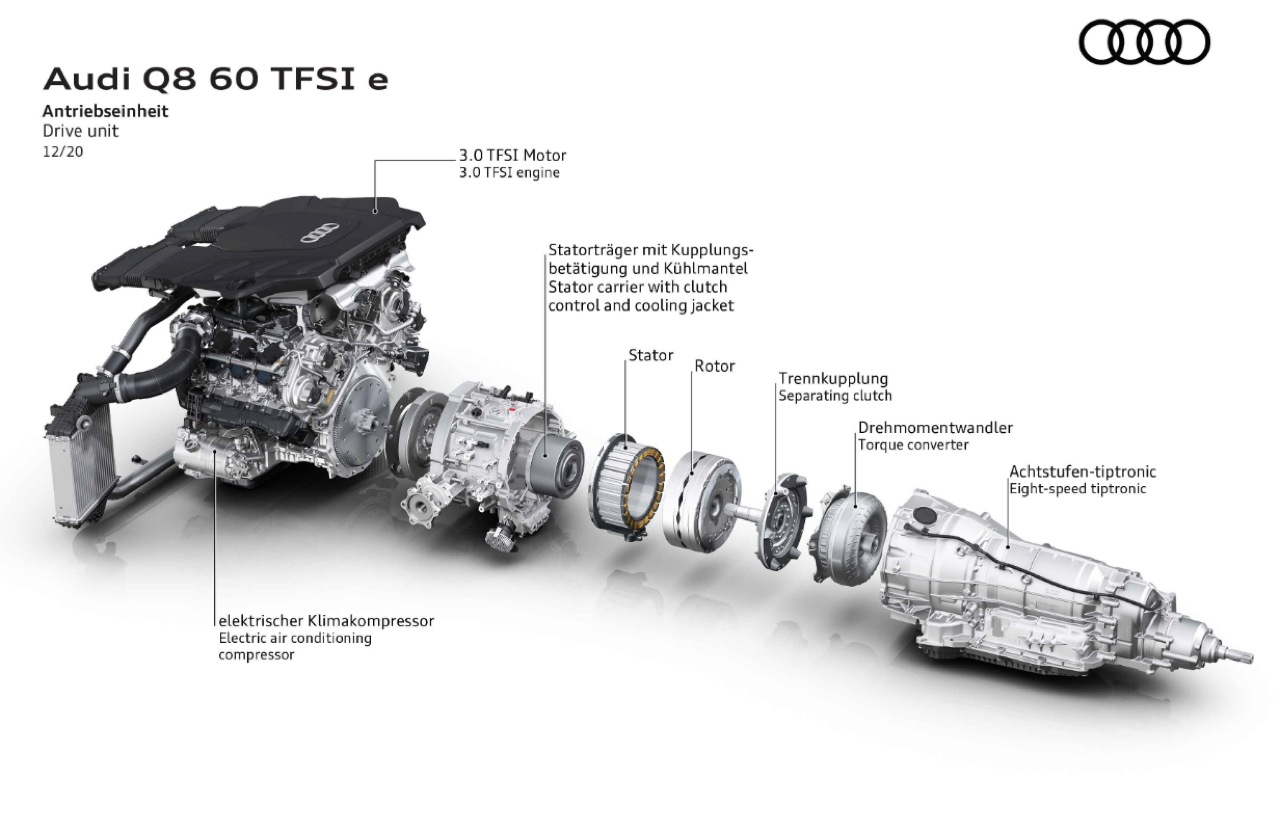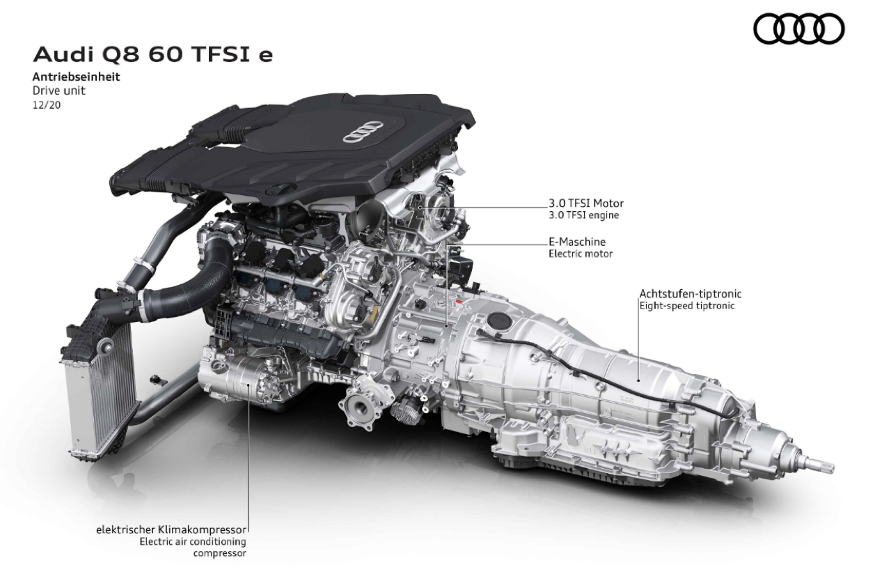 หัวใจของ Q8 60 TFSI e นั้น ก็แทบจะเหมือนกันกับของ Porsche Cayenne e-Hybrid ซึ่งพูดง่ายๆ ว่า ถ้าคุณไม่เสพติดตราม้าเยอรมัน หรือกังวลเรื่องจอดรถช่องซุปเปอร์คาร์ได้หรือไม่ คุณสามารถจ่ายน้อยกว่ากันเป็นล้าน ได้รถที่มีขุมพลังเดียวกัน เครื่องยนต์เบนซินข้างหน้า เป็นขนาด 3.0 ลิตร V6 ติดเทอร์โบชาร์จไว้ระหว่างฝาสูบ ลำพังตัวเครื่องยนต์อย่างเดียวก็แรงระดับ 340 แรงม้าเข้าไปแล้ว แต่ยังมีชุดมอเตอร์ไฟฟ้าพลัง 136 แรงม้าเป็นตัวเสริม ซึ่งเมื่อทั้งสองระบบทำงานประสานกัน แรงม้าสูงสุดที่ได้คือ 462 แรงม้า แรงบิดรวม 700 นิวตันเมตร