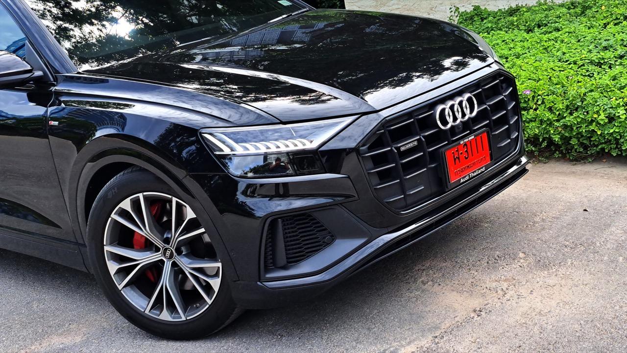 ท่านผู้ชมอาจจะสงสัยว่านี่ตกลงคลิกเข้ามาอ่านเรื่องรถหรือสารคดีสัตว์โลกกันแน่ ไม่ต้องตกใจหรอกครับ การที่ได้ยืนมองเจ้า Q8 จากระยะใกล้ โดยเฉพาะเมื่อรถคันนี้มาในโทนสีดำเมทัลลิก Mythos Black เมื่อจอดบนถนนพื้นปูนหน้าโรงแรม Ba Ba Beach สีน้ำตาลขาวสะท้อนเงาขึ้นยังส่วนล่างของตัวรถ ตัดกับบอดี้สีดำ ทำให้ตัวรถนั้นมีลักษณะเหมือนวาฬเพชฌฆาต (หรือที่เรียกง่ายๆ ว่า Orca) แล้วยังมีไฟหน้า Matrix LED ที่ออกแบบมาในทรงที่จะดุก็ไม่ดุ ออกจะมีแววตาทะลึ่งขี้เล่นเสียด้วยซ้ำ หากท่านผู้อ่านเคยได้ลองสบตา Orca ตัวจริงระยะใกล้ๆ จะยิ่งเข้าใจความรู้สึกผม