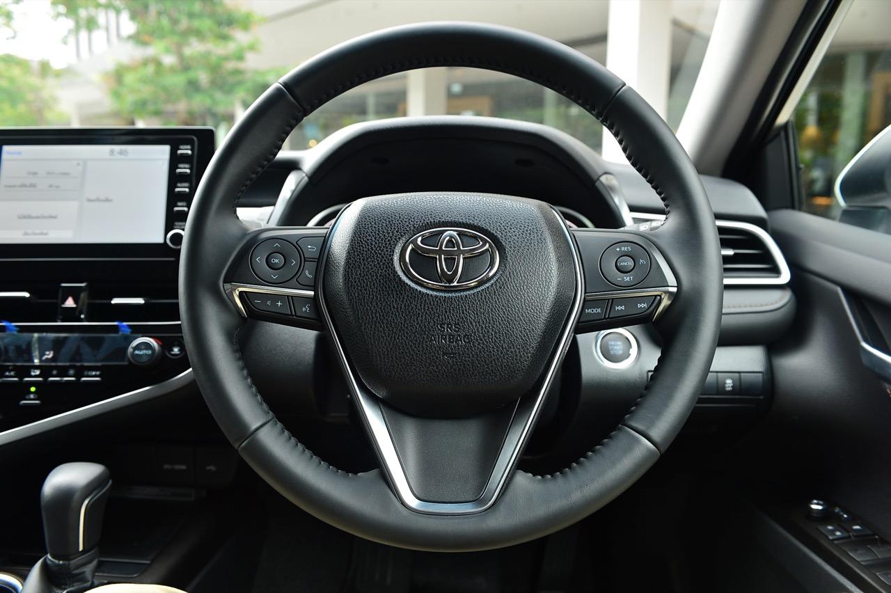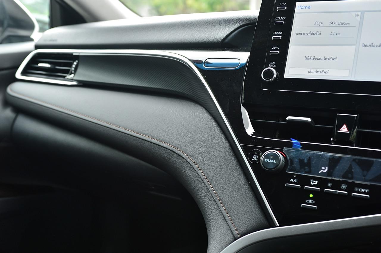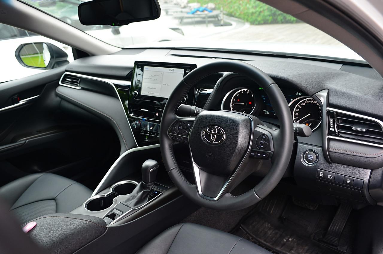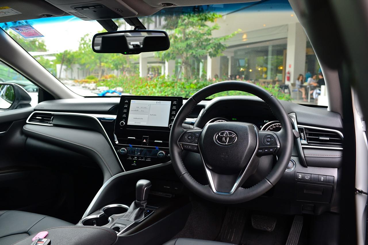 พวงมาลัยทรงสามก้านหน้าตาบ้านๆ หุ้มหนังและมีแป้นเปลี่ยนเกียร์กับสวิตช์สั่งงานสารพัดระบบติดมาให้ คอนโซลกลางเป็นที่อยู่ของจอภาพมอนิเตอร์ระบบสัมผัสขนาด 7 นิ้ว ปุ่มควบคุมอุณหภูมิดิจิทัลแบบแยกโซน ช่องแอร์ทรงเหลี่ยมหน้าตาคุ้นๆ กับช่องวางแก้วบริเวณข้างซุ้มคันเกียร์ new Camry 2.5 Sport MoDellista มีระบบ auto brake hold มาให้ใช้งานเมื่อขับในเมือง ติดกับคันเกียร์คือปุ่มปรับโหมดการขับเคลื่อน 3 รูปแบบ เช่น ECO / Normal / Sport ซุ้มเกียร์ดูสวยงามและให้ผิวสัมผัสที่ดีด้วยพลาสติกสีน้ำตาลเข้ม แผงประตูสีดำเดินตะเข็บด้วยด้ายสีน้ำตาลพร้อมชิ้นงานพลาสติกสีเงินคาดกลางแผงประตูช่วยเพิ่มความหรูหรา จากลายไม้เปลี่ยนไปเป็นชิ้นงานตกแต่งทำจากพลาสติกสีดำ คาดอยู่ในบริเวณแผงกลางของคอนโซล อุปกรณ์แท่นชาร์จมือถือไร้สาย ช่องเชื่อมต่อ USB และช่องจ่ายกระแสไฟ 12V