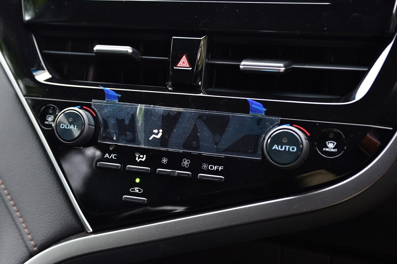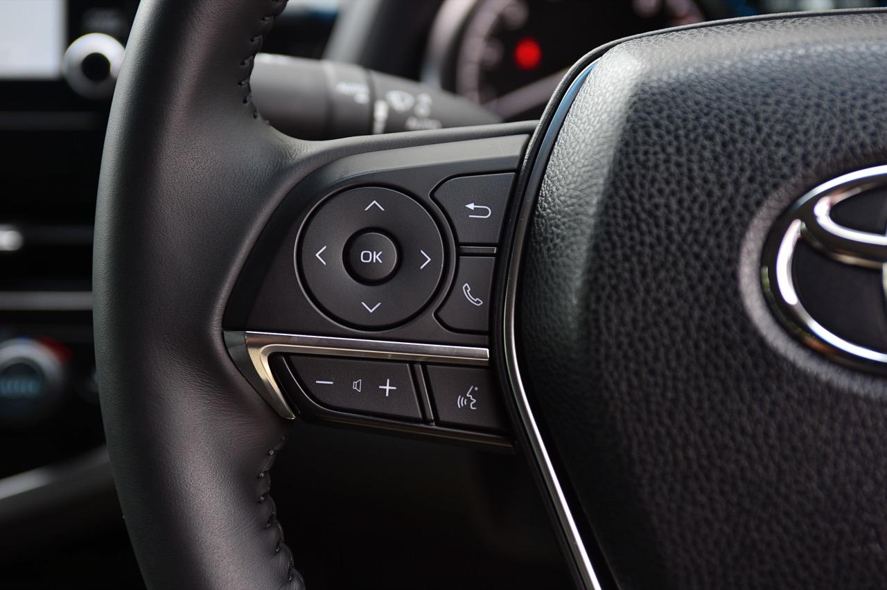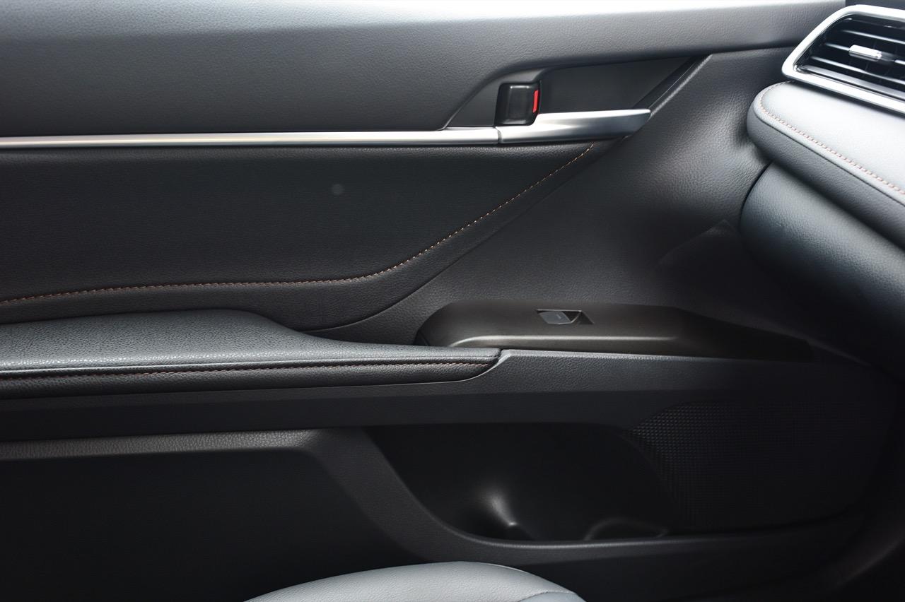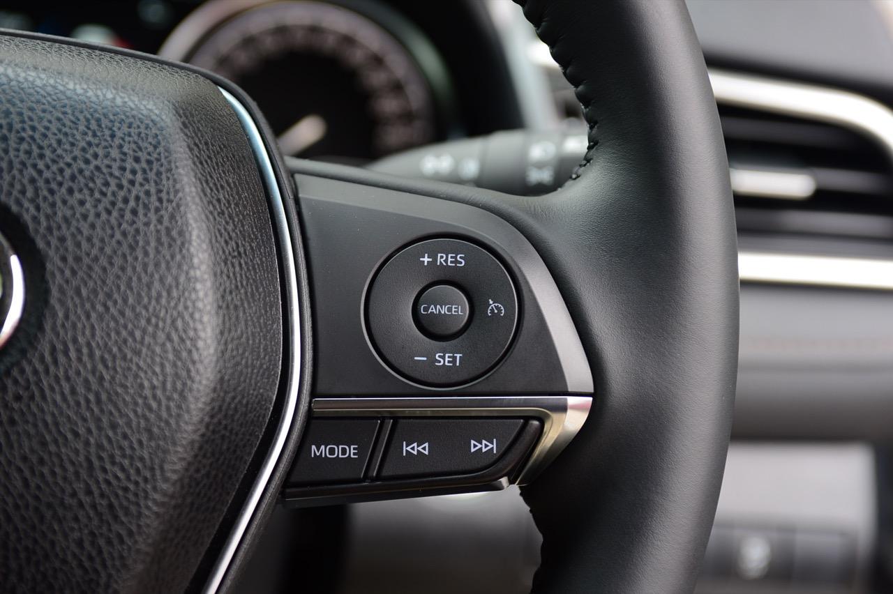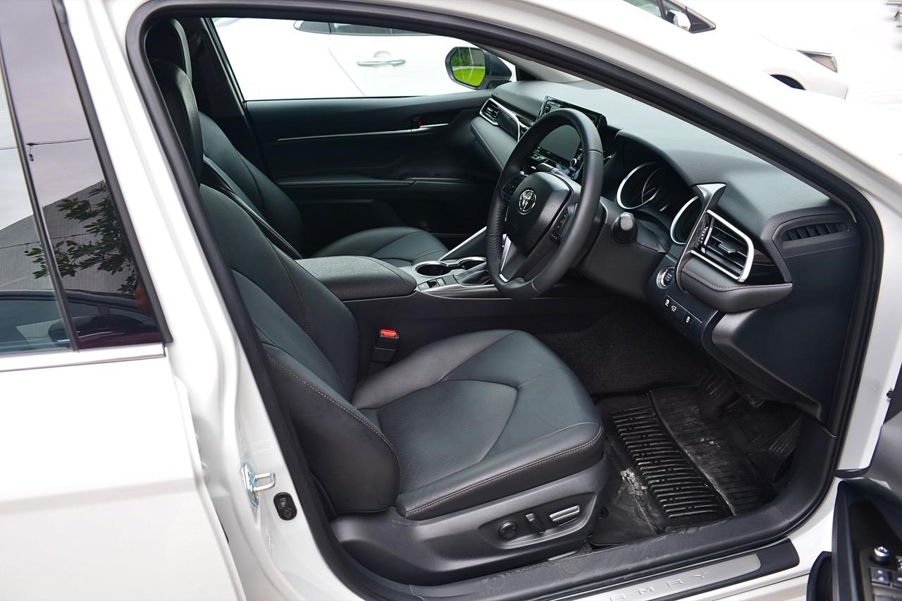 พวงมาลัยทรงสามก้านหน้าตาบ้านๆ หุ้มหนังและมีแป้นเปลี่ยนเกียร์กับสวิตช์สั่งงานสารพัดระบบติดมาให้ คอนโซลกลางเป็นที่อยู่ของจอภาพมอนิเตอร์ระบบสัมผัสขนาด 7 นิ้ว ปุ่มควบคุมอุณหภูมิดิจิทัลแบบแยกโซน ช่องแอร์ทรงเหลี่ยมหน้าตาคุ้นๆ กับช่องวางแก้วบริเวณข้างซุ้มคันเกียร์ new Camry 2.5 Sport MoDellista มีระบบ auto brake hold มาให้ใช้งานเมื่อขับในเมือง ติดกับคันเกียร์คือปุ่มปรับโหมดการขับเคลื่อน 3 รูปแบบ เช่น ECO / Normal / Sport ซุ้มเกียร์ดูสวยงามและให้ผิวสัมผัสที่ดีด้วยพลาสติกสีน้ำตาลเข้ม แผงประตูสีดำเดินตะเข็บด้วยด้ายสีน้ำตาลพร้อมชิ้นงานพลาสติกสีเงินคาดกลางแผงประตูช่วยเพิ่มความหรูหรา จากลายไม้เปลี่ยนไปเป็นชิ้นงานตกแต่งทำจากพลาสติกสีดำ คาดอยู่ในบริเวณแผงกลางของคอนโซล อุปกรณ์แท่นชาร์จมือถือไร้สาย ช่องเชื่อมต่อ USB และช่องจ่ายกระแสไฟ 12V