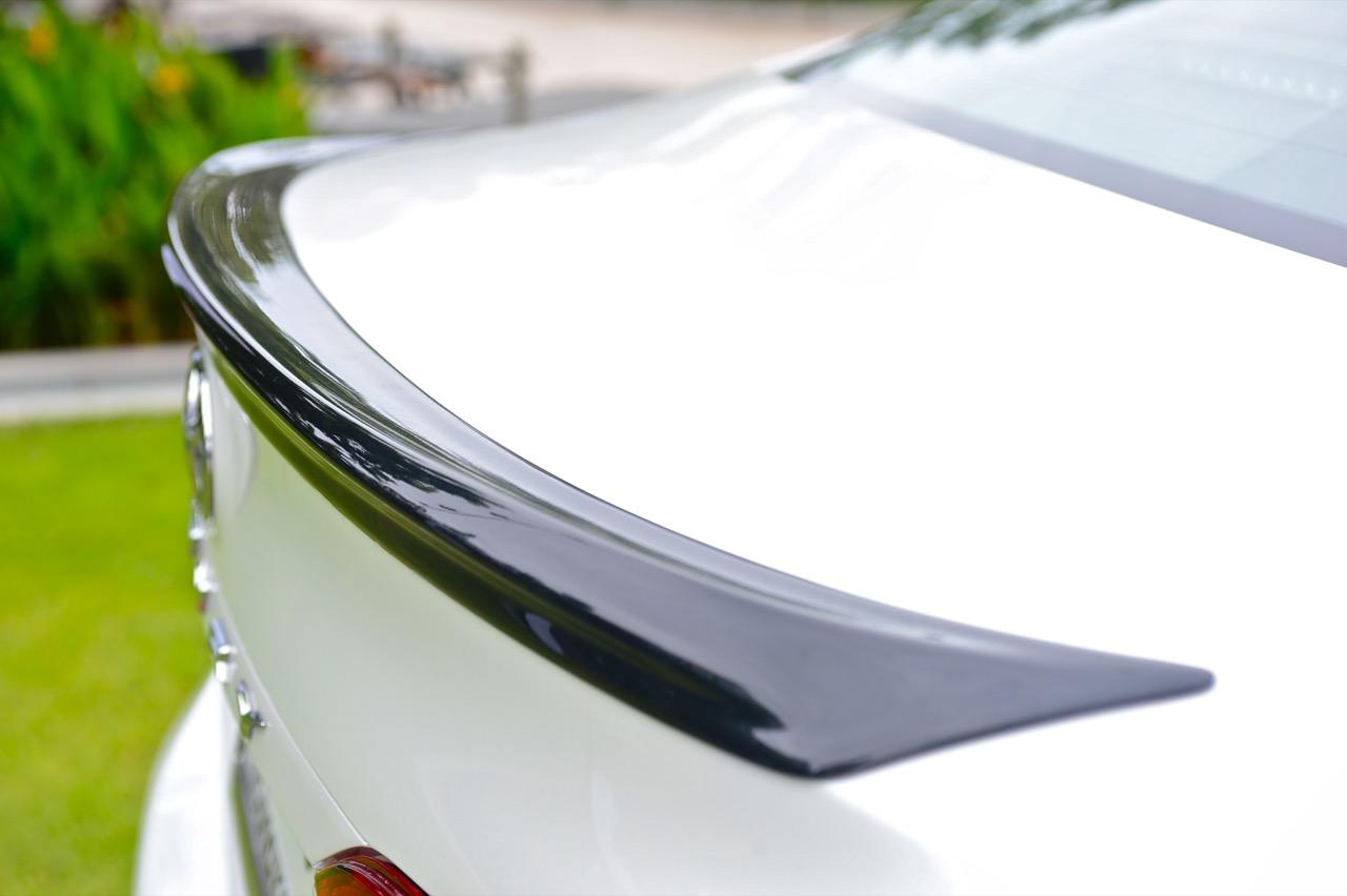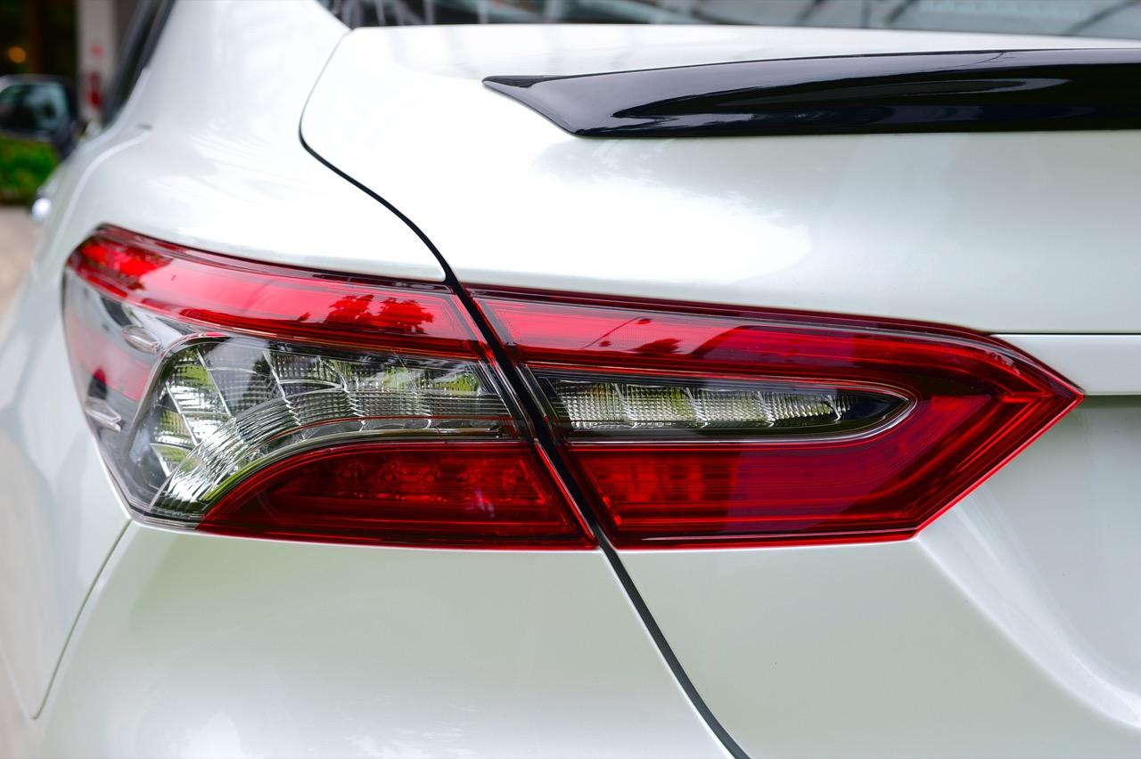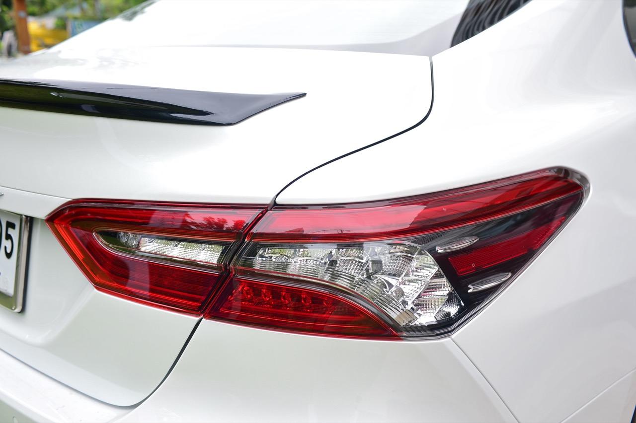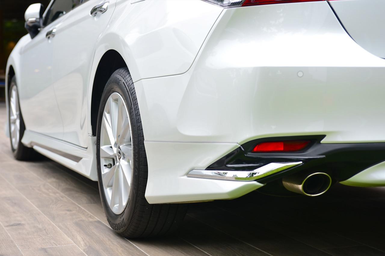 แนวตัวถังด้านข้างมีเส้นนำสายตาลากจากแก้มข้างไปจนถึงด้านบนของไฟท้ายตามสไตล์รถยนต์สมัยใหม่ เสาท้ายแปลกประหลาดคล้ายรถแฮตช์แบคมากกว่าจะเป็นเสาท้ายของรถซาลูนไซส์กลาง new Camry 2.5 Sport MoDellista เดินเส้นสีเงินรอบกรอบกระจกบานประตู พร้อมมือจับที่เปิดประตูโครเมียม การออกแบบเมื่อมองจากด้านข้างเหมือนด้านหน้าจะยาวกว่าส่วนท้าย ล้ออัลลอยขอบ 17 นิ้วห่อรัดด้วยยาง bridgestone turanza ไซส์ 215/55R17 บั้นท้ายเรียบๆ พร้อมไฟท้ายทรงยาวแบบรถผู้บริหารสูงวัย ขอบของฝาท้ายมีครีบรีดอากาศหรือสปอยเลอร์หลังสีดำ สำหรับพื้นที่เก็บสัมภาระใต้ฝากระโปรงหลังก็มากพอที่จะยัดกระเป๋าเดินทางหรือถุง Golf ได้อย่างสบายๆ กันชนหลังพร้อมชุดแต่ง Modellista ท่อระบายไอเสียทรงกลมซ้าย-ขวา ฝั่งละท่อ พร้อมพลาสติกสะท้อนแสงมัลติรีเฟคเตอร์