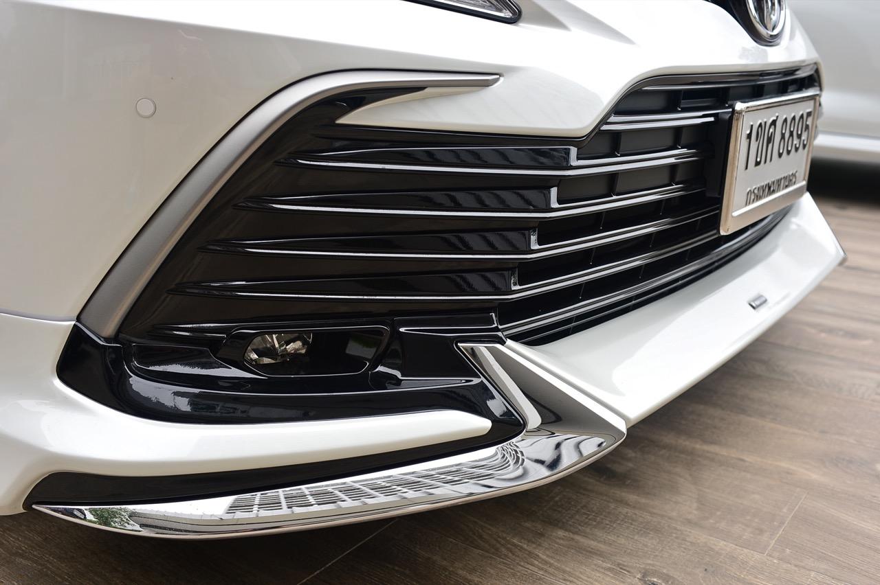 ไม่ว่าจะเป็นกระจังหน้าทรงยื่นๆ พร้อมซี่ถี่ๆ ของตัวกระจัง ไฟหน้าแบบโปรเจคเตอร์พร้อมไฟหรี่กลางวัน LED Day Time Running Lights ฝากระโปรงมีเหลี่ยมมุมที่เชื่อมโยงกับไฟหน้า แก้มข้างที่มีการดึงโป่งซุ้มล้อออกมาอีกเล็กน้อย มันเป็นรถที่เตี้ยกว่า Camry รุ่นที่แล้วถึง 10 มิลลิเมตร และดูเตี้ยกว่าเดิมเมื่ออยู่ในสีขาว มิติและน้ำหนักของ new Camry 2.5 Sport ยาว 4,885 มิลลิเมตร กว้าง 1,840 มิลลิเมตร สูง 1,445 มิลลิเมตร ฐานล้อ 2,825 มิลลิเมตร ระยะต่ำสุดจากพื้นถึงใต้ท้อง 140 มิลลิเมตร น้ำหนักรถ 1,550 กิโลกรัม ความจุถังเชื้อเพลิง 50 ลิตร ส่วนชุดแต่ง Modellista ประกอบไปด้วย สเกิร์ตหน้า สเกิร์ตข้าง ซ้าย-ขวา สเกิร์ตหลัง และสปอยเลอร์บนฝากระโปรงหลัง