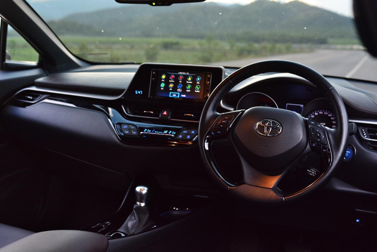การออกแบบภายในห้องโดยสาร ให้บรรยากาศผสมระหว่างเส้นสายฉวัดเฉวียนที่พยายามแหวกความเป็น Toyota ให้ได้มากที่สุด แต่ความที่ยังต้องใช้พาร์ตร่วมกับรถรุ่นอื่นของค่าย ก็จะทำให้มีบางจุดที่ดูทะแม่ง เช่นจอระบบ Infotainment ตรงกลางที่ตั้งกรอบมาดูล้ำยุคแต่ชุดเครื่องเสียงยังเป็นแบบ 2 DIN ที่ไม่ค่อยทันสมัยนัก แลกกับข้อดีคือ ถ้าเครื่องเสียงพังก็หาเสียบใหม่ใส่ได้ง่าย หน้าปัดยังเป็นแบบเข็ม มีจอ MID ขนาดเล็กแทรกตรงกลาง เพราะ C-HR เกิดในยุคที่ความเป็นอนาล็อกยังหลงเหลืออยู่