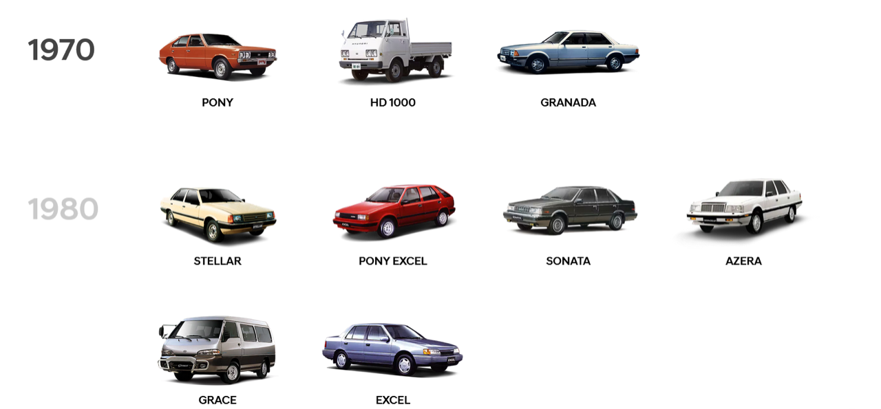 ในยุค 1980s คือยุคที่ Hyundai ใช้กลยุทธ์ด้านราคาในการแข่งขัน สามารถแย่งส่วนแบ่งตลาดจากรถญี่ปุ่นขนาดตัวเท่ากันได้ระดับหนึ่ง ช่วงต้นทศวรรษนั้น Hyundai เลิกประกอบ Ford Cortina รุ่นเก่าขาย แล้วคุยกับ Ford ขอยืมโครงสร้างตัวถังกับพื้นฐานวิศวกรรมมา จากนั้นก็โทรศัพท์หา Mitsubishi แล้วขอซื้อชุดเครื่องยนต์กับเกียร์มา แล้วสร้างบอดี้ภายนอกกับดีไซน์ภายในของตัวเองครอบลงไป