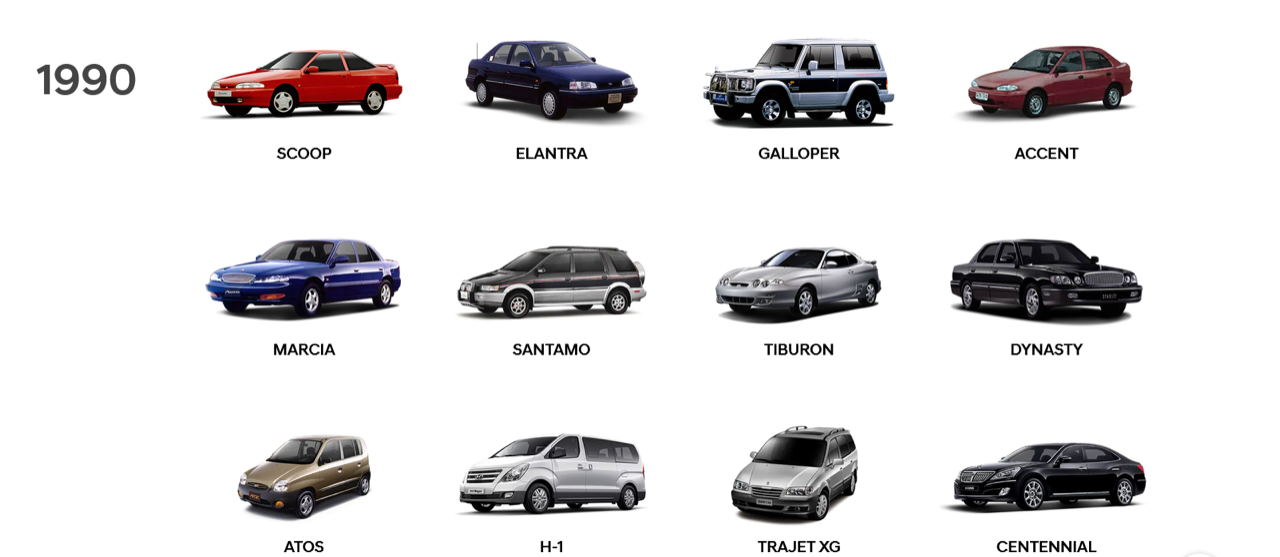 การขยายตัวของตลาดรถในยุคนั้น ทำให้ Hyundai มองหาลู่ทางในการสร้างรถรุ่นใหม่ๆ ที่ครอบคลุมตลาดมากขึ้น บางรุ่นอย่างเช่น Grandeur ซึ่งเป็นรถระดับเหนือ Sonata ขึ้นไปนั้น Hyundai ยังเลือกยืมรถ Mitsubishi Debonair มาแปะยี่ห้อของตัวเองขายอยู่เพื่อพยายามแทงกั๊ก Daewoo ซึ่งครองตลาดรถหรูคันโตของเกาหลีอยู่ในขณะนั้น ส่วนในตลาดระดับรถเล็ก ก็มีการพัฒนารถอย่าง Hyundai Excel ที่มีบอดี้ซีดาน กับแฮตช์แบ็ก 3 และ 5 ประตูออกมาแทน Pony เปลี่ยนเป็นระบบขับเคลื่อนล้อหน้าเพื่อความประหยัดน้ำมัน และตามด้วยรถคูเป้อย่าง Scoupe นอกจากนี้แล้ว Hyundai ยังลงทุนสร้างสำนัก Hyundai Design Center ในรัฐแคลิฟอร์เนีย เพื่อให้ทีมเกาหลี กับอเมริกันทำงานร่วมกัน และศึกษารสนิยม สไตล์ของลูกค้าอเมริกันได้ใกล้ชิดขึ้น ในภายหลังสำนักออกแบบนี้ ก็ย้ายไปอยู่ที่เมือง Irvine