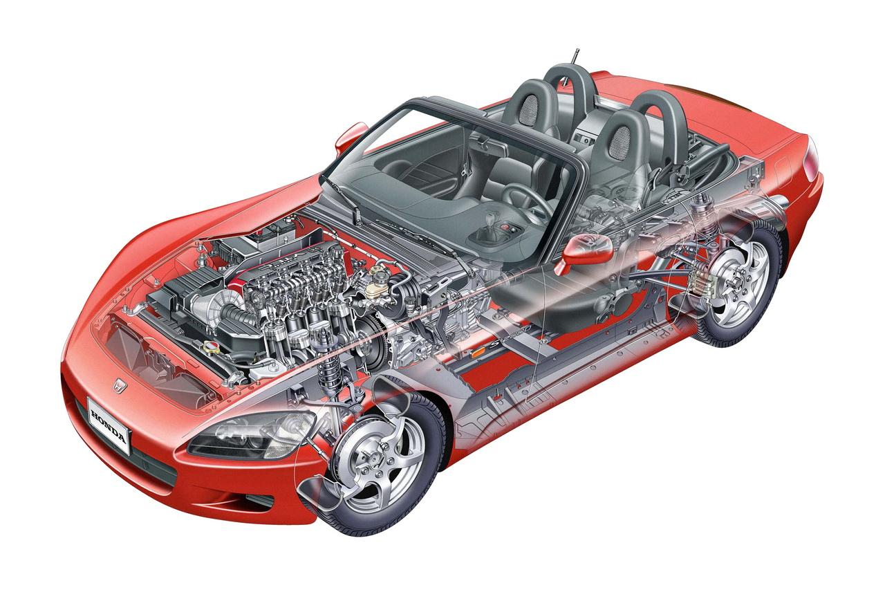 หัวใจของ S2000 ที่เป็นตัวบอกว่าใครสักคนจะซื้อหรือไม่ซื้อรถคันนี้ คือเครื่องยนต์ DOHC VTEC รหัส F20C ซึ่งคุณอย่าได้คิดว่ามันคือเครื่องยนต์ F-Series ที่คุ้นเคยจาก Accord ตาเพชร หรือ F20B VTEC จาก Accord ญี่ปุ่นที่จำหน่ายในช่วงเวลาใกล้เคียงกัน เพราะมันมีความเป็นญาติห่างกันมากๆ มากแบบญาติที่ไม่รู้จักว่าเป็นญาติกันมาก่อน แม้ว่าความจุโดยรวมจะ 1,997 ซี.ซี. เท่ากันแต่ได้มาจากขนาดกระบอกสูบที่แตกต่างกัน ในเครื่อง F20C ของ S2000 นั้น Honda ขยายปากกระบอกสูบให้กว้างขึ้น เพื่อให้สามารถติดตั้งวาล์วไอดี/ไอเสียที่มีขนาดโตกว่า และใช้ระยะชักก้านสูบสั้นลง 4 มม. เหลือ 84 มม. ซึ่งความยาวระยะชักนี้ มีผลอย่างมากสำหรับเครื่องใช้รอบสูง ถ้าเอาเครื่องชักยาวๆ มาลากรอบ 9,000 รอบ ก้านเกิ้นจะทนไม่ไหวพากันบินแหลกแหกมายิ้มแถวข้างเสื้อสูบหรืออ่างน้ำมันเครื่องเอา