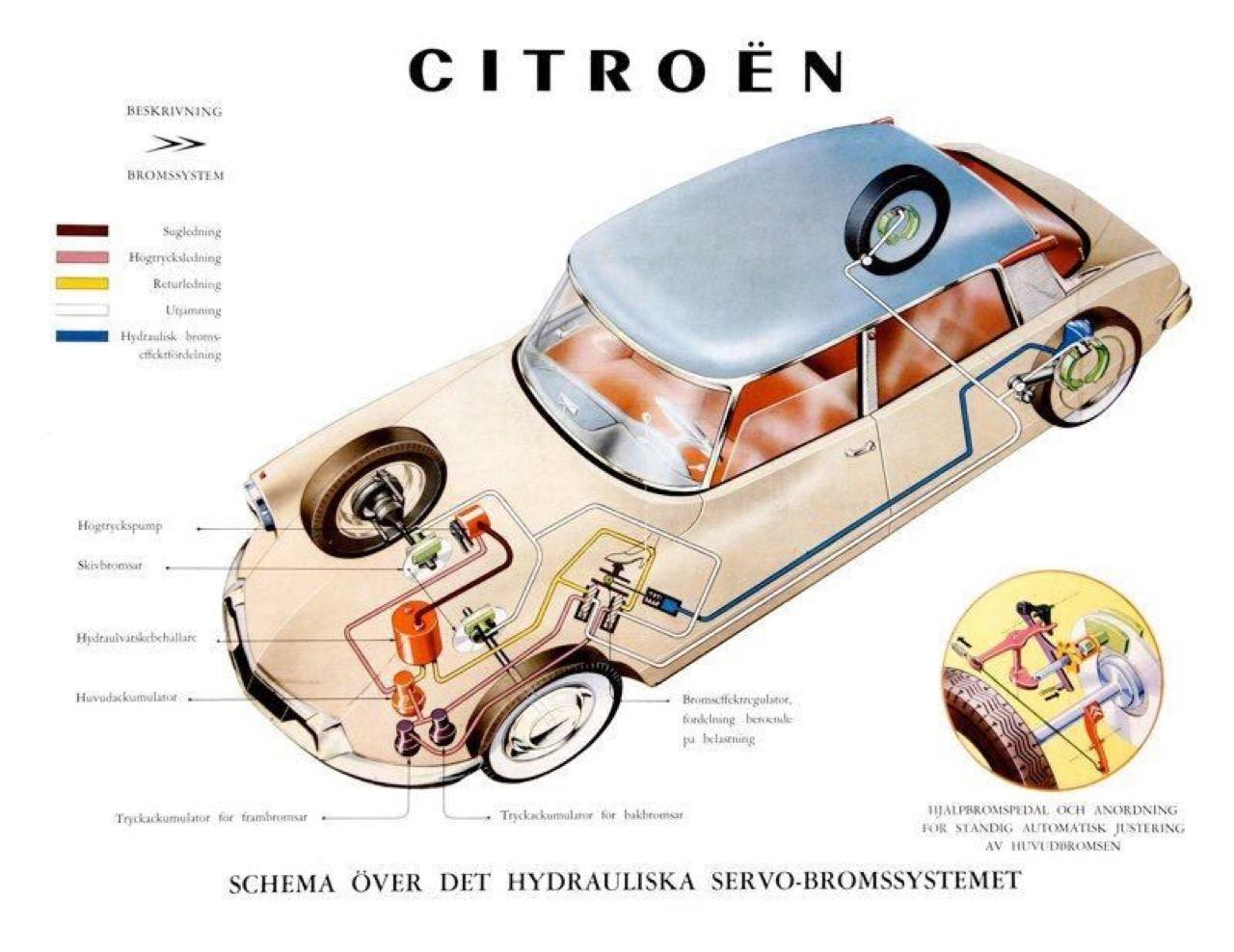 รถ Citroen โมเดล DS เปิดตัวเมื่อเดือนตุลาคม ปี 1955 ในงานแสดงรถยนต์ Paris Motor Show ทำเอาผู้คนในยุคนั้นแตกตื่นตกตะลึงด้วยเทคโนโลยีล้ำอนาคต ตัวถังของ DS ออกแบบโดยผ่านการขัดเกลาจากการทดสอบในอุโมงค์ลม เพื่อให้มันมีรูปร่างที่ถูกต้องตามหลักอากาศพลศาสตร์ ช่วงล่าง Hydropneumatic Suspension Explained ที่ยกตัวเองให้สูงขึ้นเมื่อวิ่งผ่านทางขรุขระ หรือลดระดับลงมาขณะทำความเร็วบนทางแบบไฮเวย์ นวัตกรรมระบบรองรับที่ก้าวไกลมีการติดตั้งระบบบังคับเลี้ยวแบบไฮดรอลิก ชุดส่งกำลังแบบกึ่งอัตโนมัติที่ไม่มีคลัตช์ เช่นเดียวกับระบบเบรกของรถยุคใหม่ในทุกวันนี้ รถ DS สามารถกดปุ่มสั่งเบรกได้เหมือนกับ BMW หรือ Mercedes Benz ในปัจจุบัน เจ้า Citroen โมเดล DS คือผู้บุกเบิกตัวจริงเสียงจริงคันแรกที่ใช้ระบบห้ามล้อแบบดิสก์เบรกทั้งสี่ล้อ