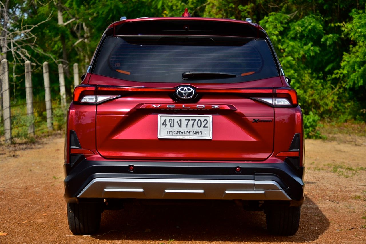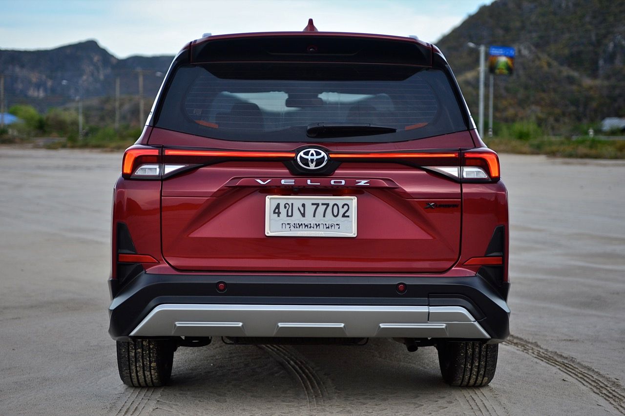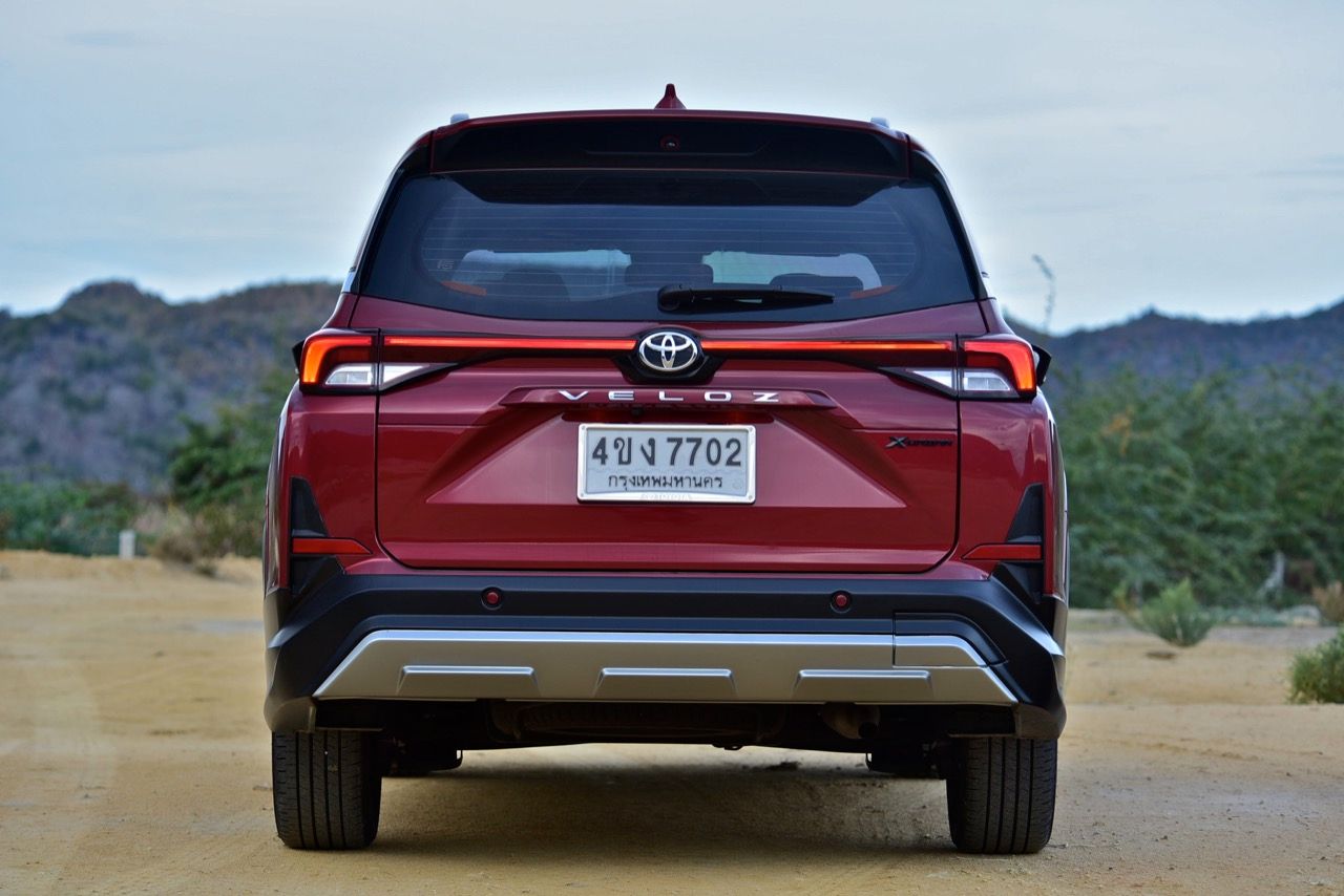 ส่วนท้ายที่เหมาะกับการใช้งาน แม้จะไม่มีฝาท้ายไฟฟ้า แต่พื้นที่เก็บสัมภาระเมื่อยังไม่ได้พับเบาะแถวหลังถือว่าให้มาพอสมควรแก่การบรรจุกระเป๋าเดินทางใบใหญ่ได้สองใบ หากไม่มีผู้โดยสารแถวหลังสุด เบาะแถวสาม เมื่อพับราบลงกับพื้น ห้องเก็บสัมภาระของ Veloz จะเพิ่มขึ้นอีกเพียบ จุดเด่นของบั้นท้ายอยู่ที่การออกแบบไฟท้าย LED กับขนาดของฝาท้ายที่ต้องเปิดด้วยมือโดยไม่มีระบบฝาท้ายไฟฟ้ามาให้ จุดเด่นของ Veloz ก็คือ พื้นที่เก็บสัมภาระเมื่อพับเบาะแถวที่สาม ไฟท้าย LED เชื่อมต่อกันทั้งสองฝั่งด้วยเส้นไฟท้ายเรียวเล็กและจะเรืองแสงในเวลากลางคืน ไฟเบรกดวงที่สาม หลอด LED อยู่ในกระจกฝาท้ายด้านบนบริเวณกึ่งกลางของกระจกบังลมบานฝาท้าย กระจกฝาท้ายมีขนาดใหญ่เพื่อเพิ่มความโปร่งโล่ง รวมถึงที่ปัดน้ำฝนด้านหลัง มุมของกันชนหลังทั้งสองข้างมีพลาสติกมัลติรีเฟกเตอร์ช่วยในเรื่องของการสะท้อนแสงเพื่อให้รถคันหลังมองเห็น ชายล่างของกันชนหลังตกแต่งด้วยพลาสติกสีเงิน