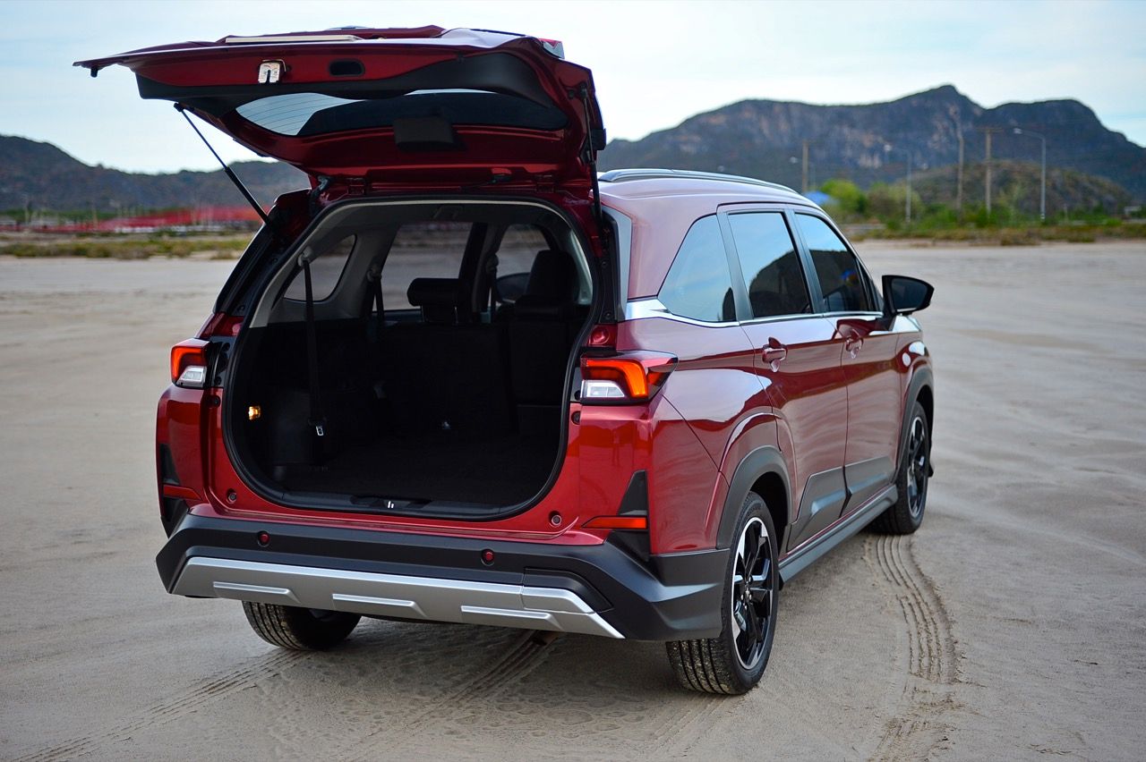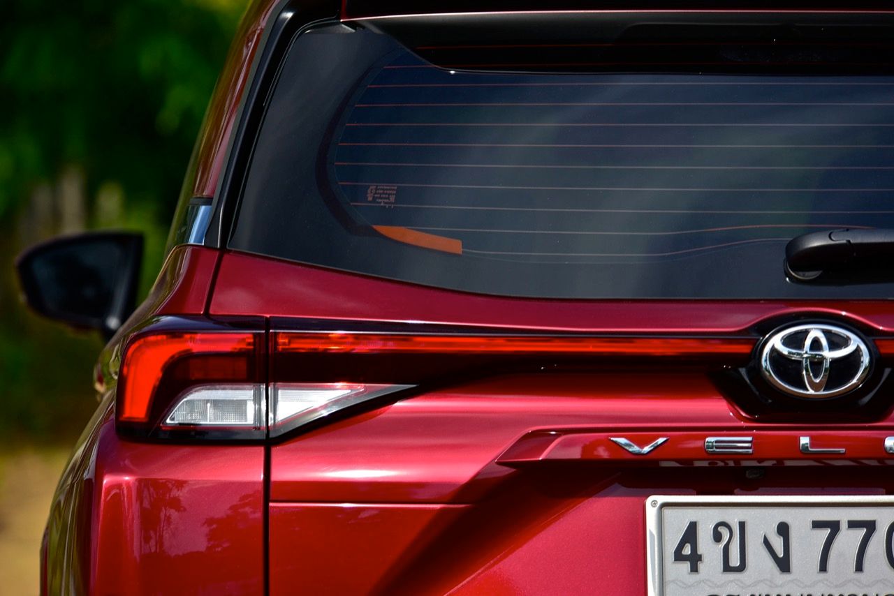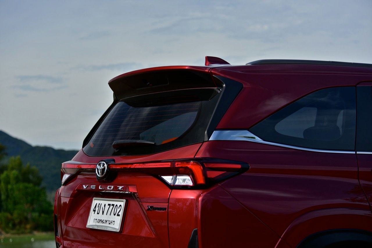 ส่วนท้ายที่เหมาะกับการใช้งาน แม้จะไม่มีฝาท้ายไฟฟ้า แต่พื้นที่เก็บสัมภาระเมื่อยังไม่ได้พับเบาะแถวหลังถือว่าให้มาพอสมควรแก่การบรรจุกระเป๋าเดินทางใบใหญ่ได้สองใบ หากไม่มีผู้โดยสารแถวหลังสุด เบาะแถวสาม เมื่อพับราบลงกับพื้น ห้องเก็บสัมภาระของ Veloz จะเพิ่มขึ้นอีกเพียบ จุดเด่นของบั้นท้ายอยู่ที่การออกแบบไฟท้าย LED กับขนาดของฝาท้ายที่ต้องเปิดด้วยมือโดยไม่มีระบบฝาท้ายไฟฟ้ามาให้ จุดเด่นของ Veloz ก็คือ พื้นที่เก็บสัมภาระเมื่อพับเบาะแถวที่สาม ไฟท้าย LED เชื่อมต่อกันทั้งสองฝั่งด้วยเส้นไฟท้ายเรียวเล็กและจะเรืองแสงในเวลากลางคืน ไฟเบรกดวงที่สาม หลอด LED อยู่ในกระจกฝาท้ายด้านบนบริเวณกึ่งกลางของกระจกบังลมบานฝาท้าย กระจกฝาท้ายมีขนาดใหญ่เพื่อเพิ่มความโปร่งโล่ง รวมถึงที่ปัดน้ำฝนด้านหลัง มุมของกันชนหลังทั้งสองข้างมีพลาสติกมัลติรีเฟกเตอร์ช่วยในเรื่องของการสะท้อนแสงเพื่อให้รถคันหลังมองเห็น ชายล่างของกันชนหลังตกแต่งด้วยพลาสติกสีเงิน