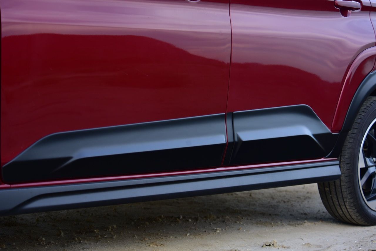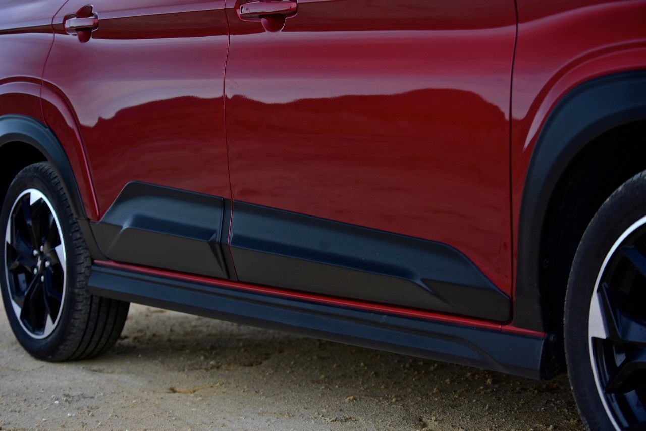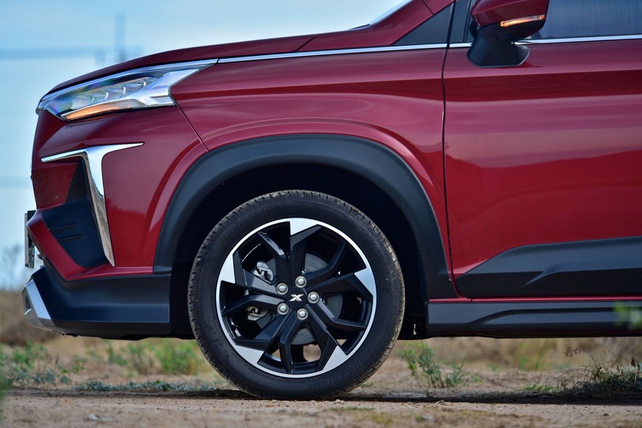 Veloz Premium รุ่นสูงสุด พร้อมชุดแต่ง X-Urban มองดูคล้ายกับรถเอ็มพีวีครอสโอเวอร์ที่ยกความสูงเพื่อการขับบนผิวทางที่ขรุขระ จุดประสงค์ก็คือการลุยน้ำท่วมและขับบนทางลูกรังได้โดยไม่ต้องกังวลเรื่องของความสูงจากพื้นถึงใต้ท้องรถ ระยะห่างจากพื้นถึงใต้ท้องอยู่ที่ 205 มิลลิเมตร สูงพอที่จะลุยน้ำท่วมขังที่อาจเกิดขึ้นได้เมื่อมีฝนตกหนัก เสาหน้ามีองศาของความลาดเอียงที่เชื่อมโยงกับผืนหลังคาได้อย่างสวยงาม แนวเส้นด้านข้างจากขอบของไฟหน้าผ่านแก้มข้างและมือจับที่เปิดประตู จนถึงขอบของไฟท้าย ซุ้มล้อมีการดึงโป่งออกมาด้านข้าง ล้ออัลลอย ขอบ 17 นิ้ว ยาง Bridgestone Turanza T005 A ไซส์ 205/50R17 เน้นความนุ่มนวลและมีเสียงรบกวนไม่มาก ล้อขอบ 17 นิ้วยังรองรับการใช้งานได้อย่างครอบคลุมเกือบจะทุกสภาพถนน ล้อที่มีขนาดไม่ใหญ่มากจนเกินไป ไม่กินกำลังเครื่องยนต์และทำให้ประหยัดเชื้อเพลิง แรคหลังคาสีเงินกับเสาอากาศทรงครีบฉลาม ฝาถังเชื้อเพลิงทรงกลมด้านซ้ายรองรับเชื้อเพลิง E20 ความจุถังเชื้อเพลิง 43 ลิตร น้ำมันเต็มถัง วิ่งได้ระยะทาง 400-450 กิโลเมตร เนื่องจากขนาดถังเชื้อเพลิงไม่ได้ใหญ่โตอะไร มิติตัวถังของ Toyota Veloz มีขนาดความยาว 4,475 มิลลิเมตร กว้าง 1,750 มิลลิเมตร สูง 1,700 มิลลิเมตร ความสูงนี่เองที่ให้ความรู้สึกโปร่งโล่ง สำหรับความยาวฐานล้ออยู่ที่ 2,750 มิลลิเมตร ความกว้างช่วงล้อ หน้า/หลัง 1,515 / 1,510 มิลลิเมตร ระยะห่างจากพื้นถึงใต้ท้องรถ 205 มิลลิเมตร มีรัศมีวงเลี้ยวแคบสุด 5.0 เมตร ถือว่ากระชับใช้ได้ไม่กว้างเกินไปจนทำให้ขาดความคล่องเวลายูเทิร์น