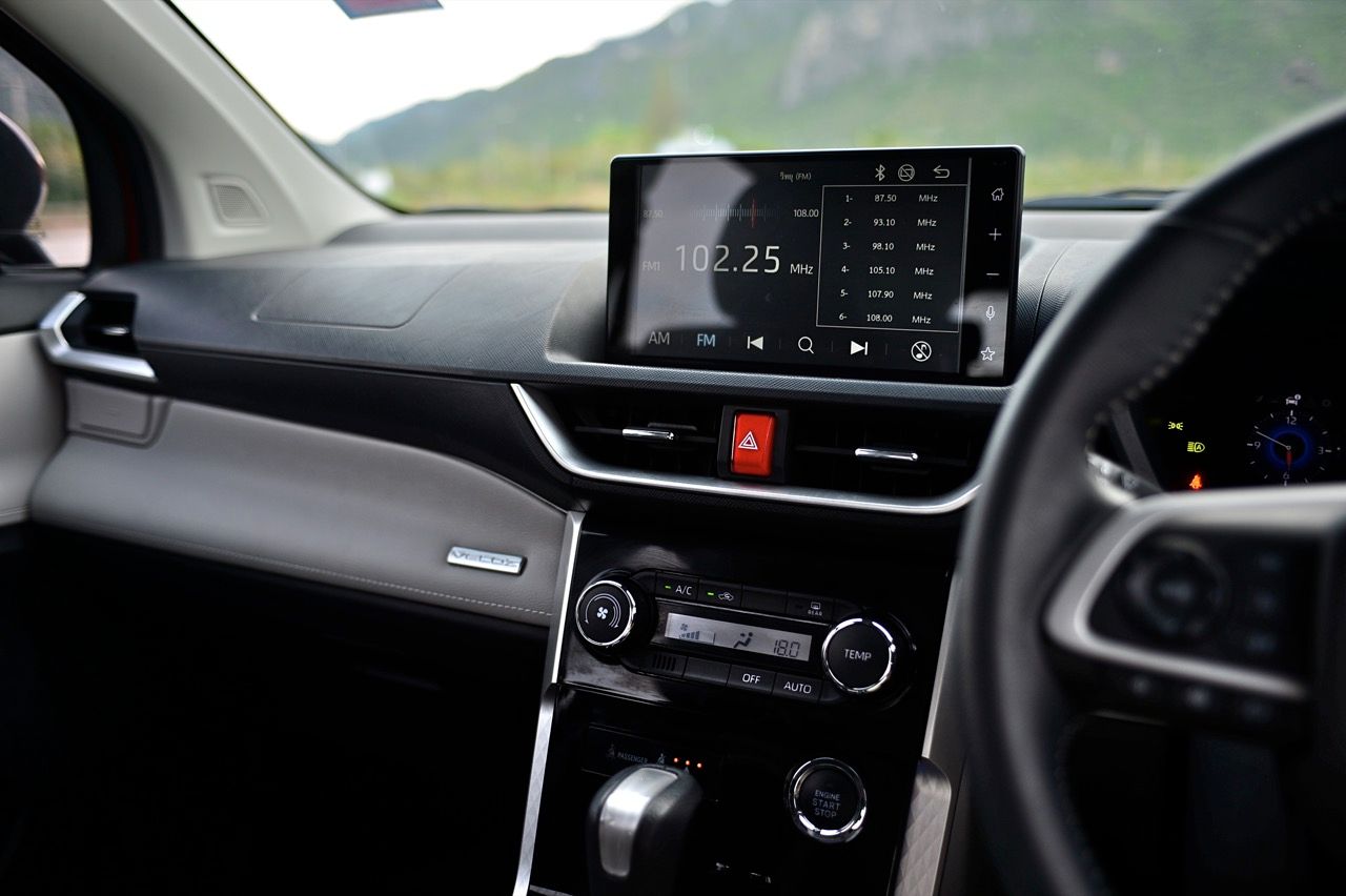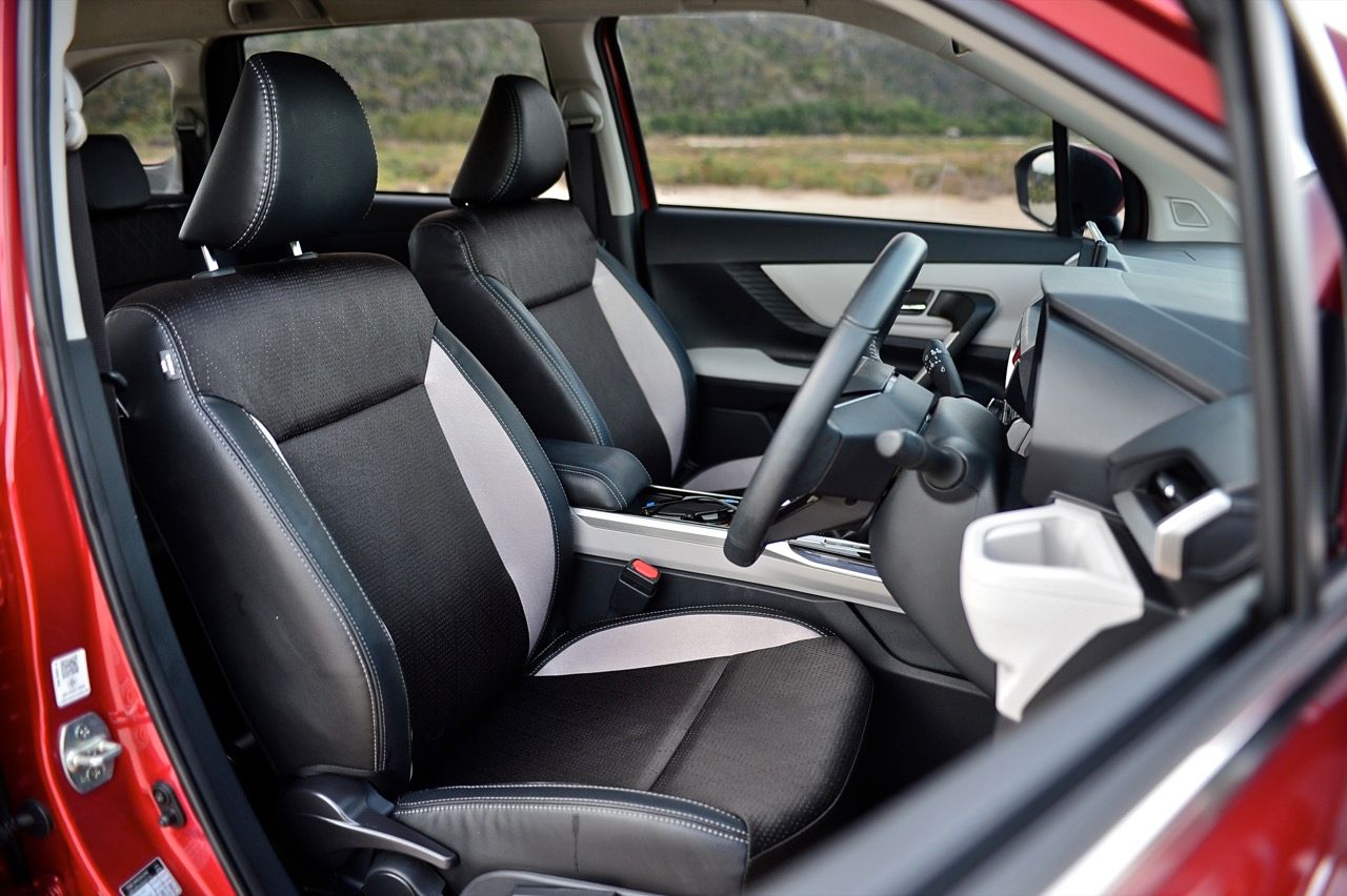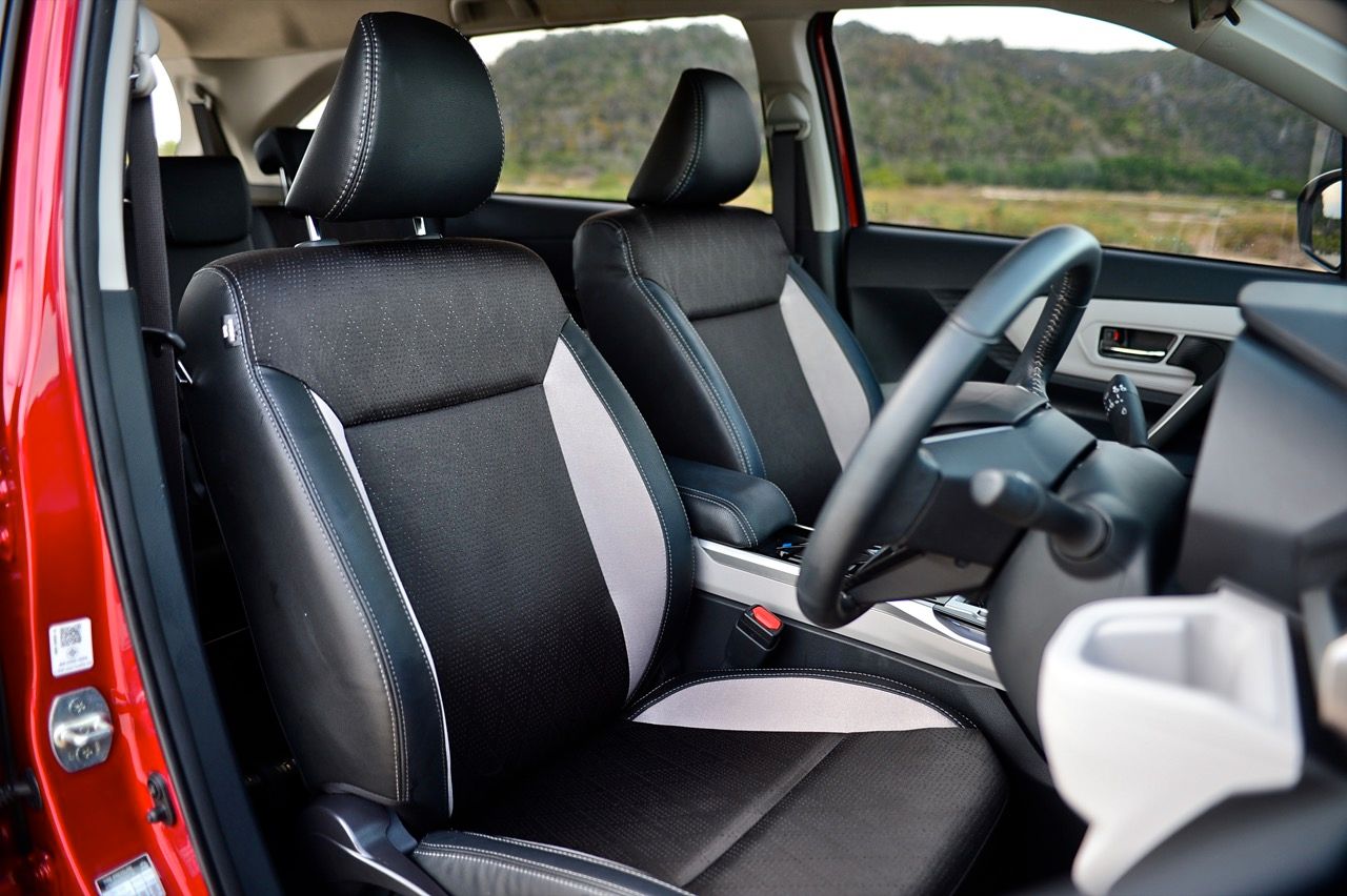 เบาะคนขับ ผู้โดยสารตอนหน้า เบาะแถวกลางและแถวที่สาม ทั้งหมด ปรับด้วยมือ เบาะหุ้มด้วยผ้าและหนังสังเคราะห์โทนสีขาว-ดำ สีทูโทนยังถูกใช้ในจุดต่างๆ เพื่อความสวยงาม แดชบอร์ดทรงทันสมัย แผงประตูตกแต่งด้วยไวนิล การวางตำแหน่งของจอภาพ ช่องใส่แก้วน้ำที่แดชบอร์ดคอนโซล ซุ้มเกียร์กั้นพื้นที่ระหว่างเบาะคู่หน้าโดยใช้ดีไซน์ที่เป็นสัดส่วนการใช้งานเฉพาะตำแหน่ง คันเกียร์หุ้มหนัง พร้อมฟังก์ชันการแปรผันแบบ 7 สปีดของชุดเกียร์อัตโนมัติ CVT เบรกมือไฟฟ้าและระบบ Auto Hold