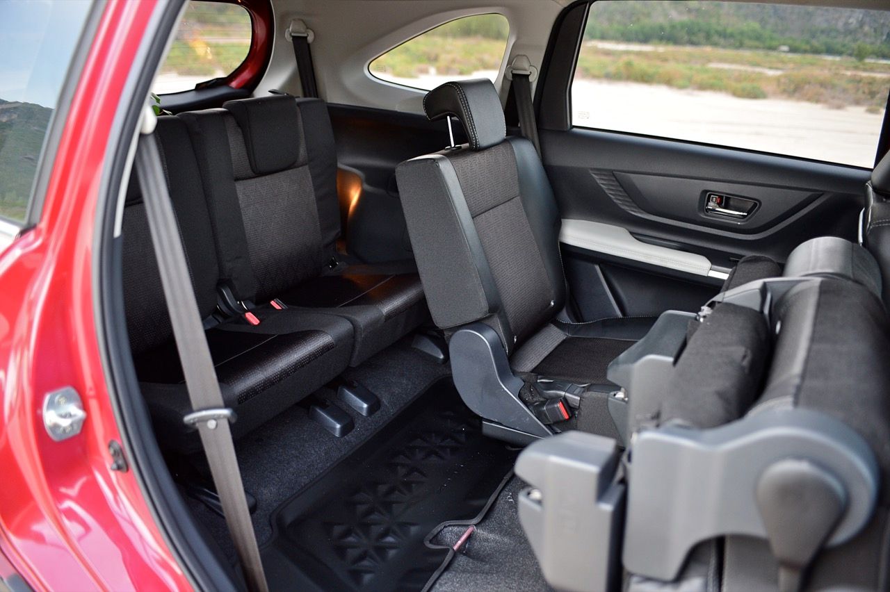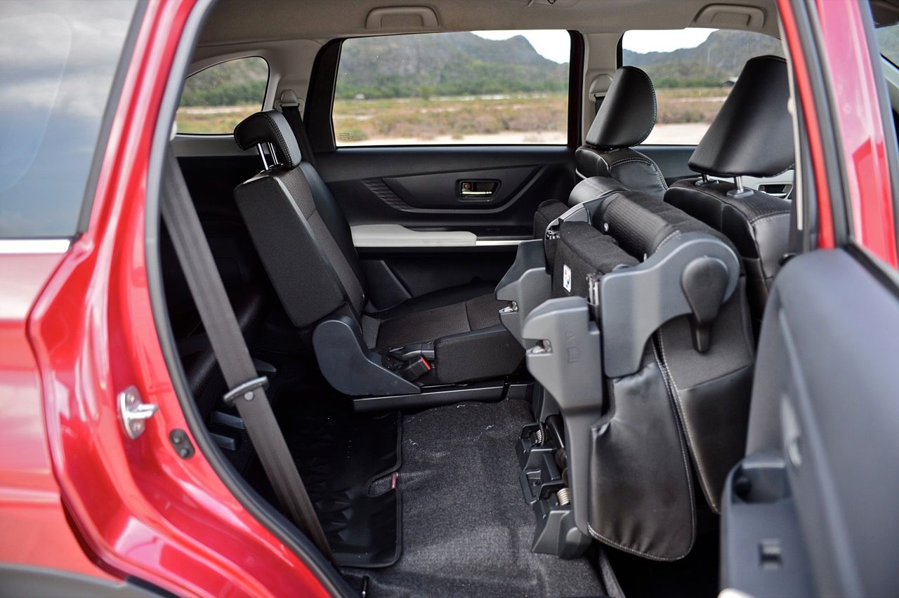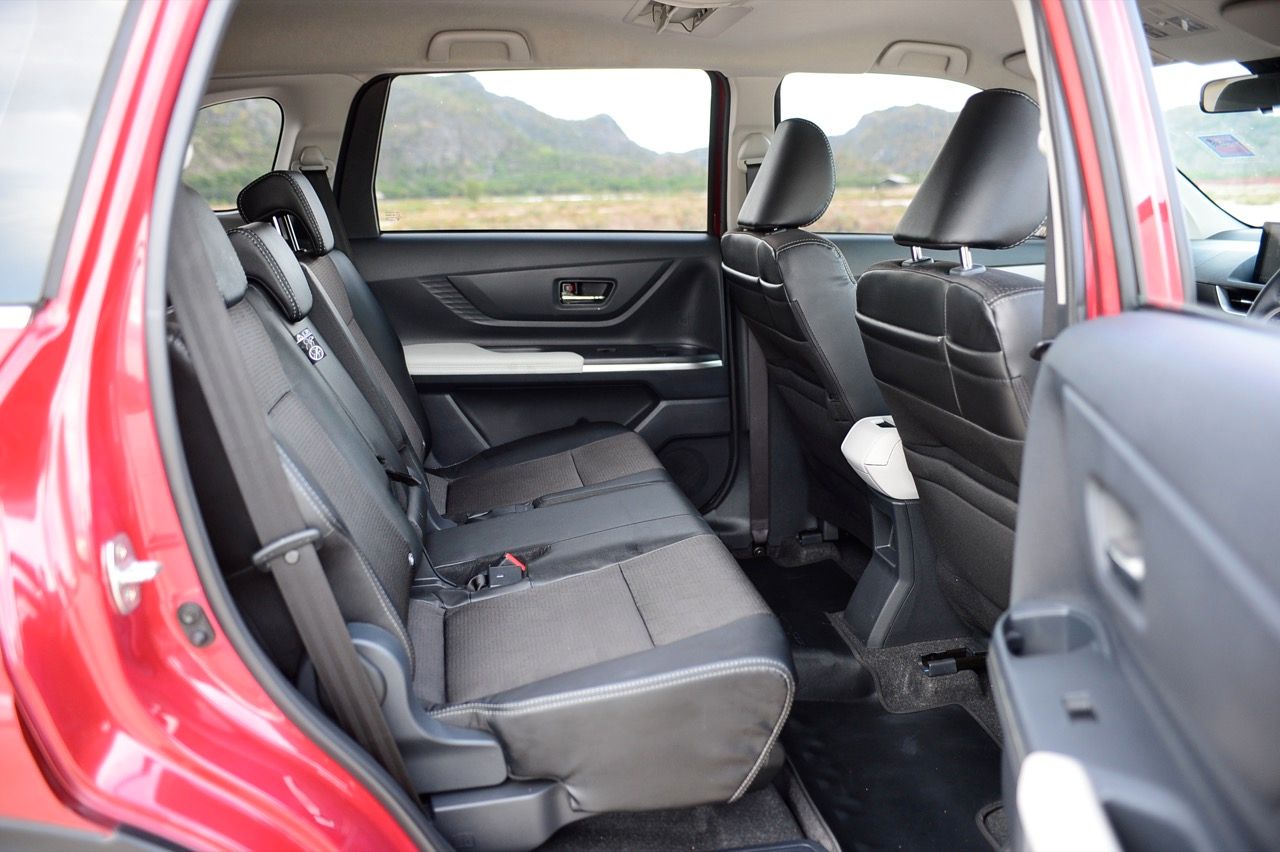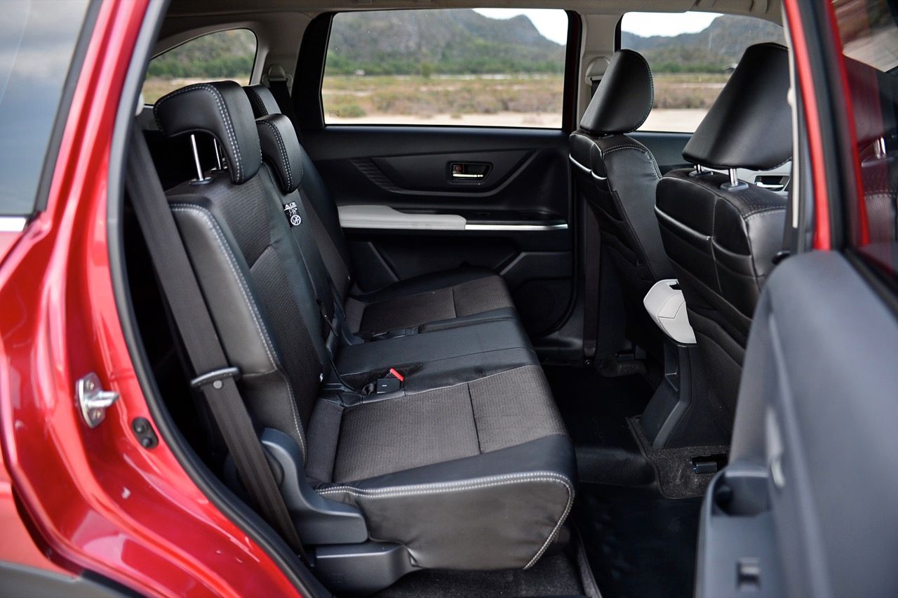 เมื่อมีผู้โดยสารถึง 6 คน เบาะแถวกลางหรือแถวที่สองออกแบบให้ปรับเอนได้เล็กน้อย เพื่อความสบายขณะเดินทางไกล ส่วนเบาะแถวสาม ค่อนข้างคับแคบเหมาะกับเด็กมากกว่าผู้ใหญ่ตัวโต เนื่องจาก พื้นที่วางขานั้นน้อยเกินไป หากเบาะแถวสองมีการปรับเอนเพื่อความสบายแผ่นหลัง พื้นที่วางเท้าของเบาะแถวสามก็จะยิ่งเหลือน้อยลงไปอีก ตำแหน่งของการนั่งโดยสาร แค่ 4-5 คนดูจะเหมาะสมและไม่สร้างความอึดอัดเมื่อต้องเดินทางไกล สำหรับระบบความปลอดภัย TSS เช่น ระบบรักษาช่องทางและช่วยดึงพวงมาลัยกลับเมื่อขับเข้าไปทับกับเส้นแบ่งช่องทางจราจรนั้นทำหน้าที่ได้ดี ระบบความปลอดภัยอื่นๆ เช่น ระบบช่วยออกตัวบนทางลาดชัน HAC ระบบช่วยเตือนมุมอับสายตาที่กระจกมองข้าง (Blind Spot Monitor) อันนี้ดีเลยสำหรับคนที่ไม่ค่อยจะระวังเวลาเปลี่ยนช่องทาง รวมถึงระบบช่วยเตือนขณะถอยรถ (Rear Cross Traffic Alert) ที่เหมาะกับการถอยจอดในที่คับแคบ ระบบความปลอดภัยก่อนการชน (Pre-Collision System) ส่วนระบบปรับไฟสูงอัตโนมัติ (Automatic High Beams) มีโอกาสได้ลองทดสอบบางช่วงของถนนไม่มีแสงไฟ ไฟอัตโนมัติของ Veloz Premium ทำงานเร็วใช้ได้และลดไฟสูงทันทีที่วิ่งเข้าไปใกล้กับท้ายรถคันหน้าหรือมีรถแล่นสวนทางมา