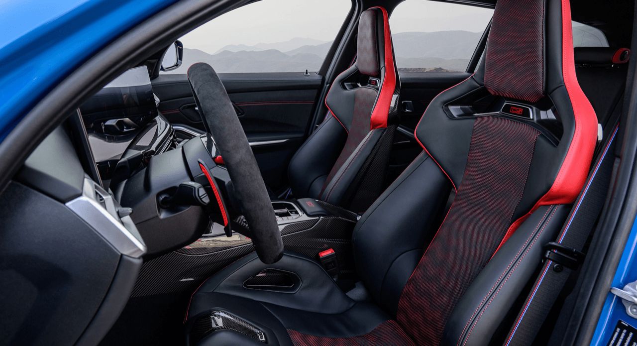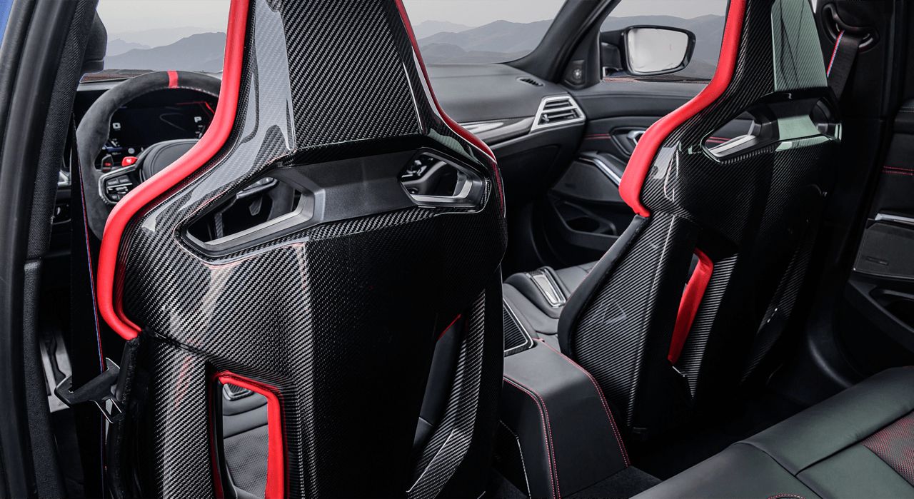 เบาะนั่งบักเก็ตคาร์บอน M ลดน้ำหนักได้อีกนิดหน่อย ลูกค้าไฮโซไม่ชอบเบาะปรับมือ น้ำหนักของเบาะไฟฟ้าแม้จะทำจากคาร์บอนแต่ก็ยังหนักอยู่ดี มีการเพิ่มแรงดึงดูดใจสำหรับการอัดเร็วๆ ในสนามแข่ง สำหรับลูกค้า M ที่ชอบเสียงเครื่องเสียงท่อเร้าๆ BMW M ติดตั้งระบบไอเสียเฉพาะรุ่นให้กับ CS แวกอน มีท่อเก็บเสียงด้านหลังทำด้วยโลหะเบาไททาเนียม ท่อไอเสียสีดำด้านสี่ท่อซึ่งถือว่าทำให้ส่วนท้ายดูดุดันขึ้นอีกเพียบ